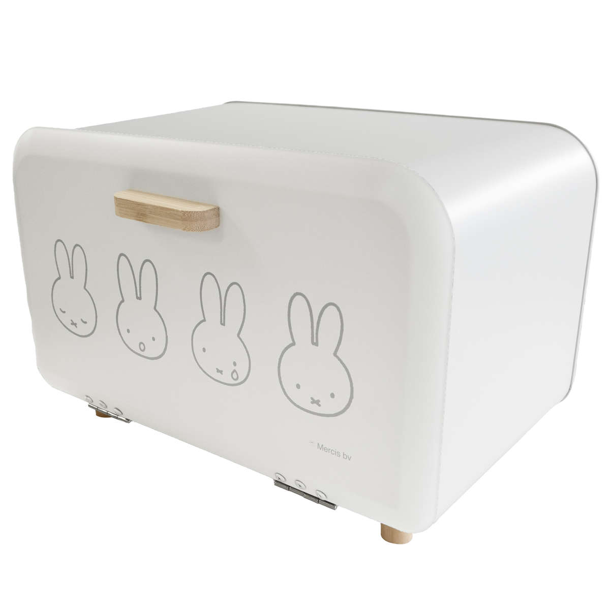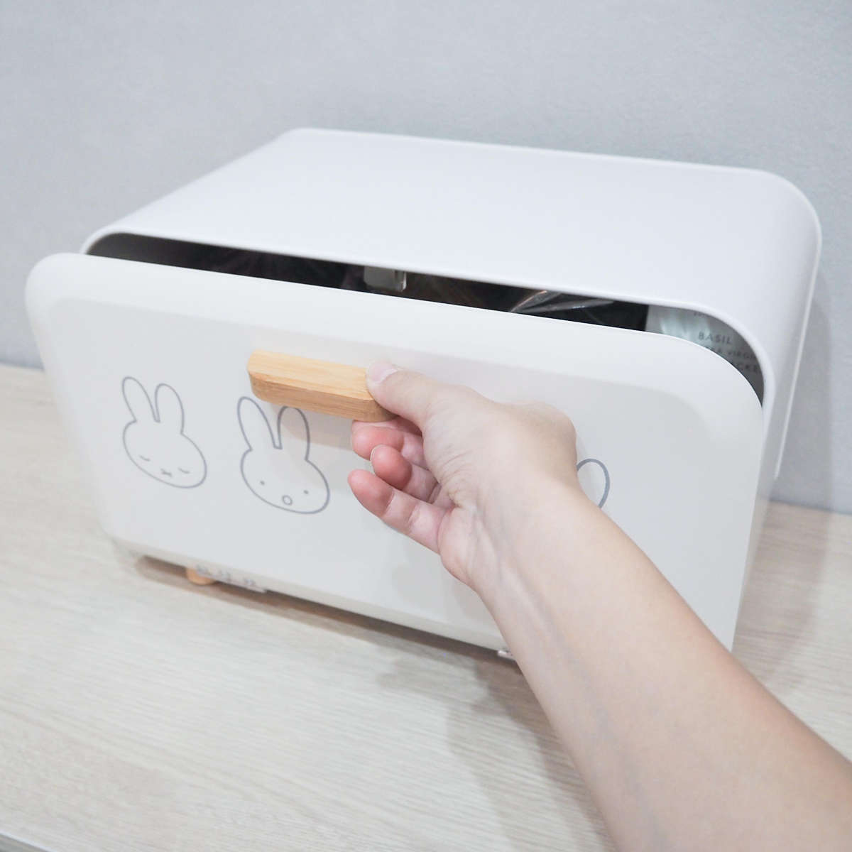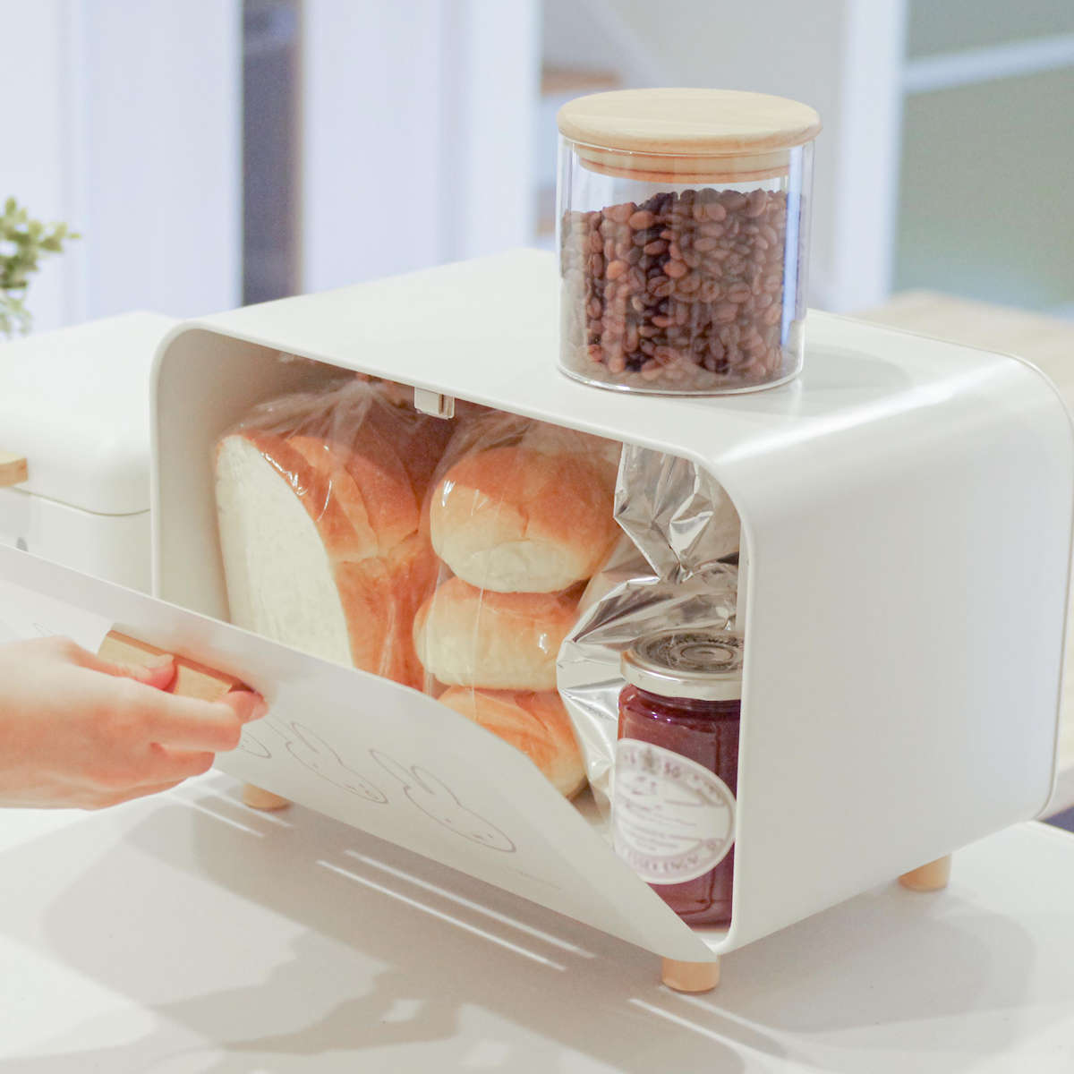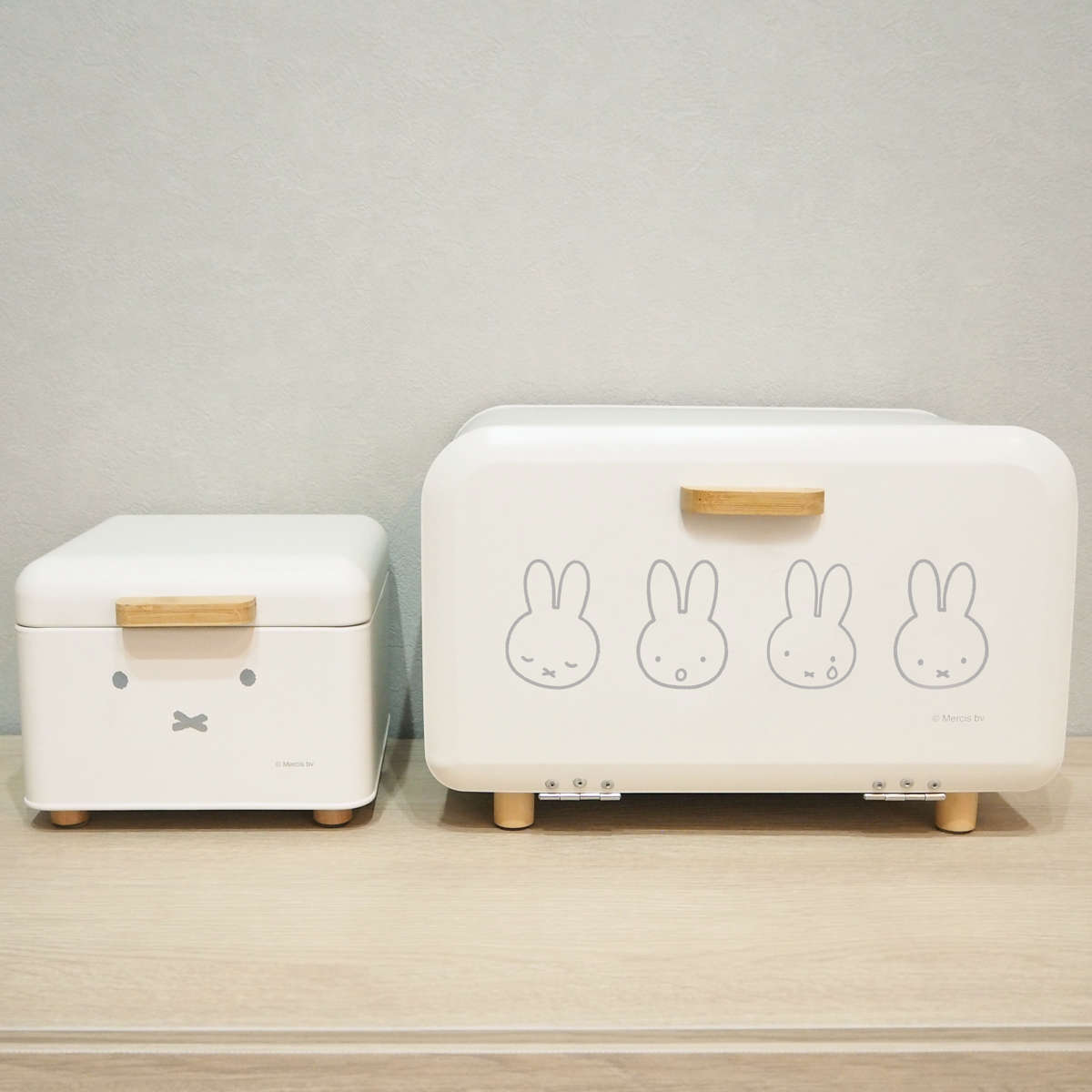 パンやお菓子など生活感が出やすいキッチン周りをスッキリ片付けられるブレッドケースです。優しいカラーのミッフィーフェイスと、脚の天然木×ホワイトのナチュラルな配色で、インテリアに馴染みやすいデザインです。