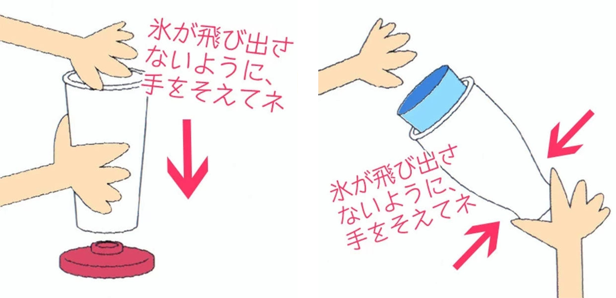 容器下部を両側からゆっくりと押し、氷を取り出します。