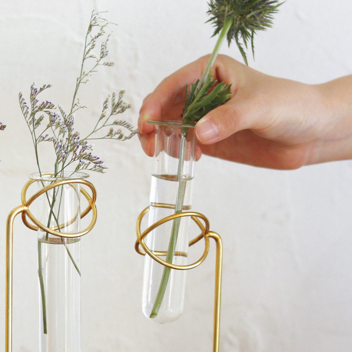 試験管のような形をしたガラスベースのスタンド型フラワーベースです。道端や庭先で摘んだ野花をサッと入れるだけで様になってくれるので、お花初心者の方にもおすすめです。