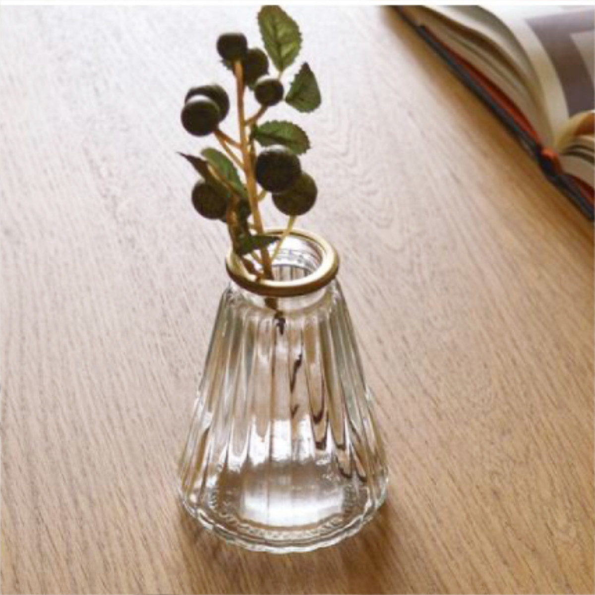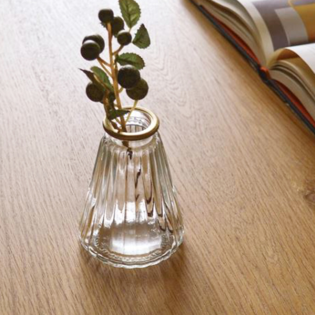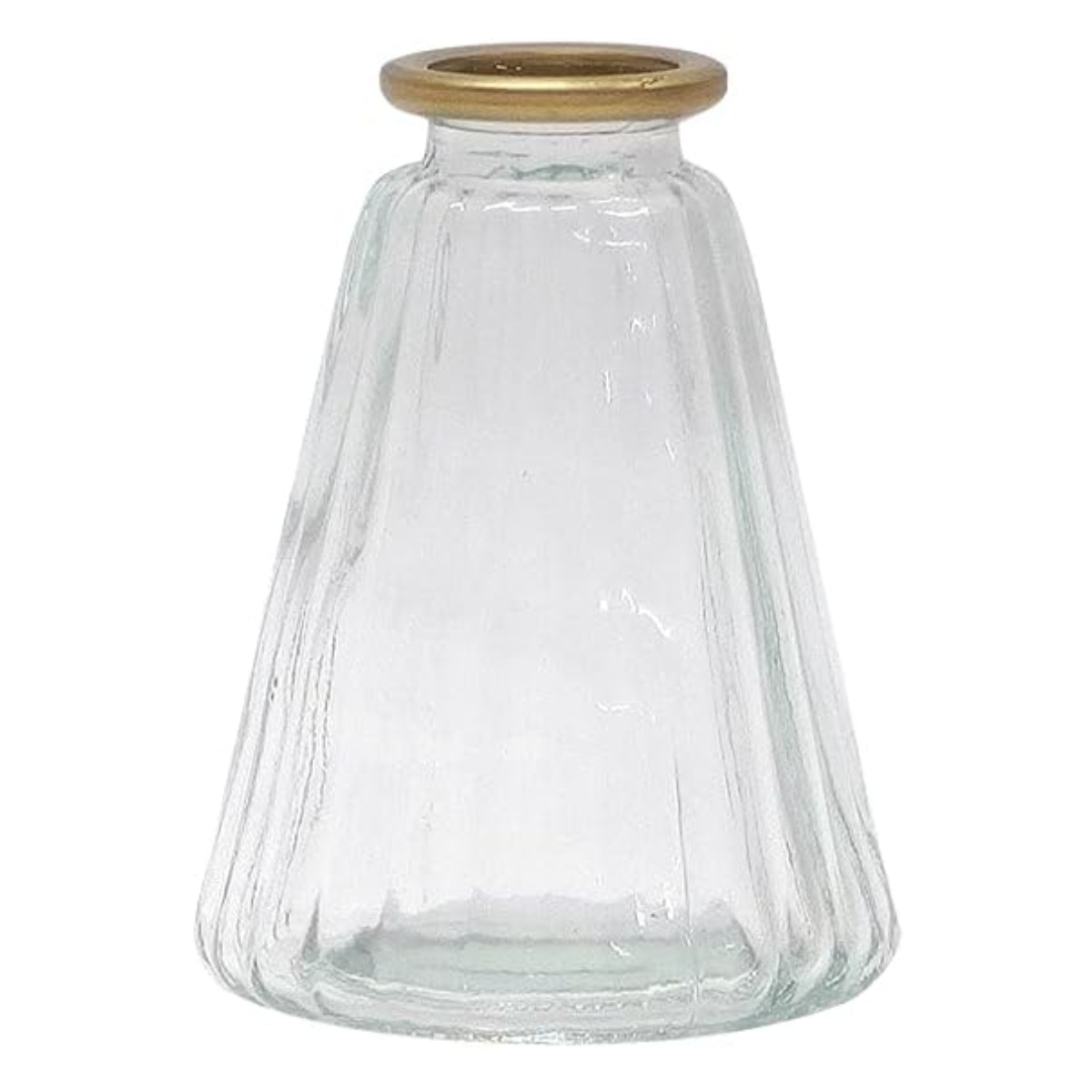 ゴールドの縁取りが上品なシンプルグラスベース。一輪挿しや、ちょっとしたフラワーアレンジにぴったりのサイズです。