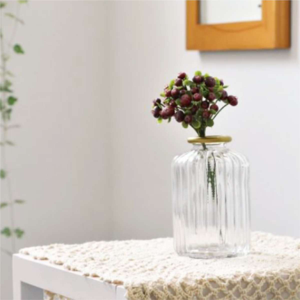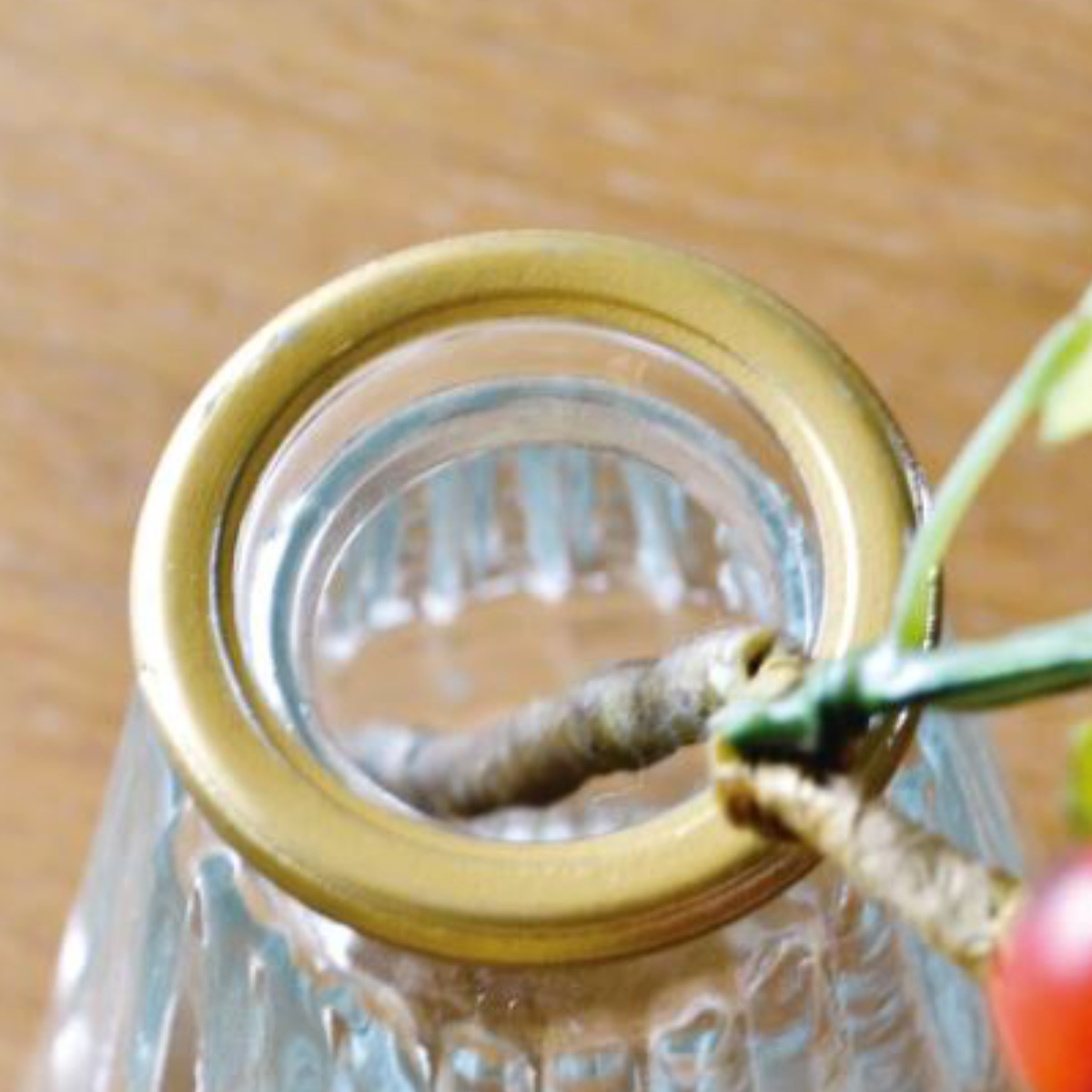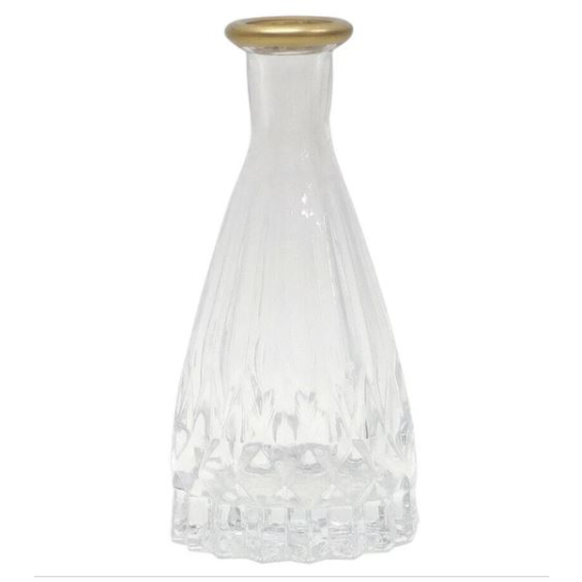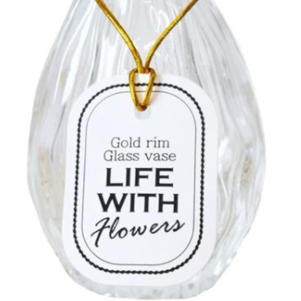 ゴールドの縁取りが上品なシンプルグラスベース。一輪挿しや、ちょっとしたフラワーアレンジにぴったりのサイズです。