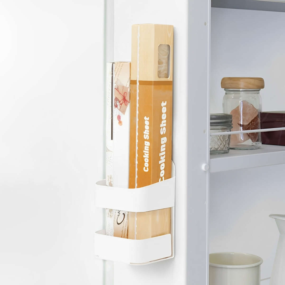 食品ラップやスプレーなど縦に長い物が前に倒れにくくなっています。ハサミや文具など、よく使う物をまとめて置くのも便利です。