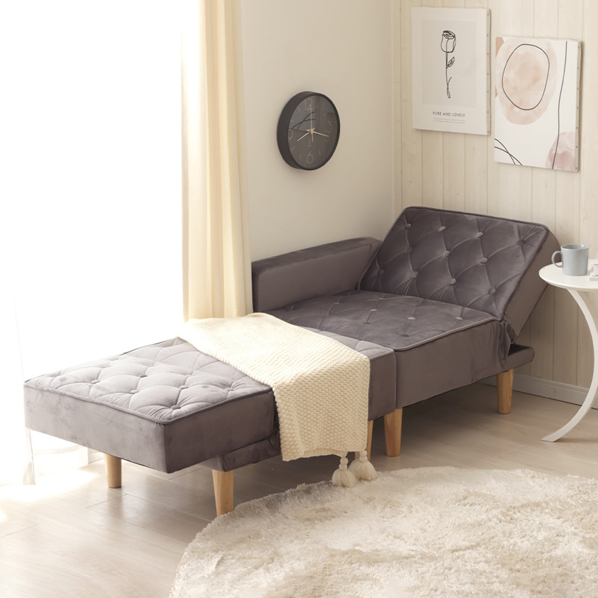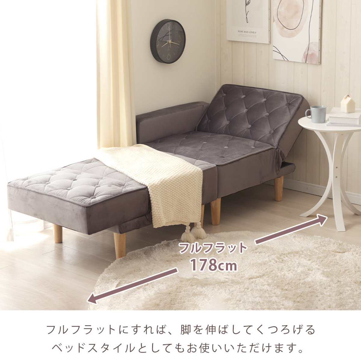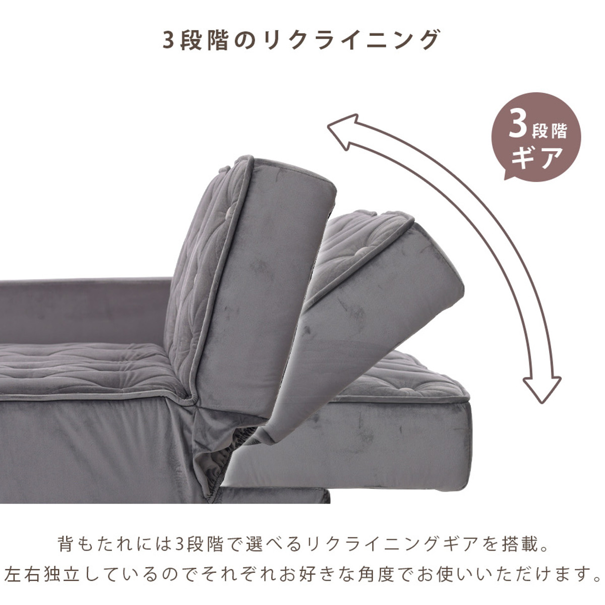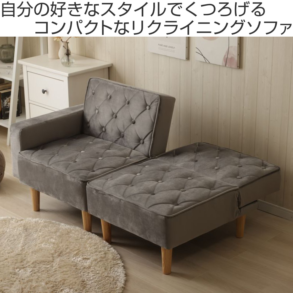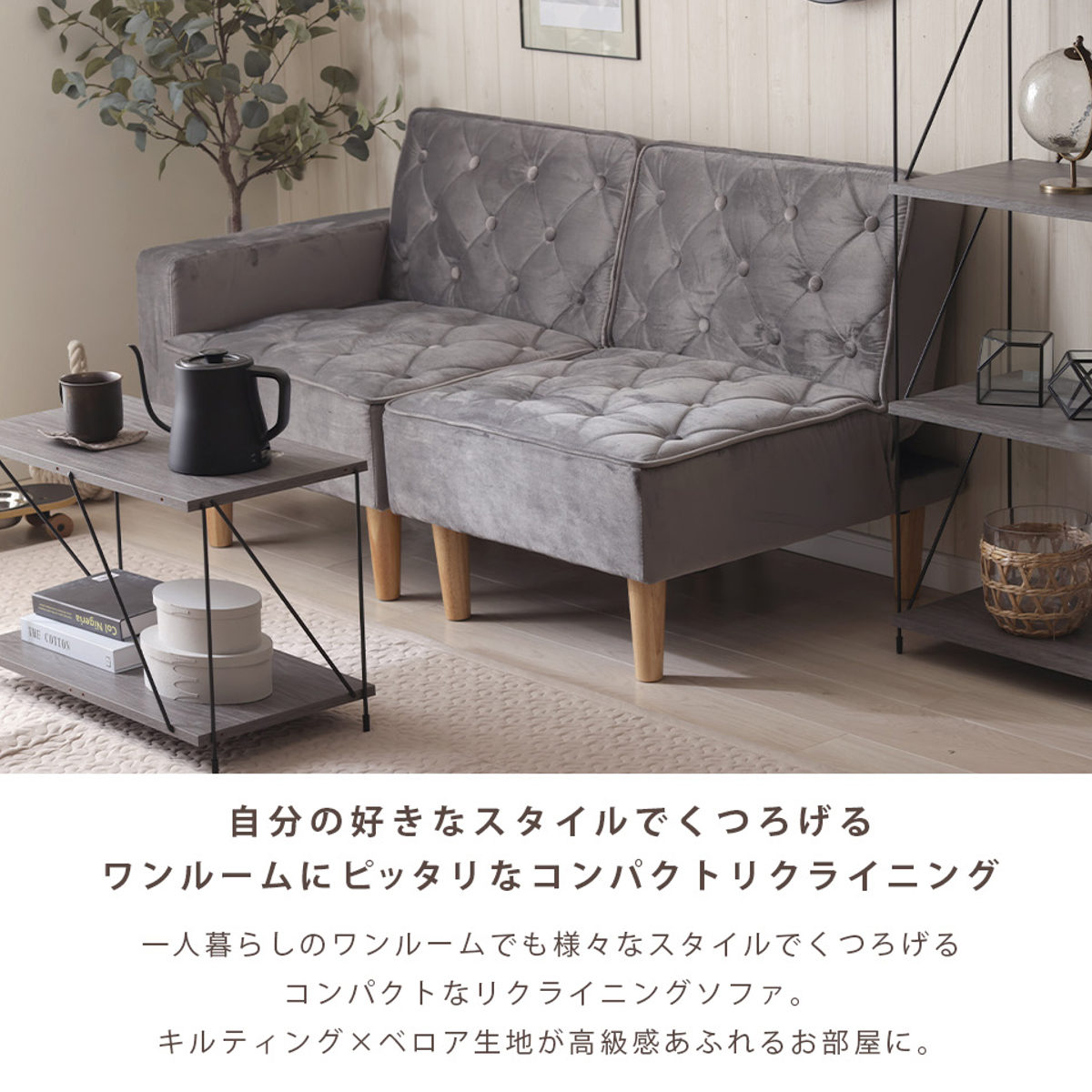 自分の好きなスタイルでくつろげるリクライニングソファです。コンパクトなサイズで一人暮らしのワンルームにおすすめです。キルティング×ベロア生地で高級感あふれる空間になります。