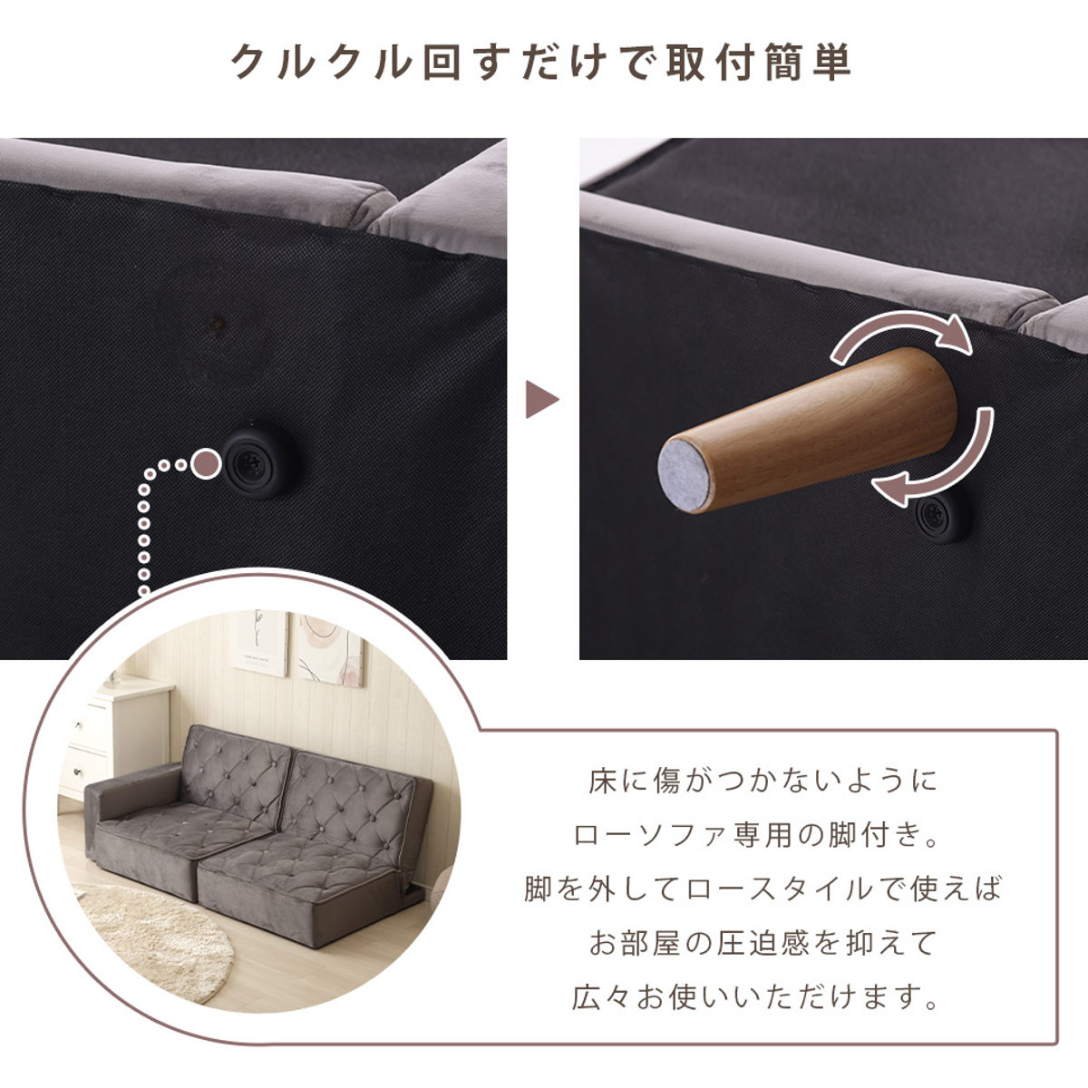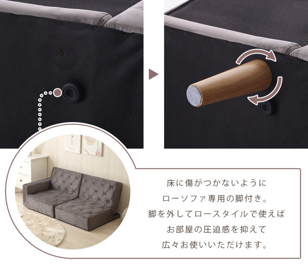 床に傷がつかないようにローソファ専用の脚付きです。脚を外してロースタイルで使えば、お部屋の圧迫感を抑えて広々お使いいただけます。