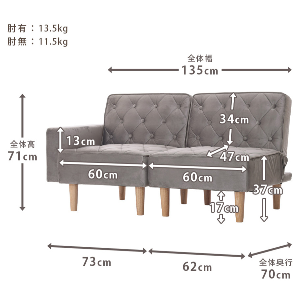 | サイズ | 座面高:約 37(cm) 肘有:幅73×奥行70×高さ71(cm) 肘無:幅62×奥行70×高さ71(cm) |
