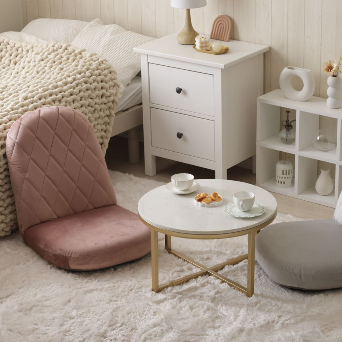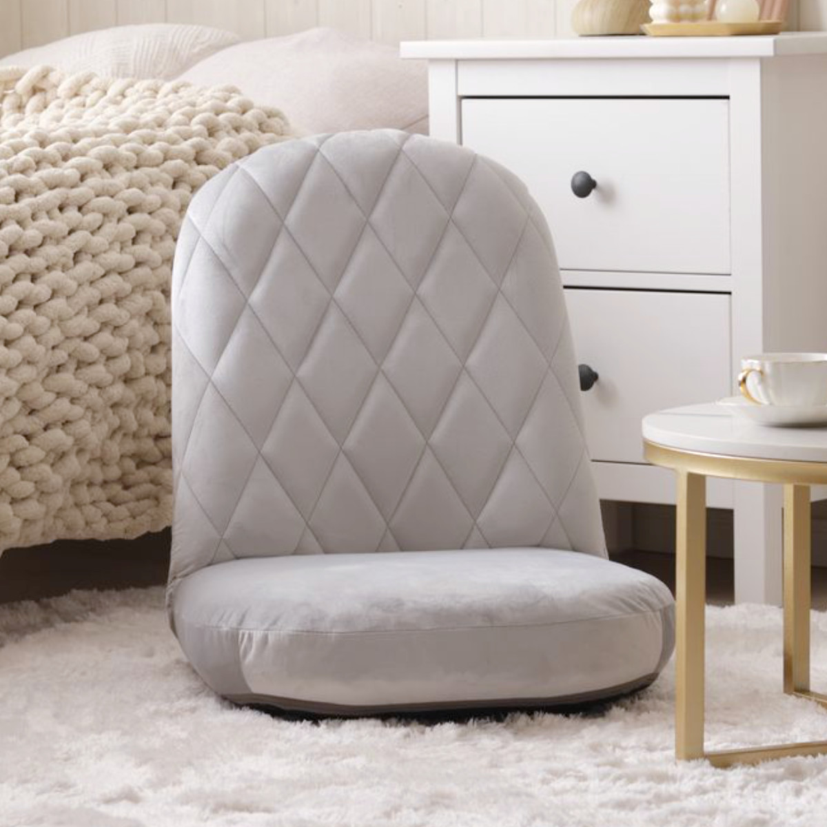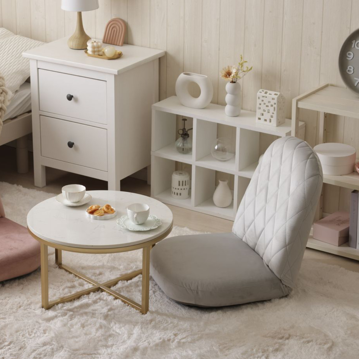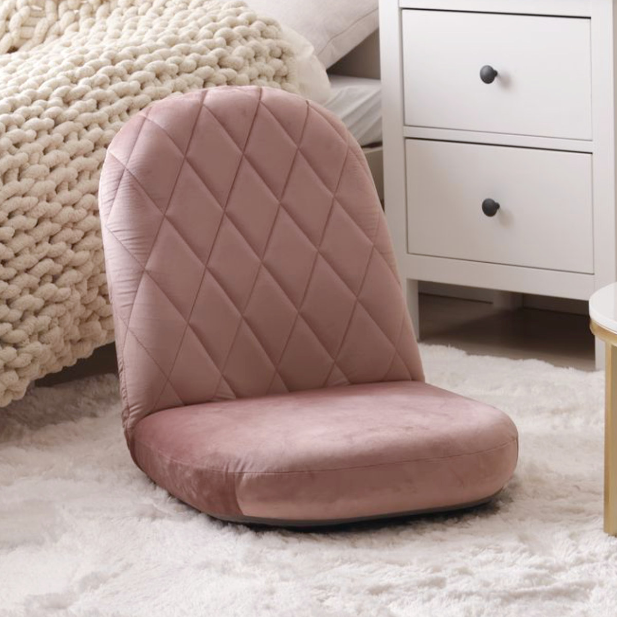 女の子らしいお部屋づくりに効果的なファンシーデザインのフロアチェアです。背もたれにはダイヤステッチが入っており、可愛さを引き立てます。コンパクトなので、好きな時に好きな場所へ移動ができます。生活スタイルにあわせてお使いください。