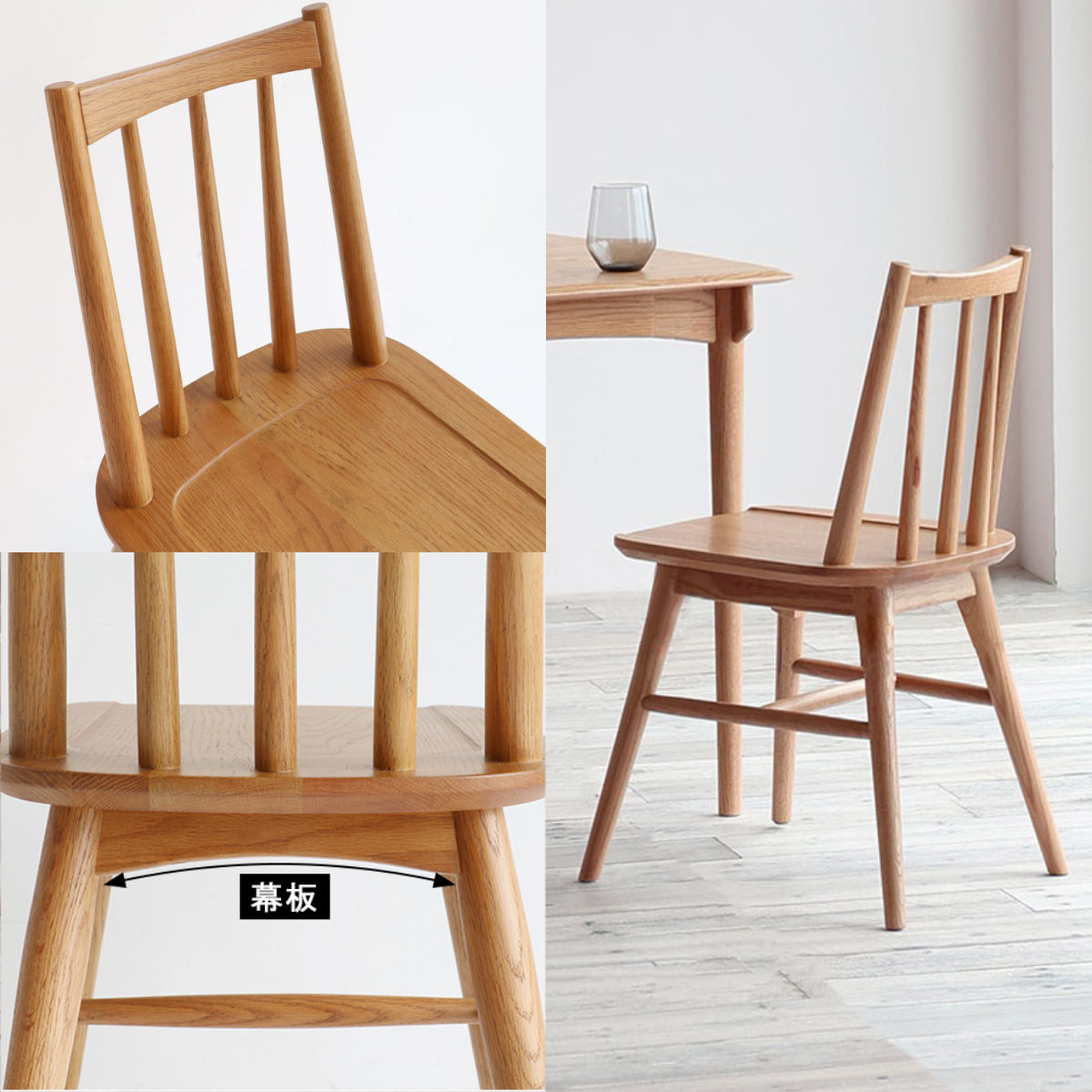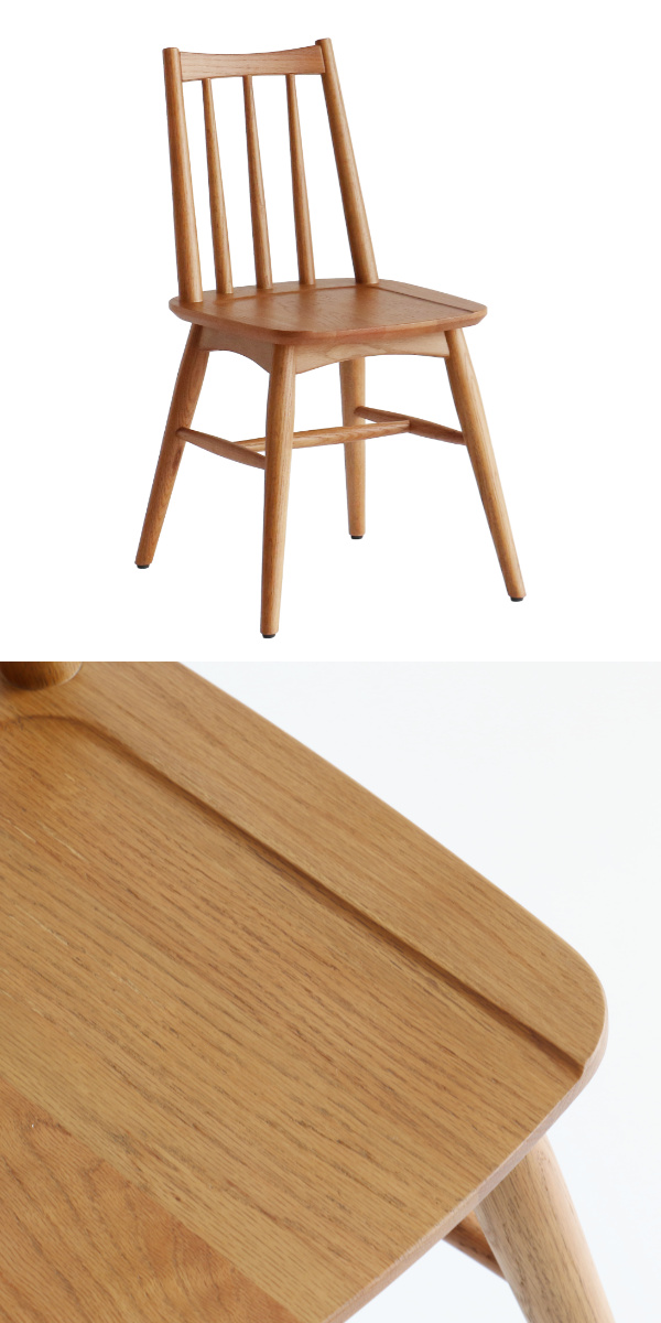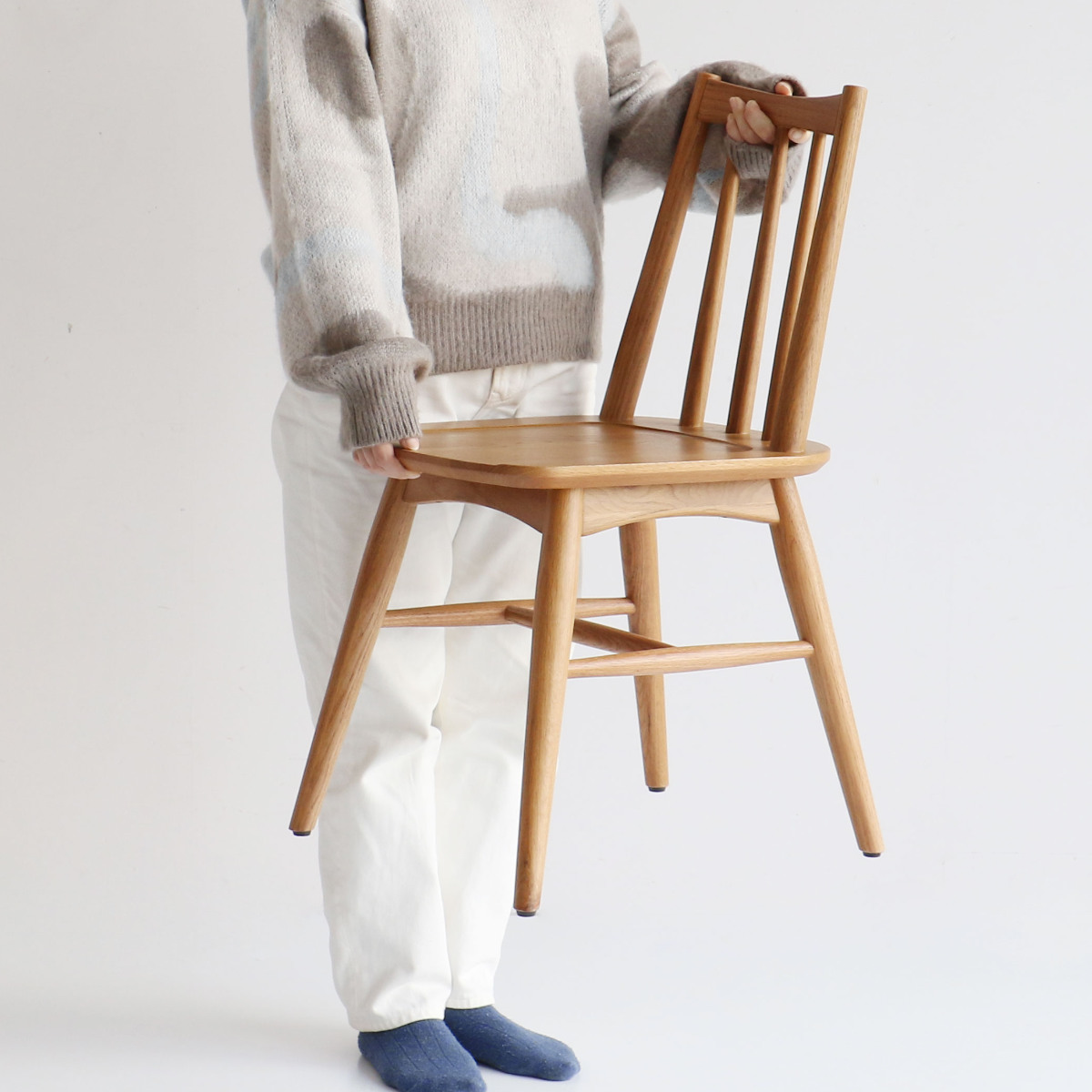 ウィンザー調のデザインが軽やかで美しいダイニングチェアです。背もたれ、座面下の幕板の形状に意匠を取り入れデザインのアクセントに。同シリーズのダイニングテーブルとの親和性を高める、曲線形状です。