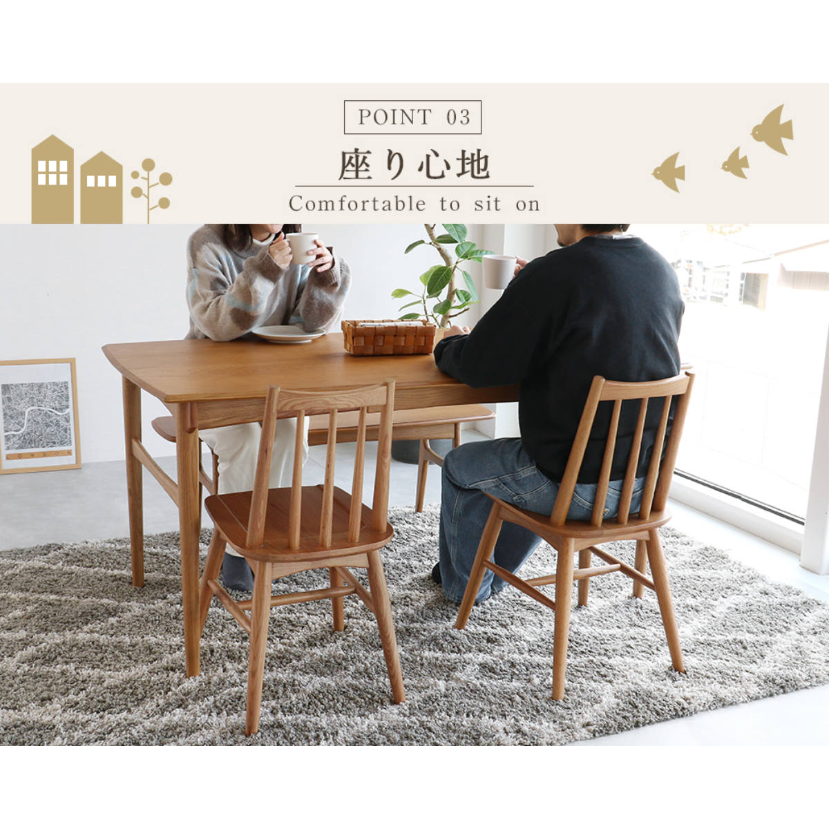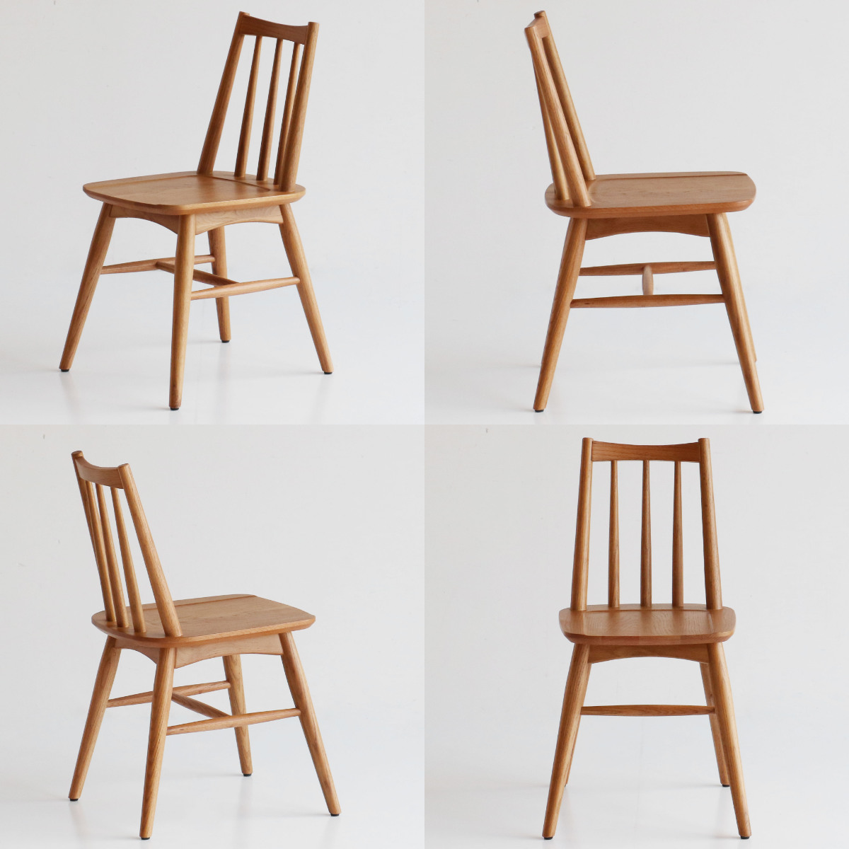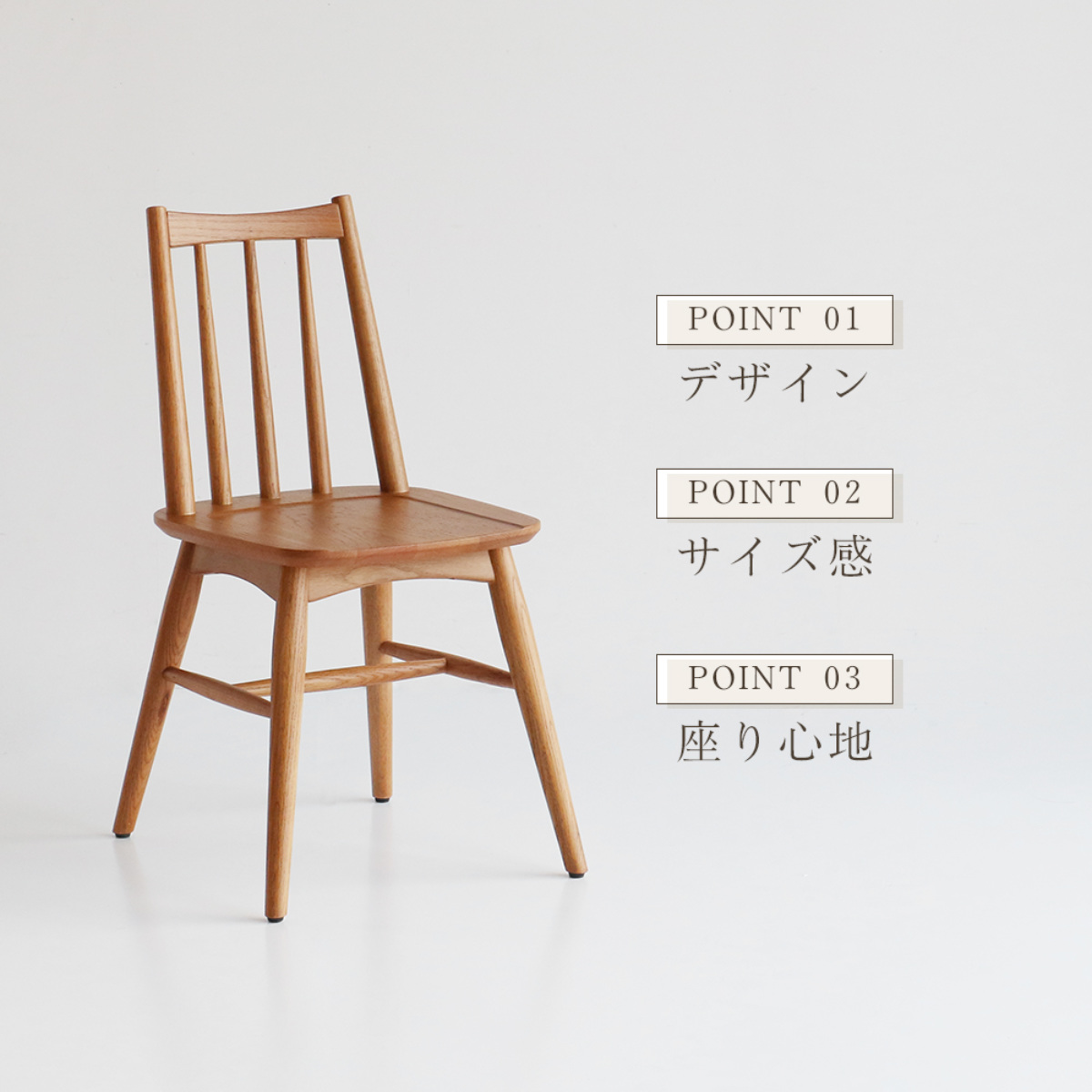 ウィンザー調のデザインが軽やかで美しいダイニングチェアです。背もたれ、座面下の幕板の形状に意匠を取り入れデザインのアクセントに。同シリーズのダイニングテーブルとの親和性を高める、曲線形状です。
