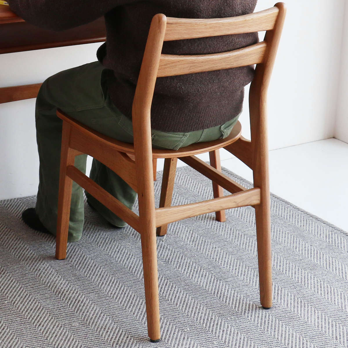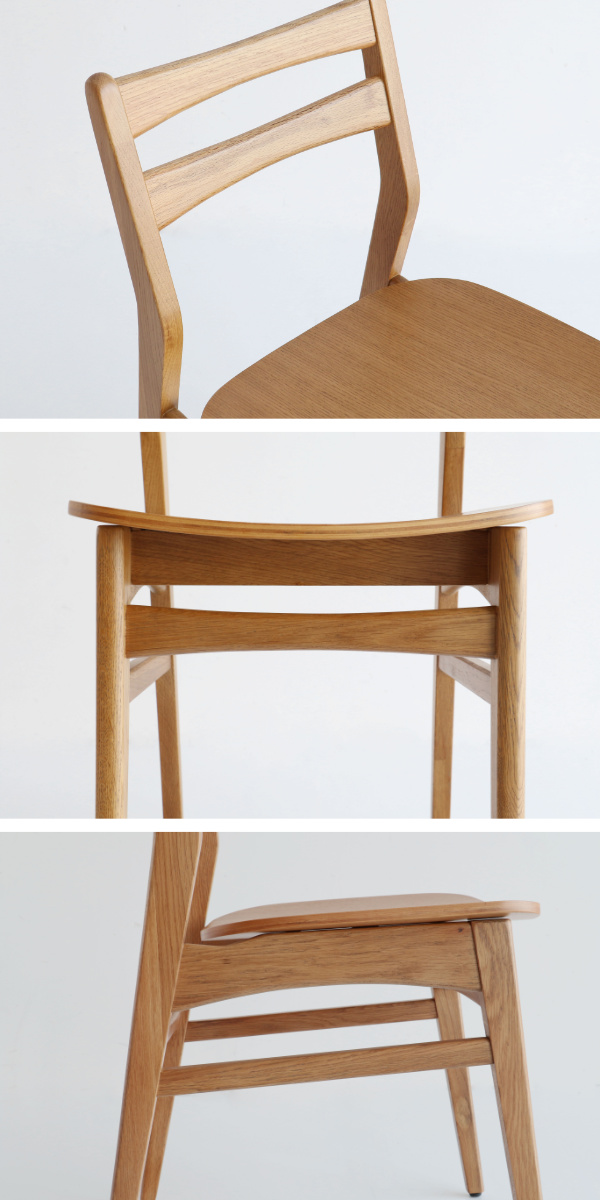 背もたれに適度な空間を設けることでスッキリとした印象です。背もたれはオーク無垢材から削り出し、滑らかな手触りに仕上げています
