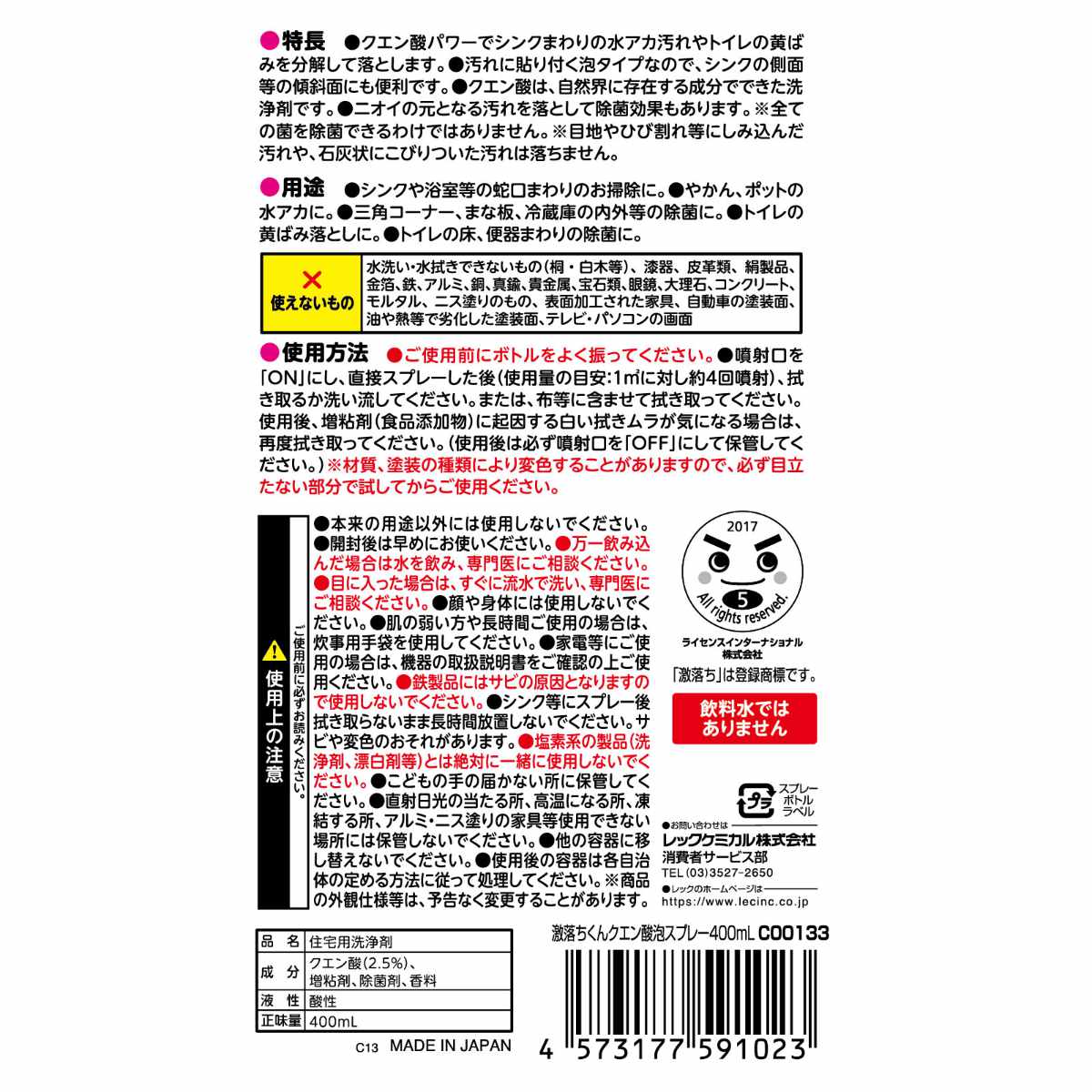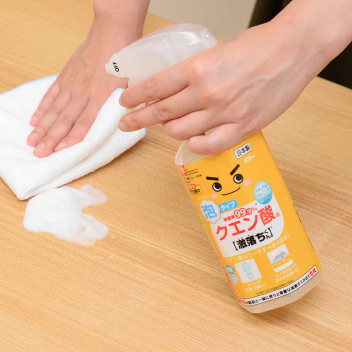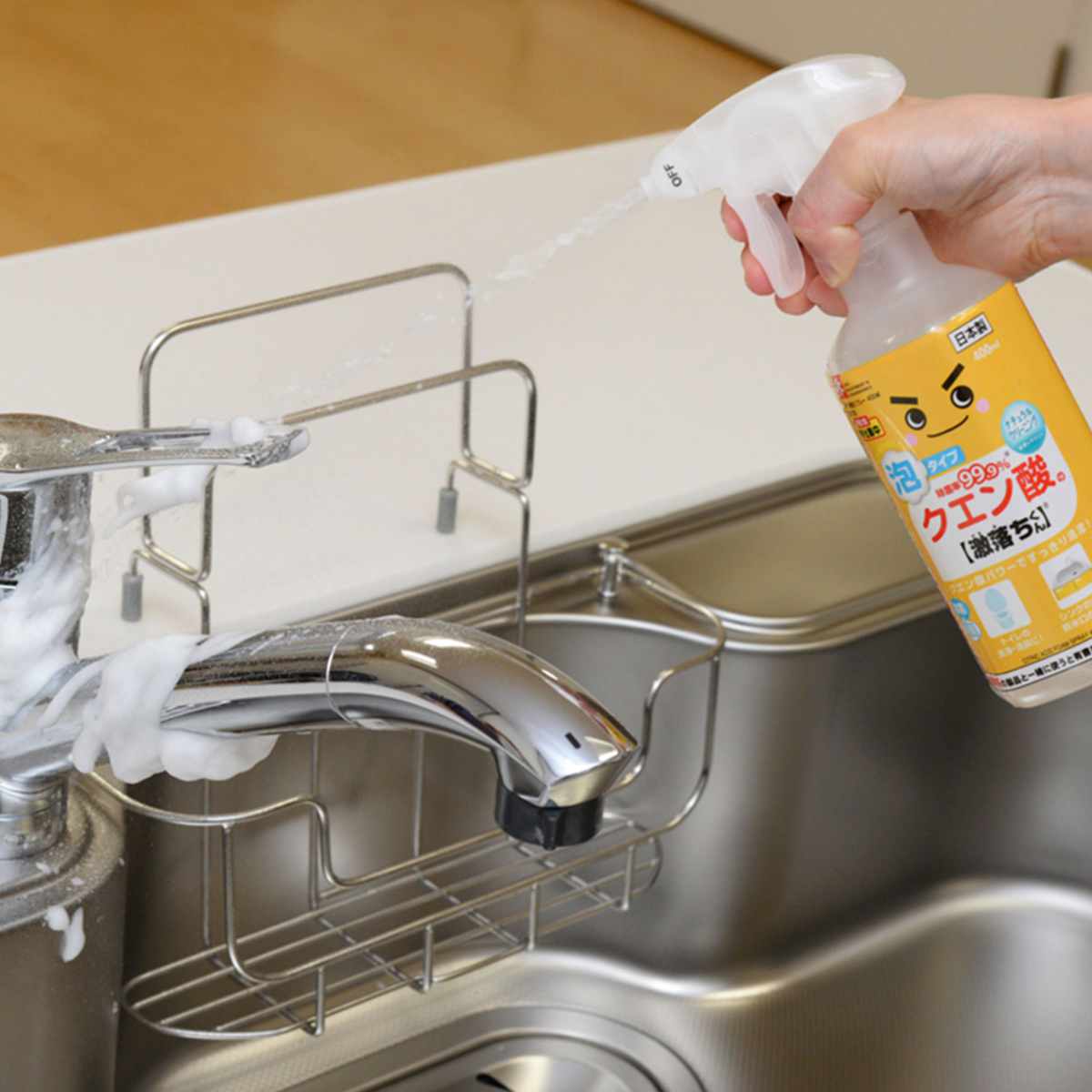 水まわりの頑固な水垢を除去する泡スプレーです。クエン酸の力でシンクまわりや浴室などの水垢を分解して落とします。
