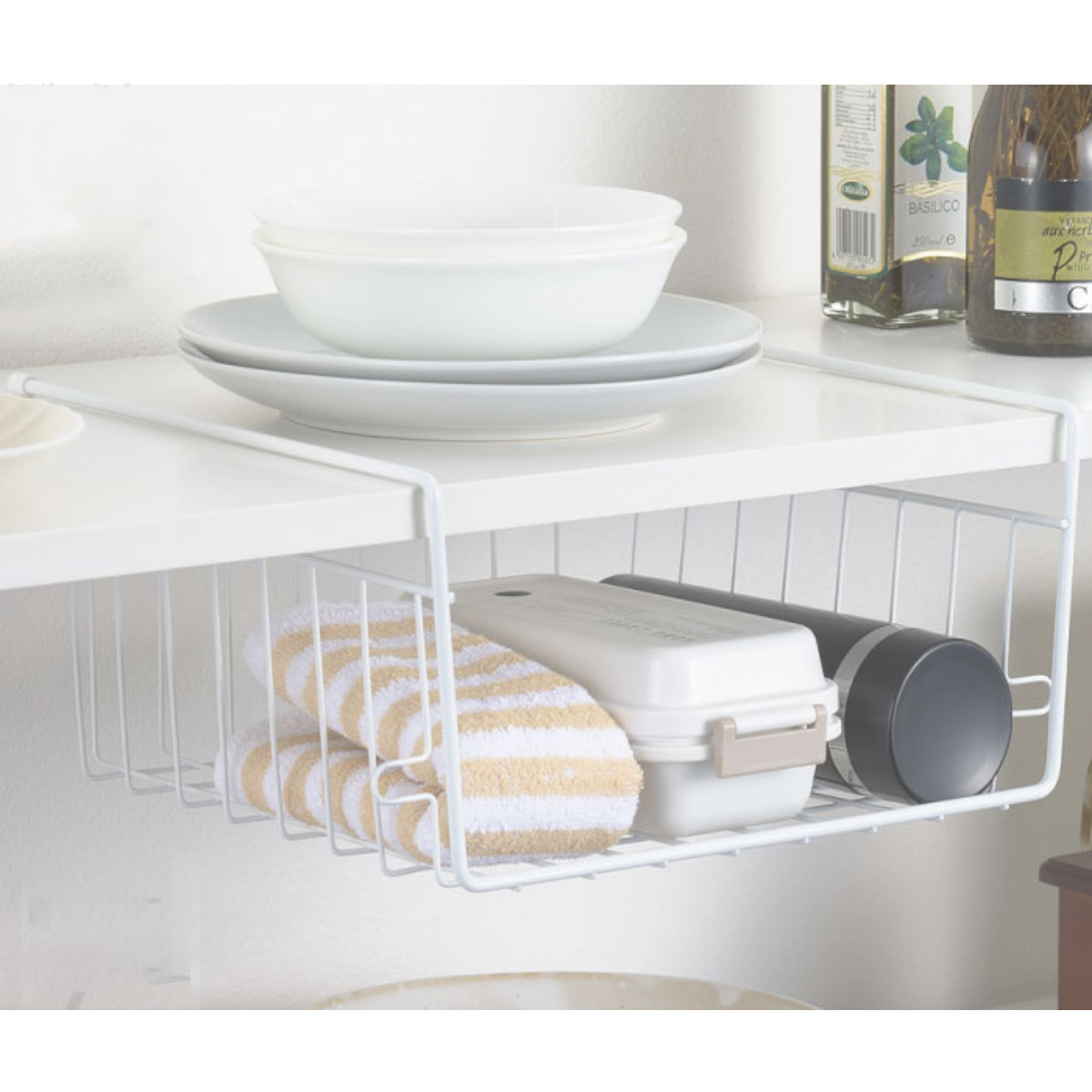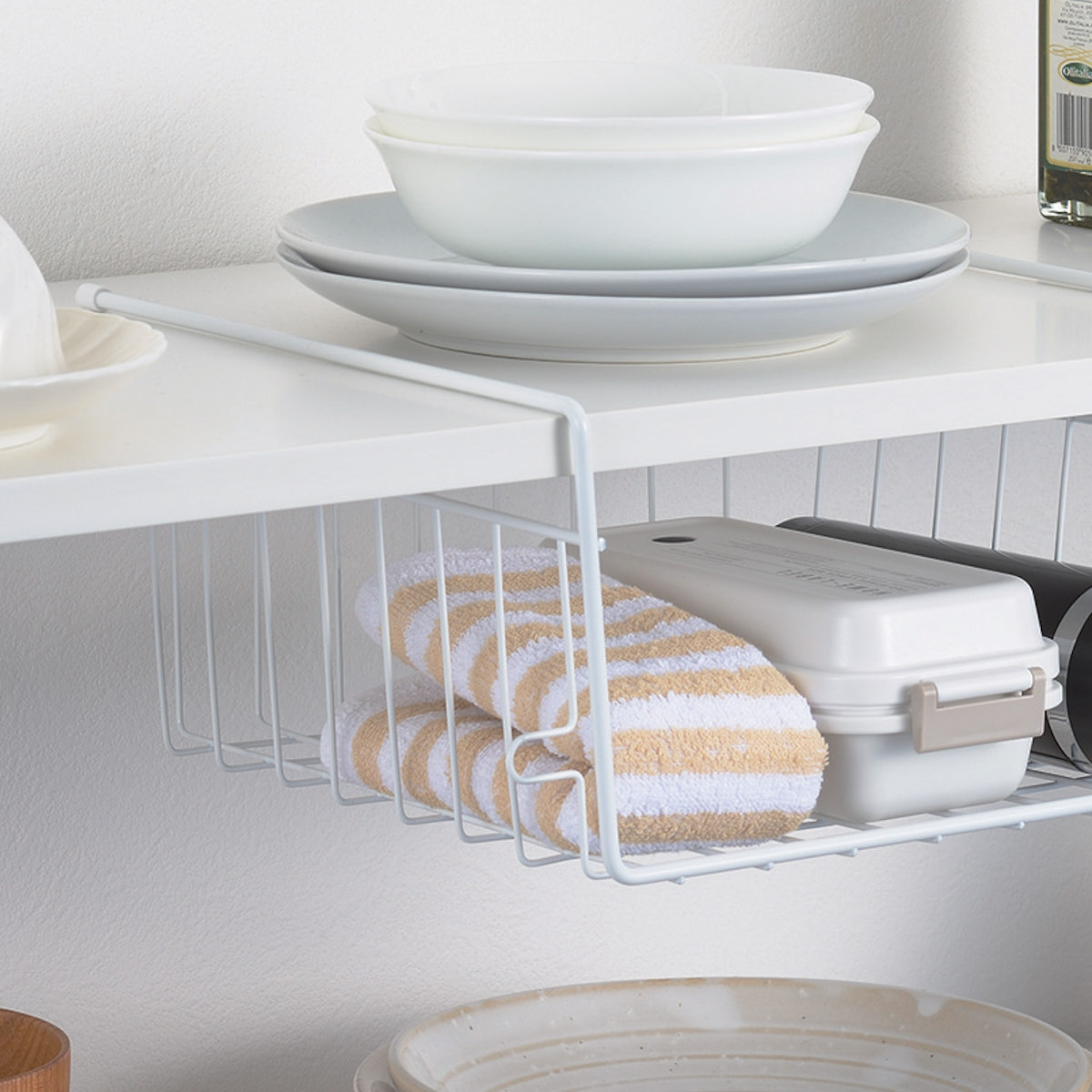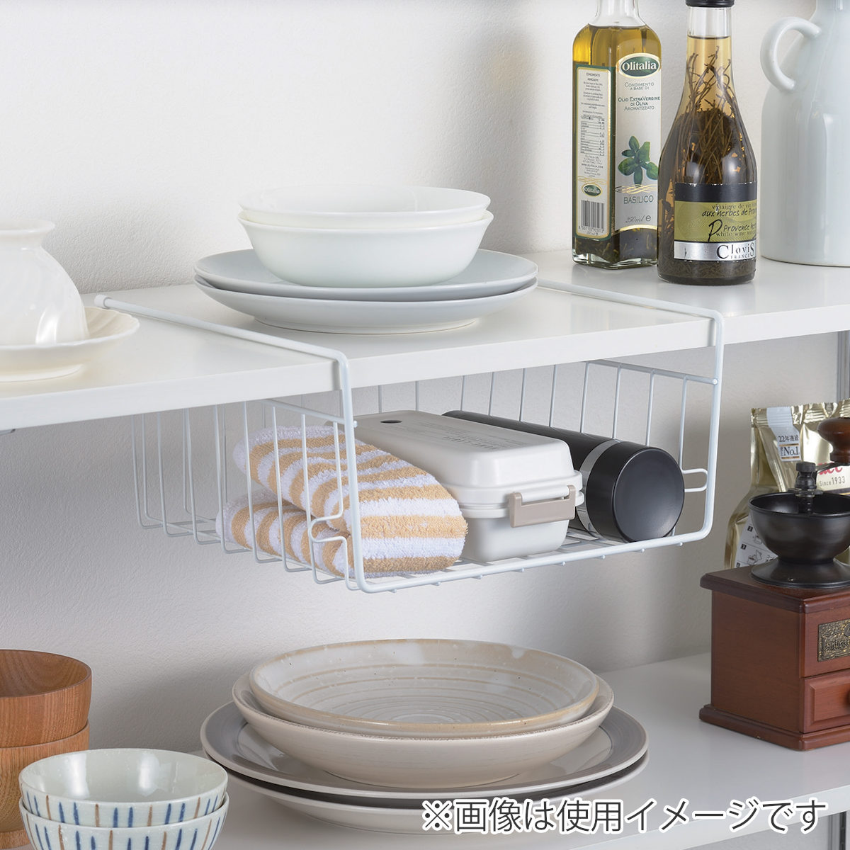 吊り戸棚の棚板に差し込むだけで、簡単に取り付けられるハンガーバスケットです。よく使うキッチンペーパー・ラップ・布巾・調理道具・水筒など、すぐに手の届くところにすっきり収納できます。