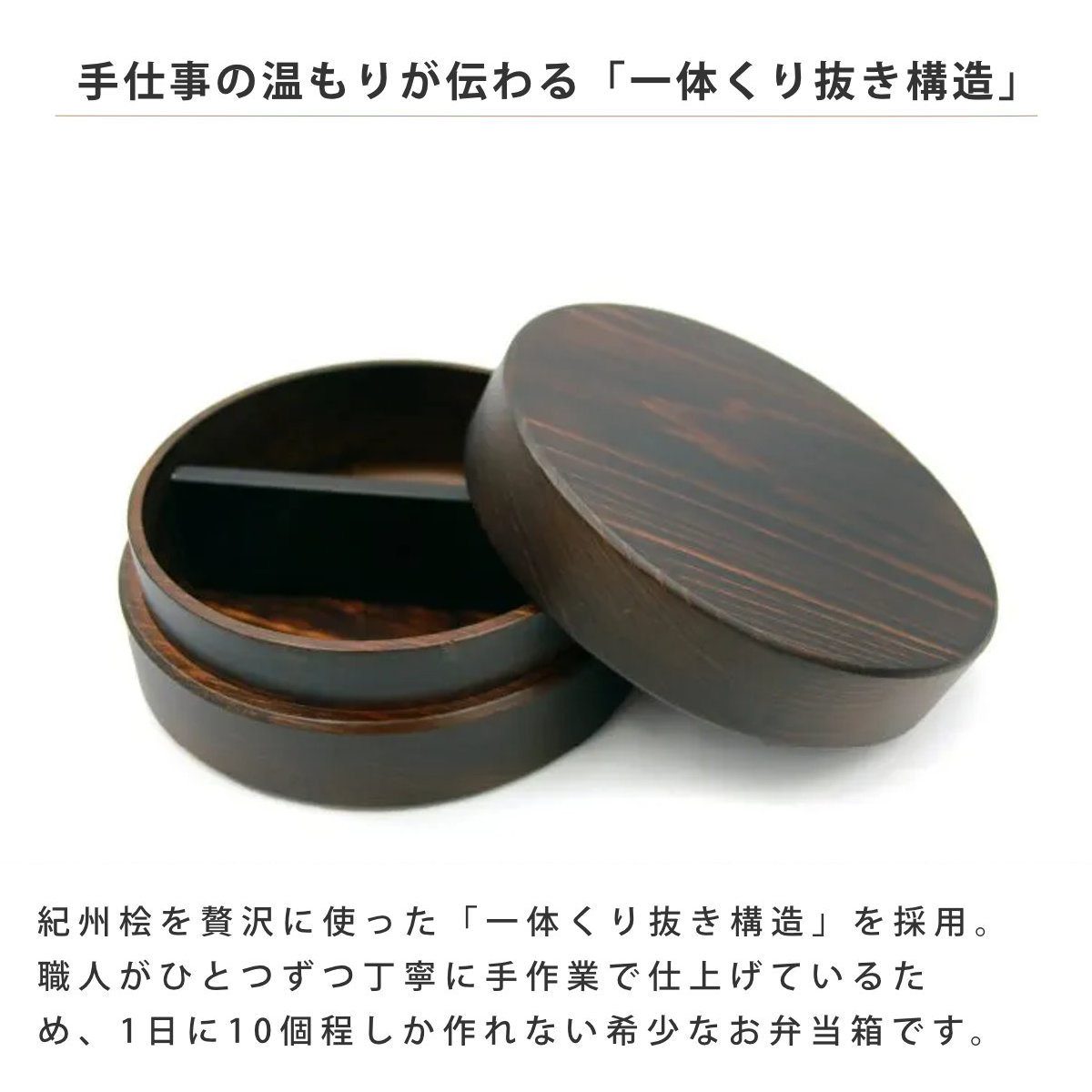 ●紀州産桧を贅沢にくりぬいた、和風モダンなくりぬき弁当箱です。