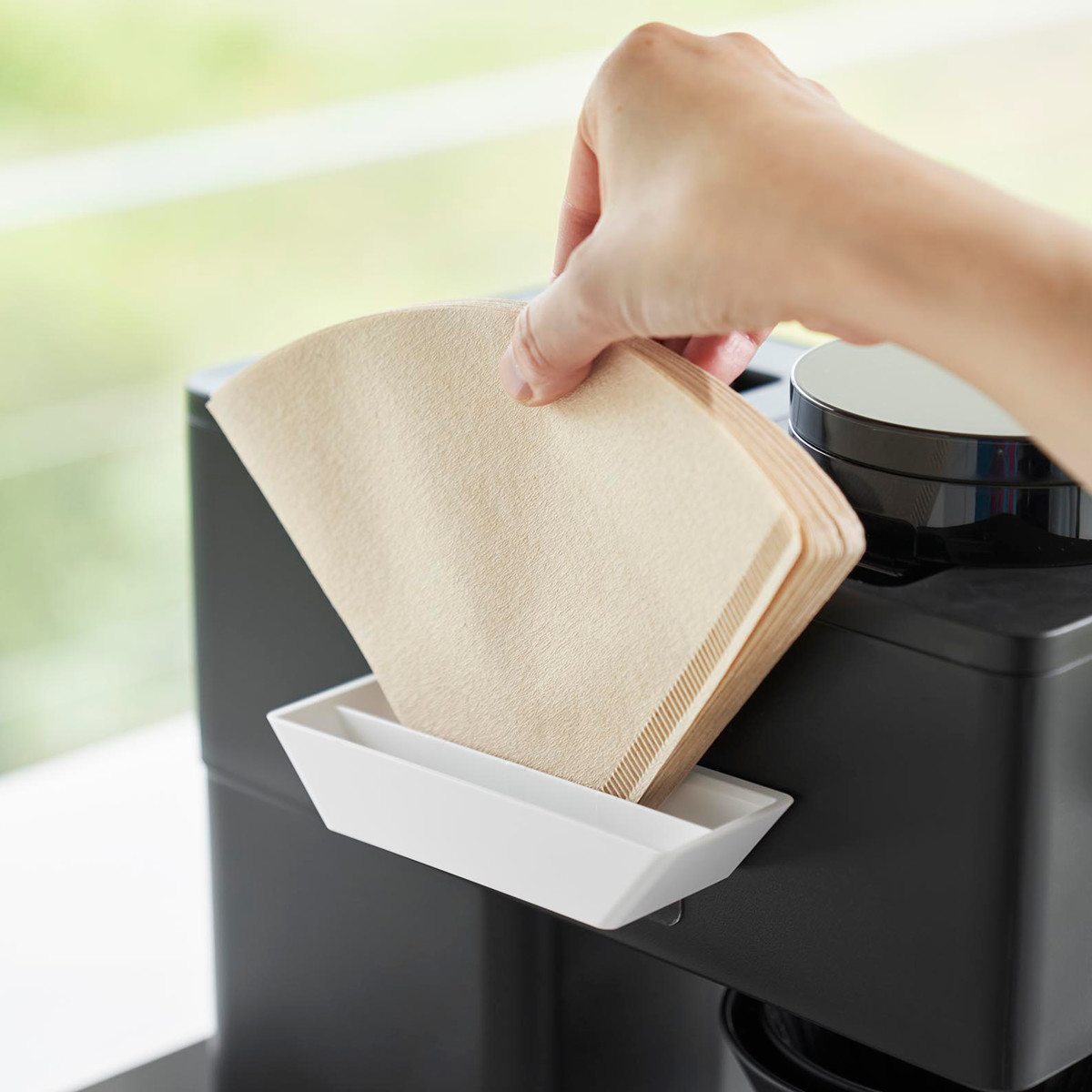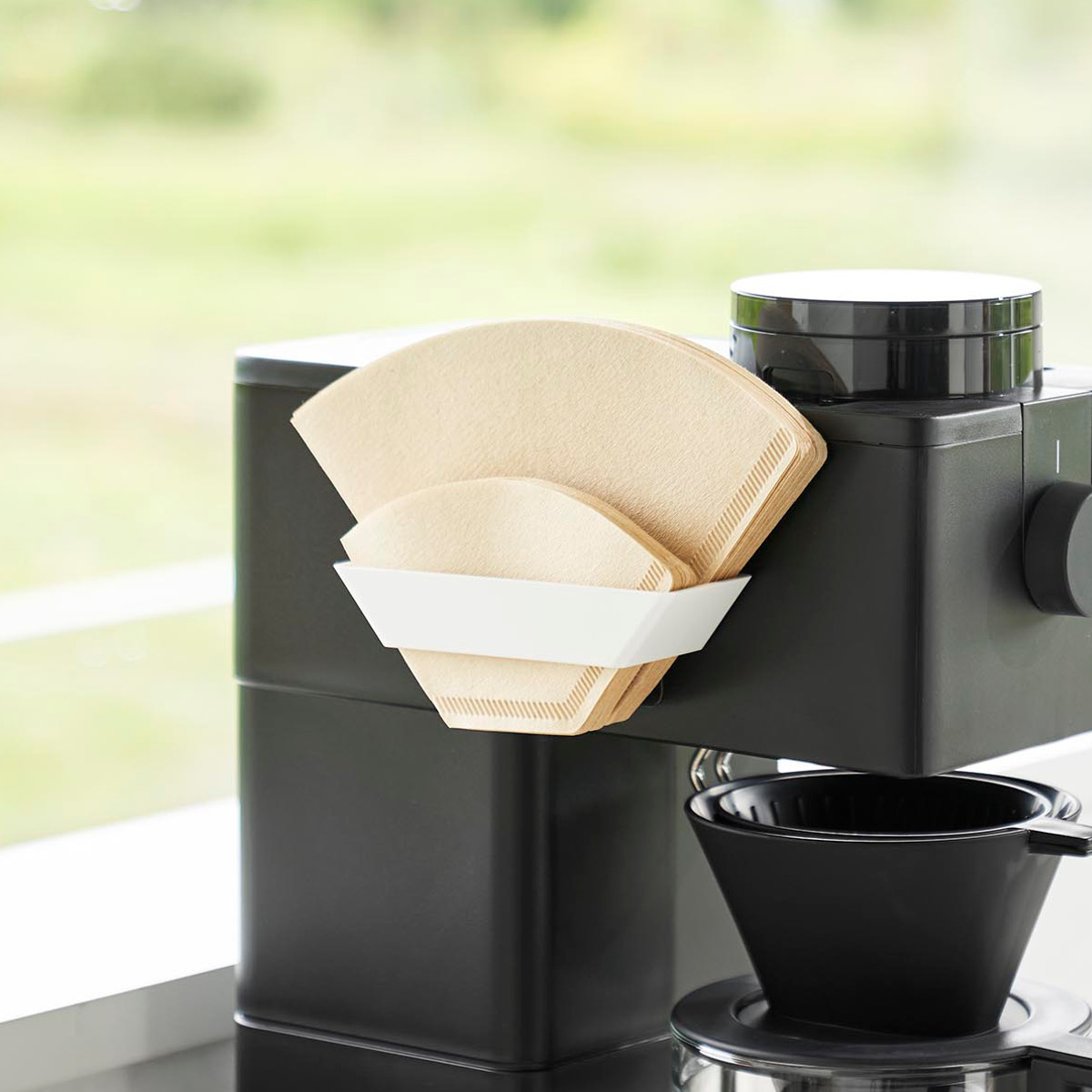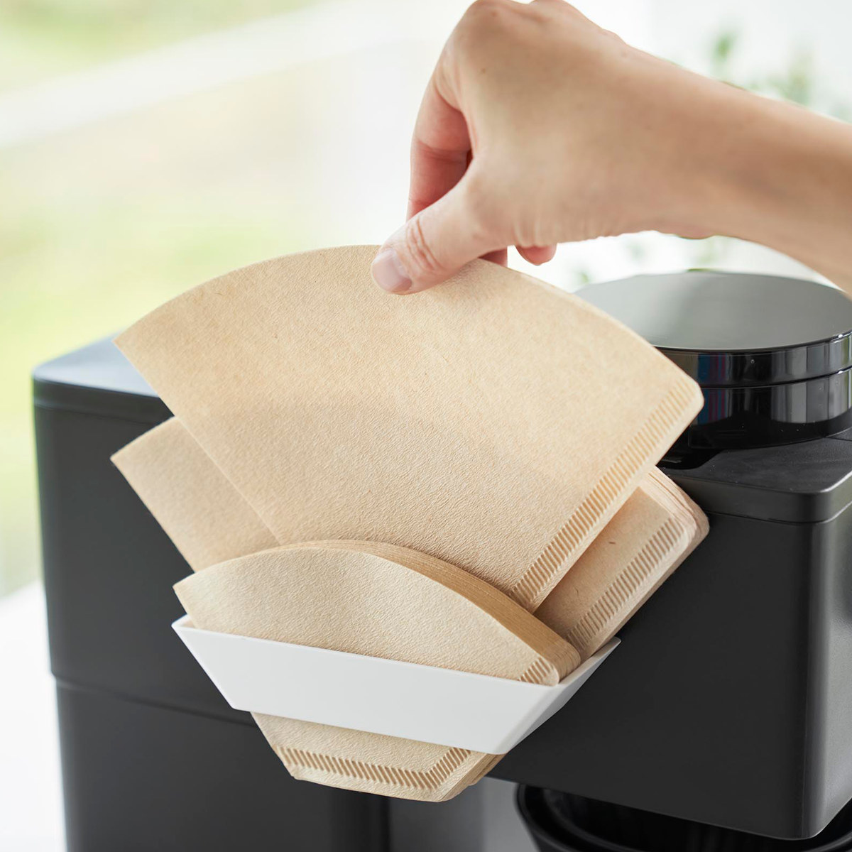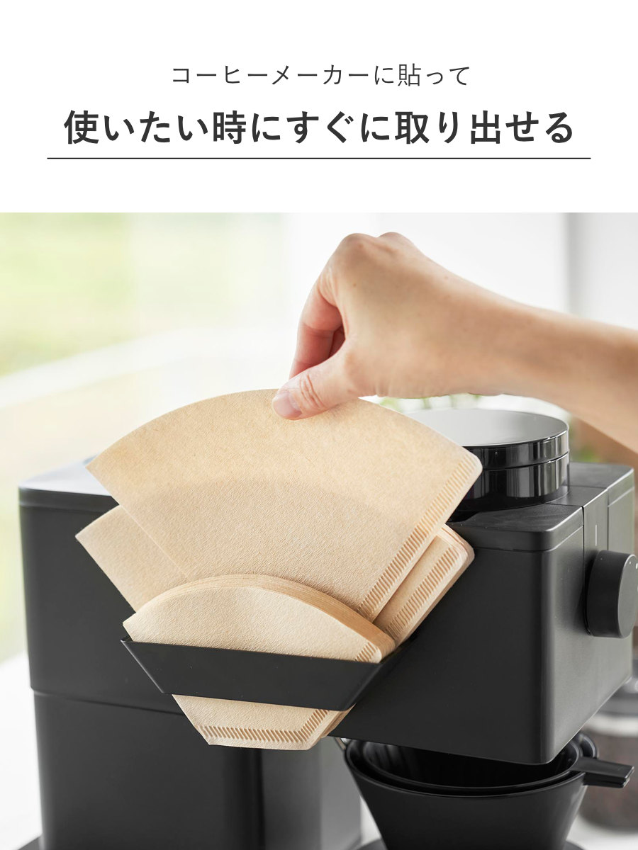 フィルムフックでコーヒーメーカーに直接取り付けられるコーヒーペーパーフィルターストッカーです。上から差し込むだけでコーヒーペーパーフィルターを簡単に収納できます。フィルターの残量が分かりやすく補充がしやすいです。