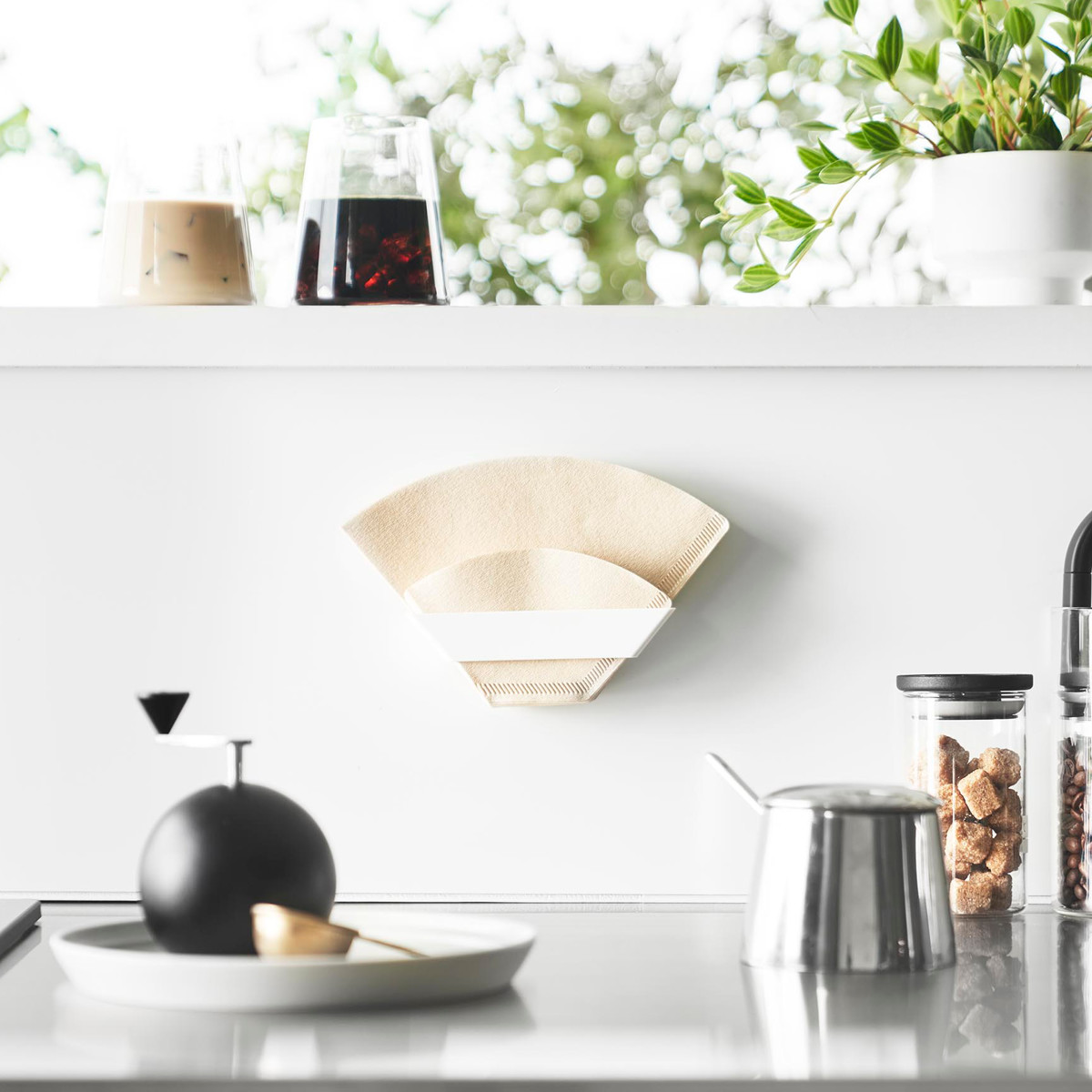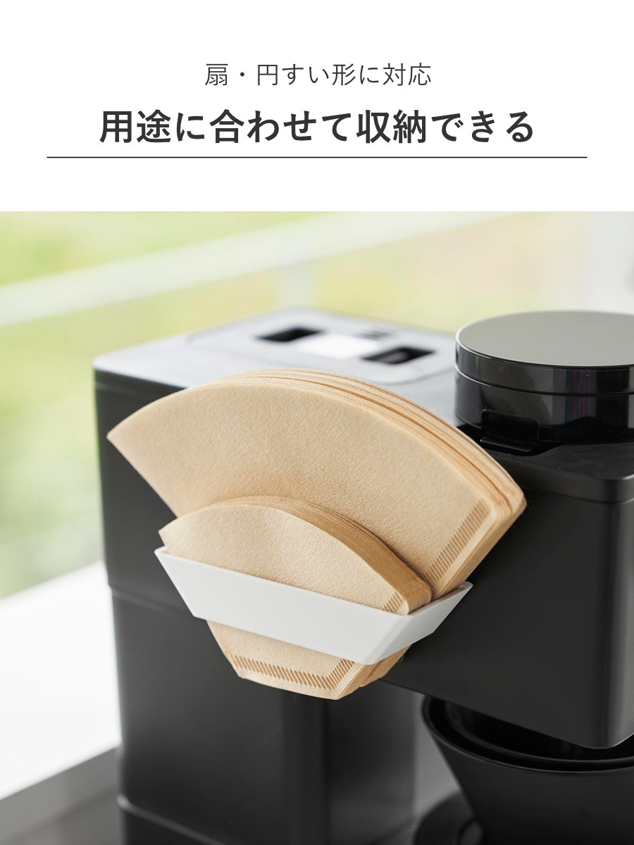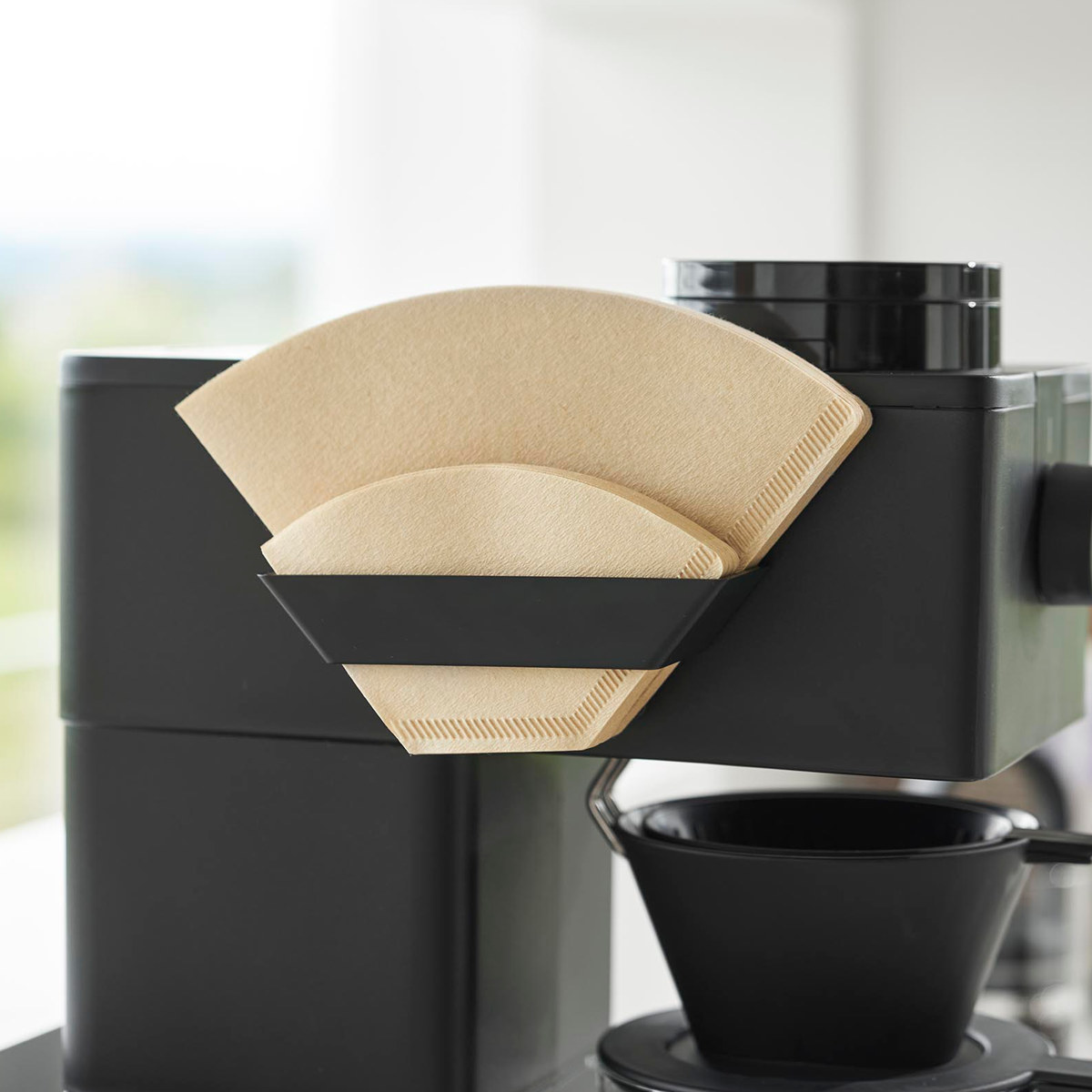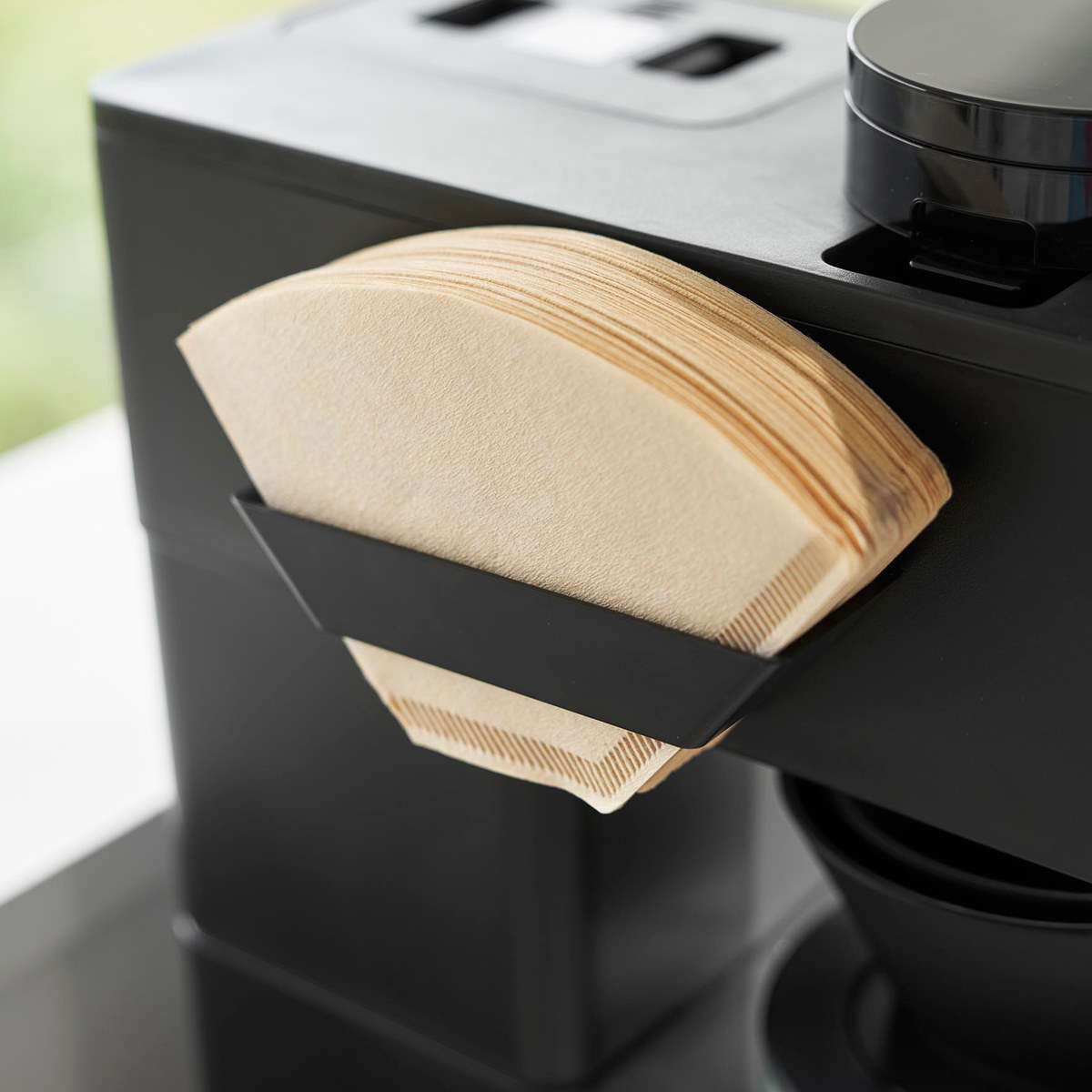 フィルムフックでコーヒーメーカーに直接取り付けられるコーヒーペーパーフィルターストッカーです。上から差し込むだけでコーヒーペーパーフィルターを簡単に収納できます。フィルターの残量が分かりやすく補充がしやすいです。