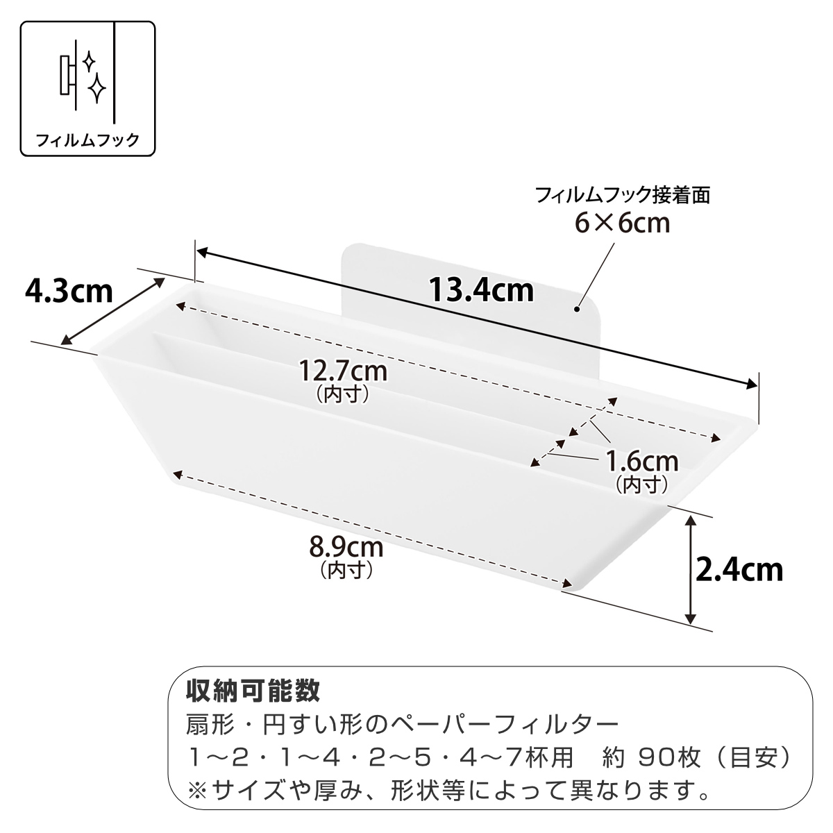 | 備考 | 【収納可能数】 扇形・円すい形のペーパーフィルター 1~2・1~4・2~5・4~7杯用 約 90枚(目安) ※サイズや厚み、形状等によって異なります。 【使用できる面】 光沢のある平らな油染みしない面で、フィルムフックの接着面よりも大きい面(タイル・プラスチック・ステンレス・ガラス・金属塗装面・人工大理石) |