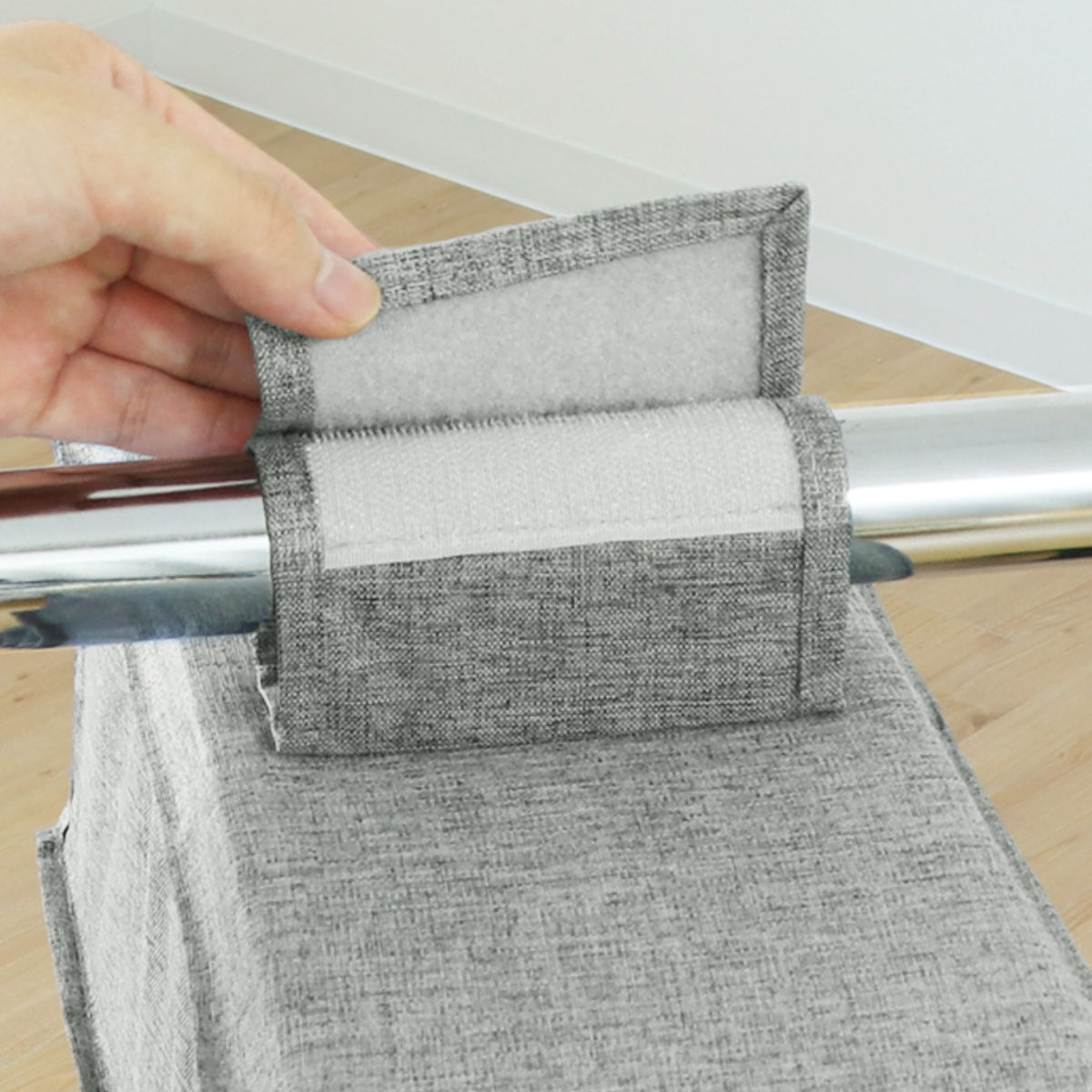 ハンガーラックのパイプに面ファスナーでしっかり固定できる設計です。工具不要で、好きな位置に簡単に取り付けられるので、収納スペースを無駄なく活用できます。しっかり固定されるため、使用中も安定感があり安心です。
