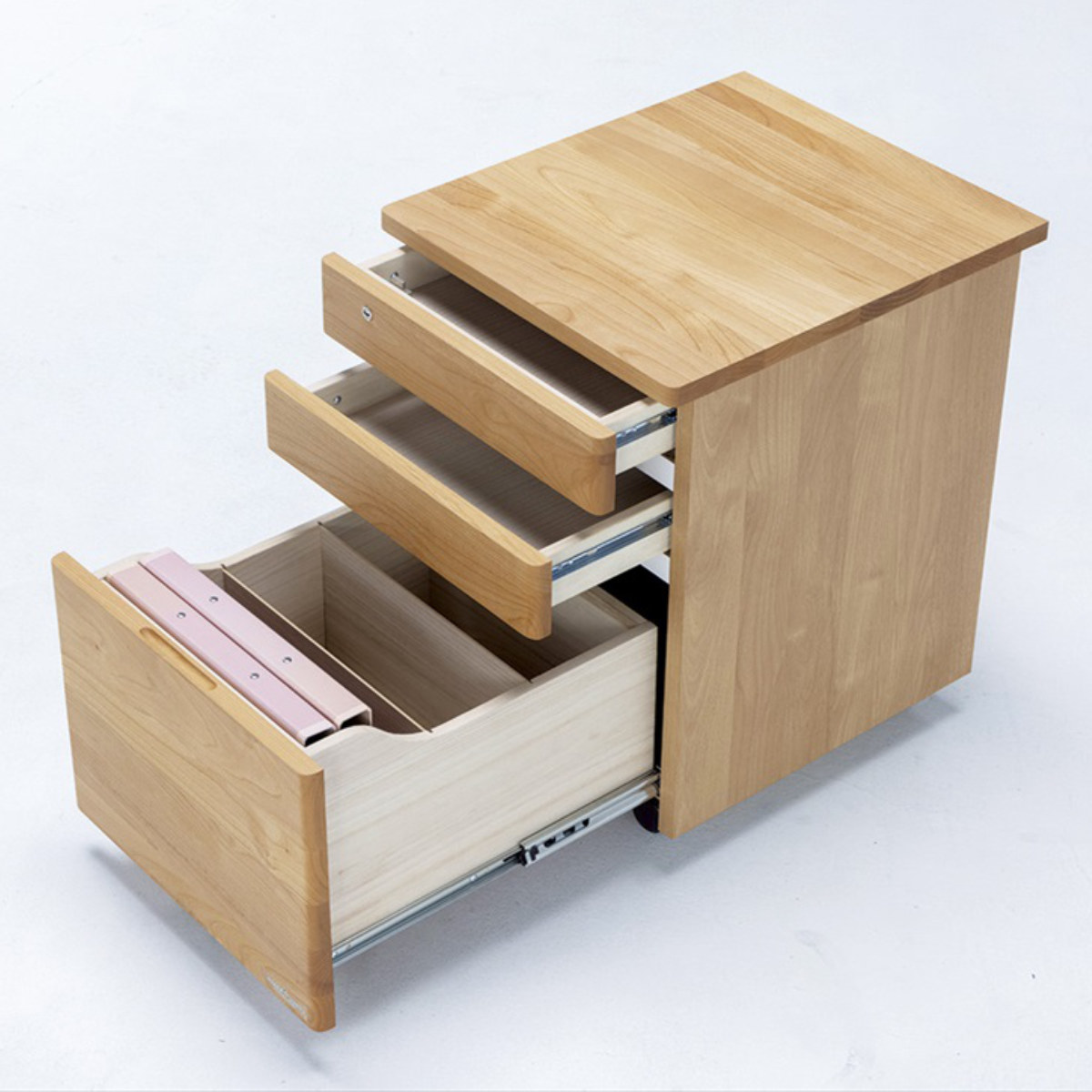 1段目・2段目は小物の収納に、3段目はファイルや大きい物の収納に最適です。一番下の引き出しはフルオープン仕様なので、物の出し入れがしやすく奥までたっぷり使えます。仕切りも2枚付いています。