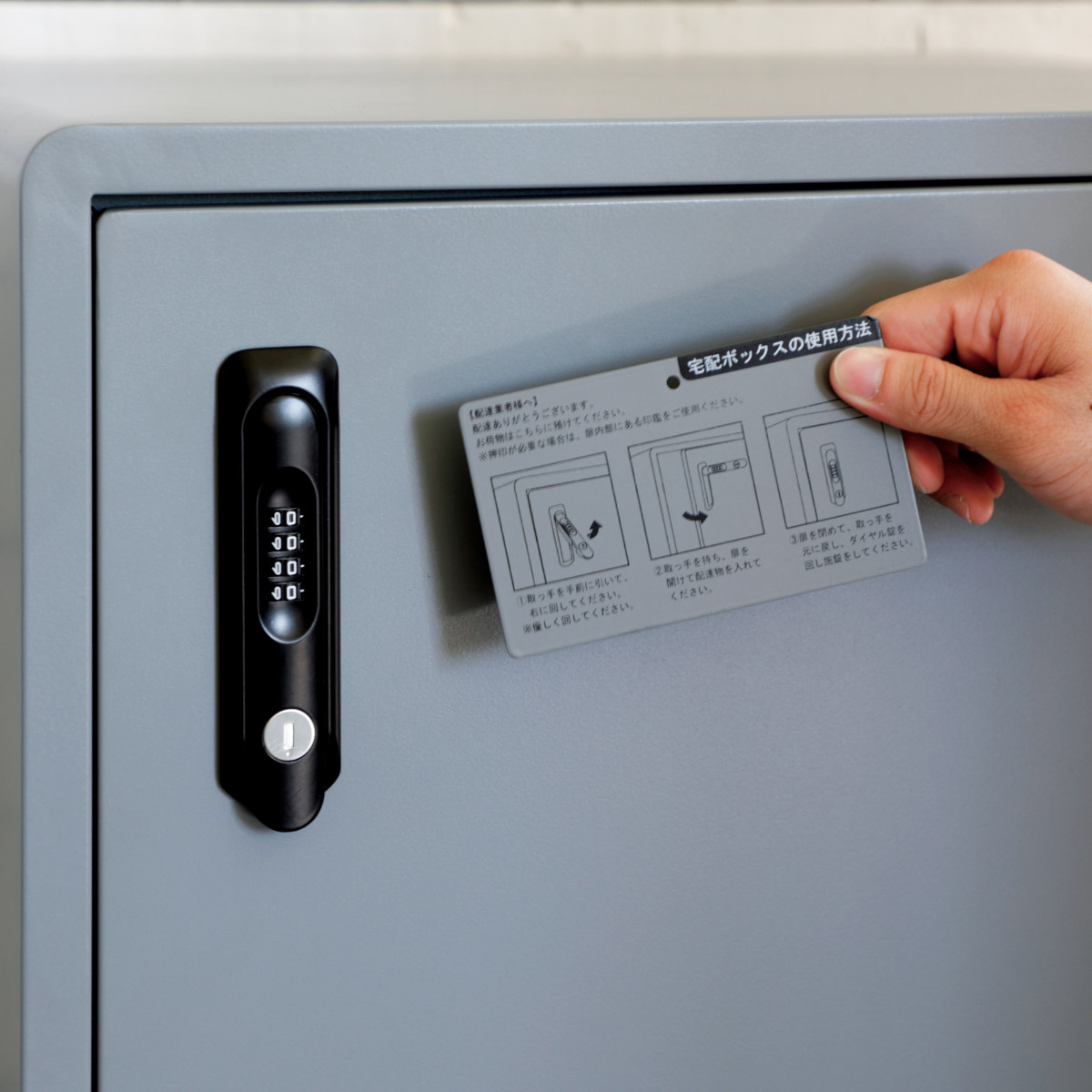 配送業者さん向けの脱着可能な、施錠方法の説明マグネットプレートが付いています。
