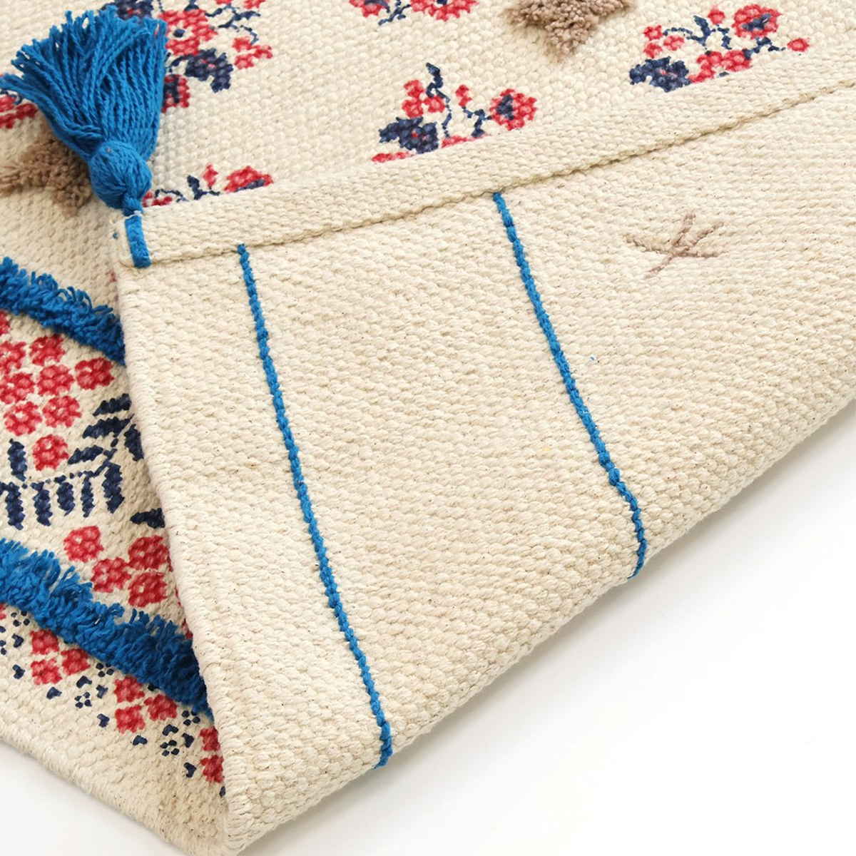 玄関マットの四隅にそっと揺れるフリンジは、マット全体のデザインを引き立てながらも、その繊細な存在感が玄関に温かみと遊び心をプラスします。柔らかい糸で編まれたフリンジが、足元に軽やかな動きを与え、訪れる人を優しく迎え入れてくれます。