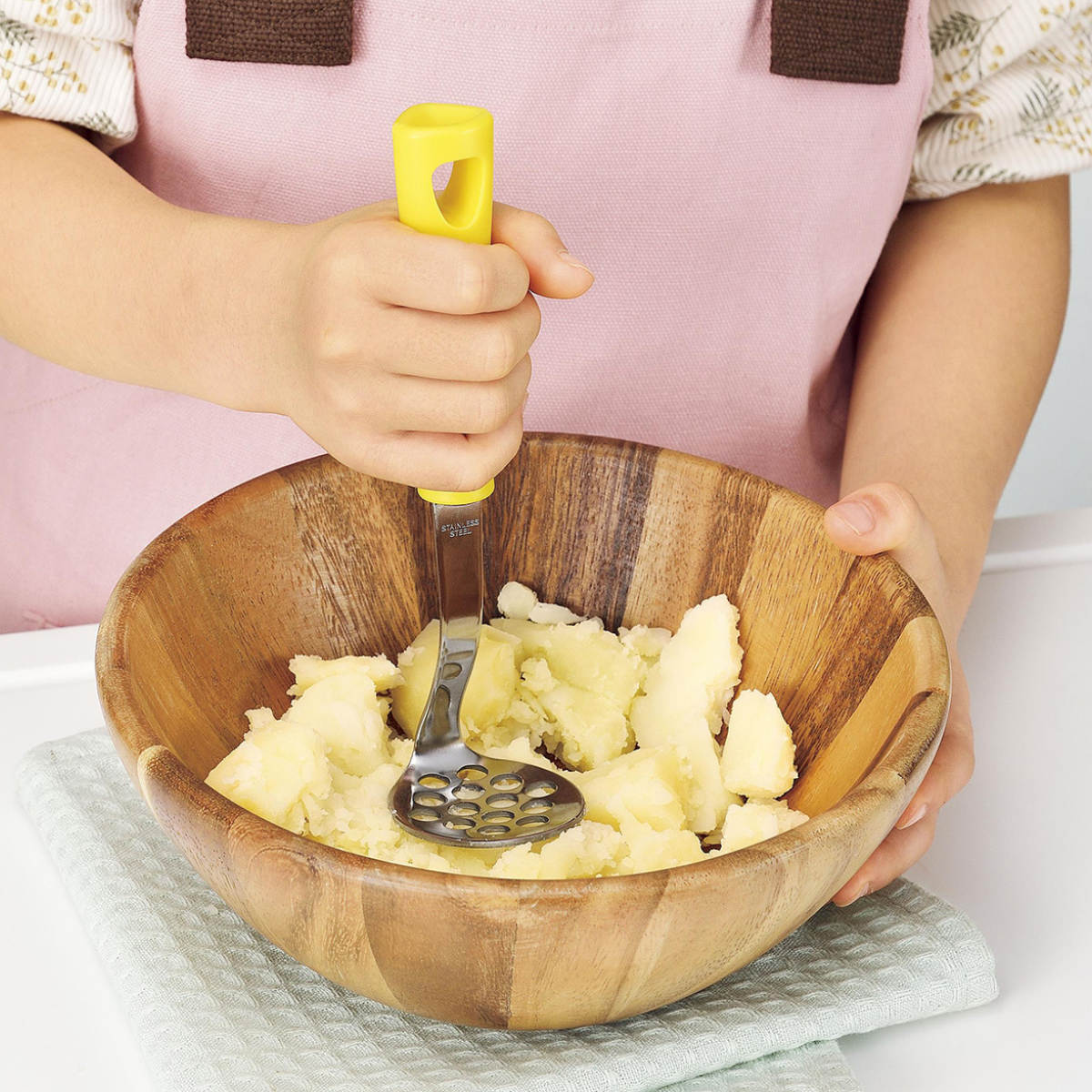お子様のお料理デビューにぴったりな小さめサイズのマッシャーです。底丸形状でボール等の容器にフィットし、軽い力で食材をつぶせます。