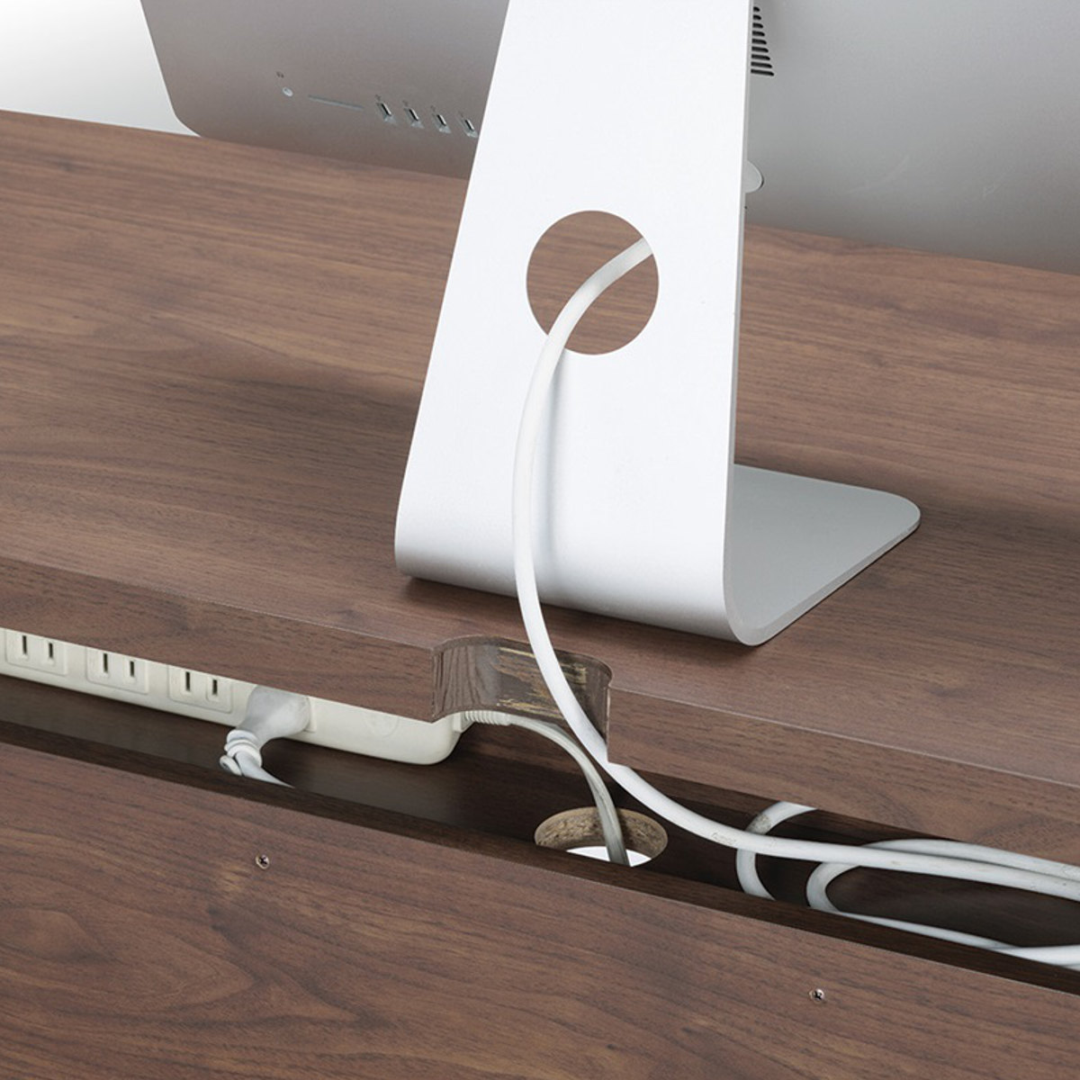 天板には配線穴、背面にはコンセントタップ収納があるのでごちゃつきがちなコード類もスッキリさせられます。