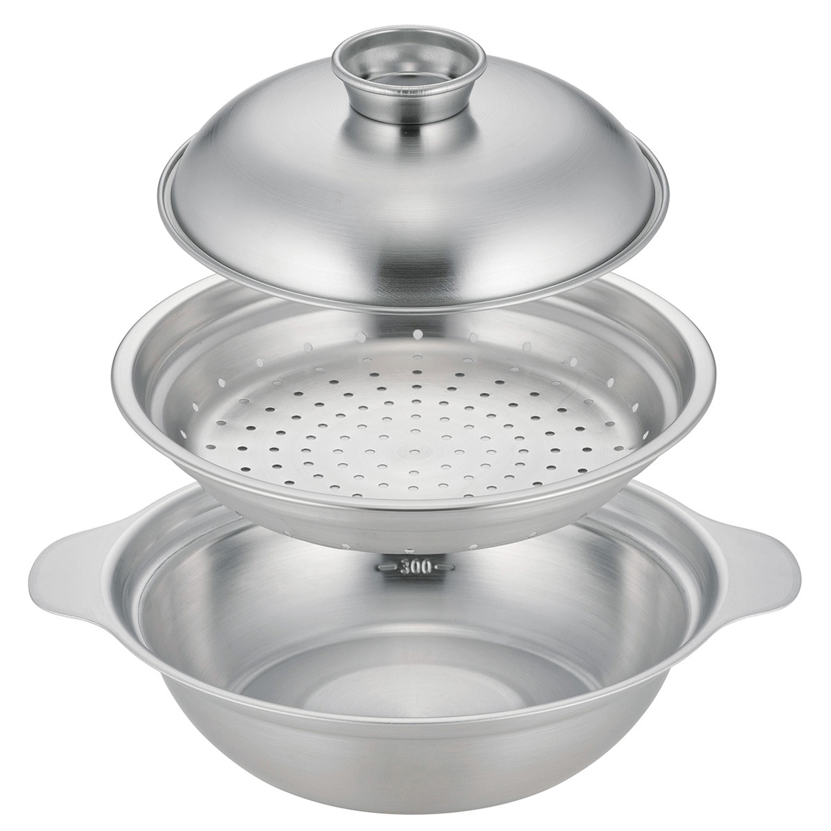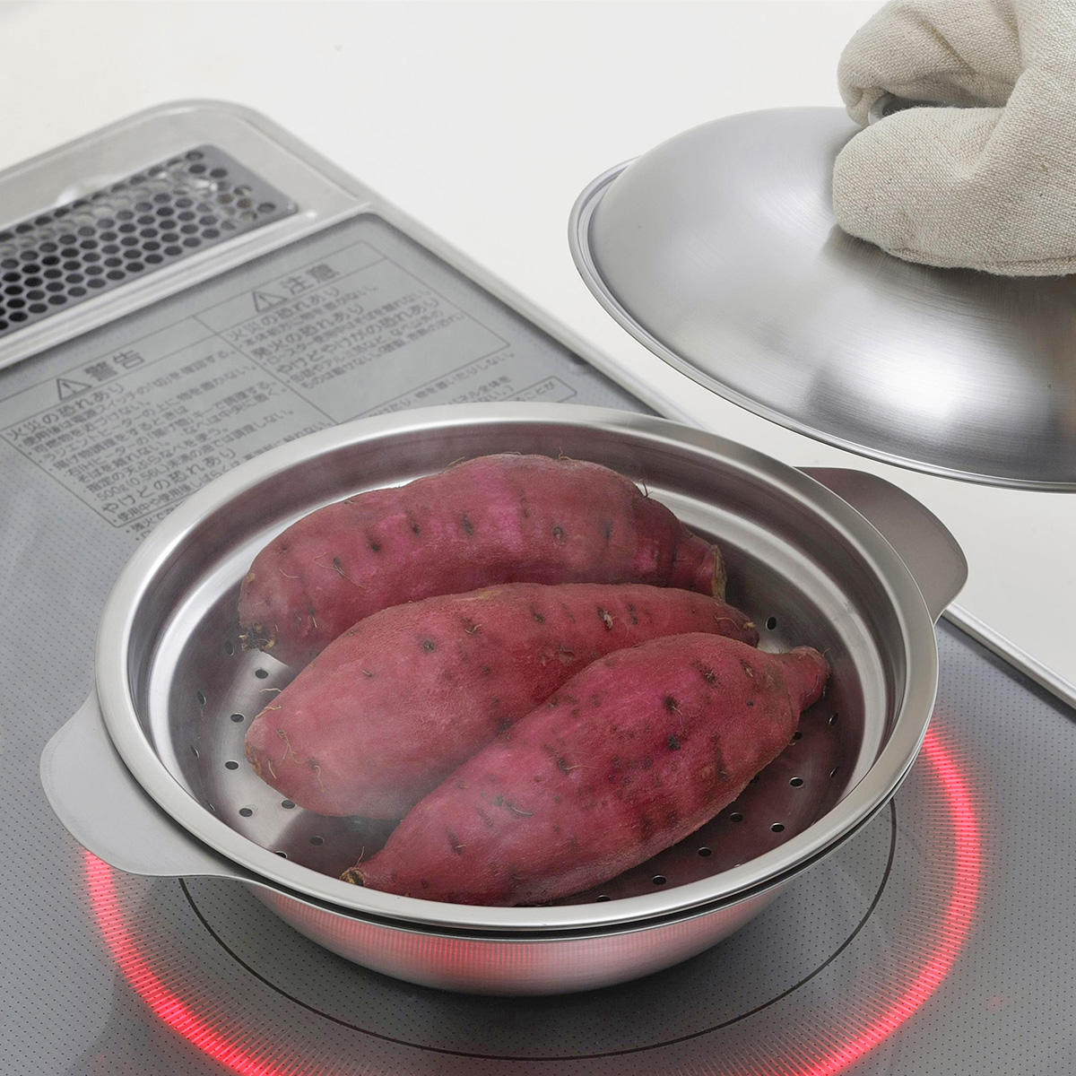 蒸し皿付きのステンレス製卓上鍋です。土鍋よりも軽量で扱いやすく、卓上鍋としてはもちろん、蒸し料理やスープなどの調理鍋としてもデイリーに活躍します。