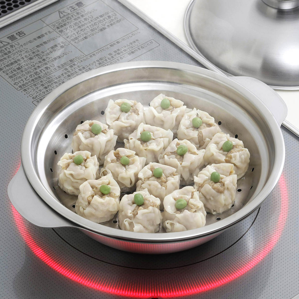 蒸し皿を使って蒸し料理にも。蓋はドーム型となっており、蒸気が対流することで、ムラなくふっくら蒸すことができます。