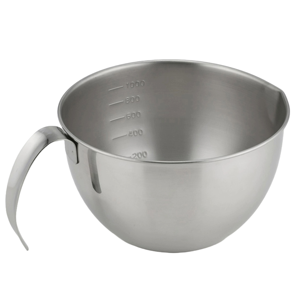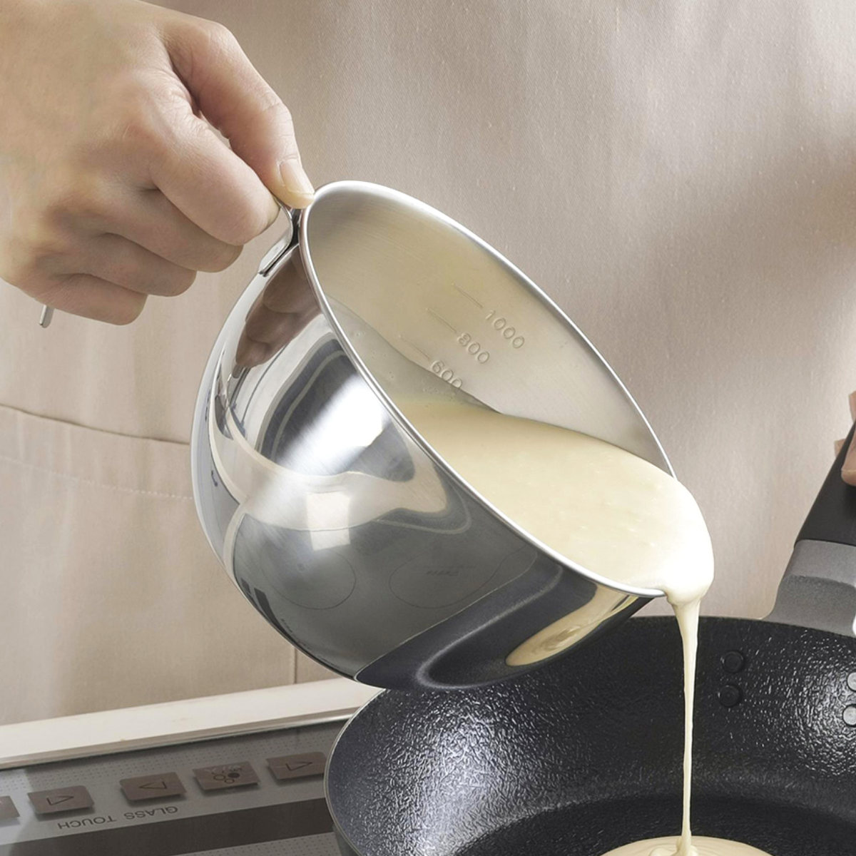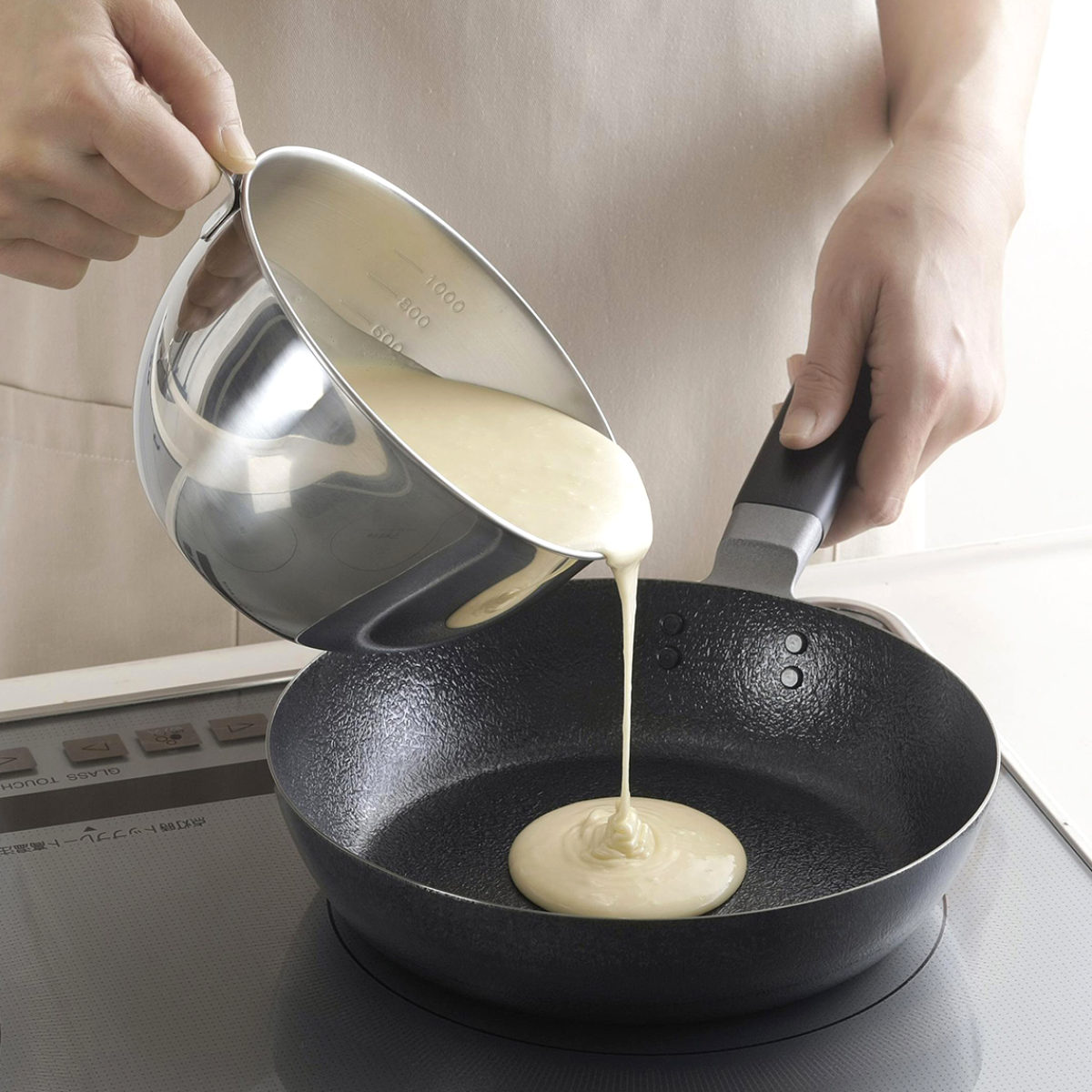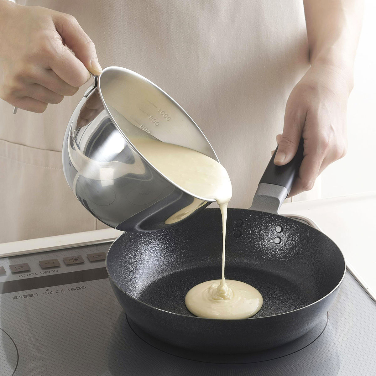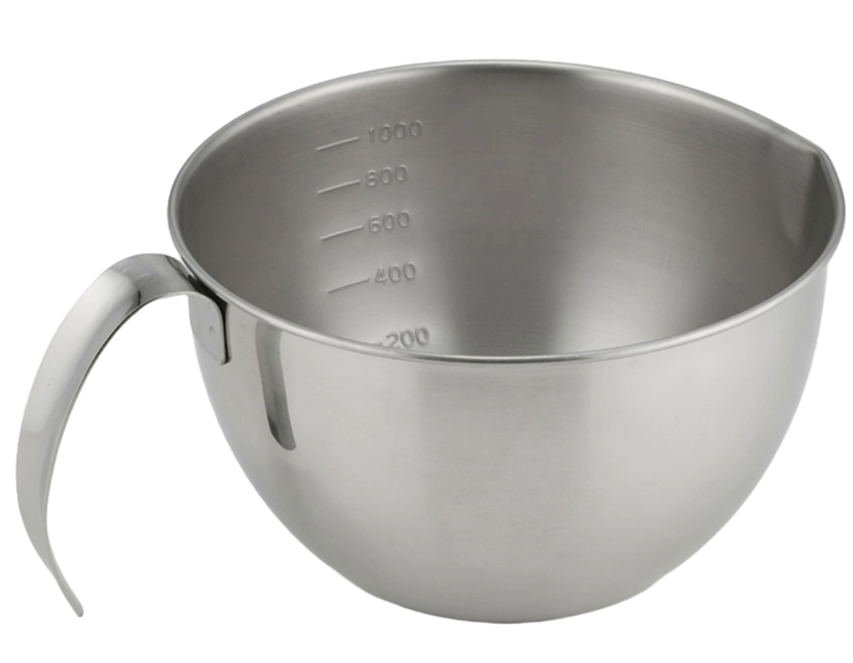 ステンレス製の持ち手付きボウルです。卵焼きやお好み焼き、パンケーキなどもちゃちゃっと生地を混ぜて、注ぎ口からフライパンにサッと流し込んで手際よく作れます。