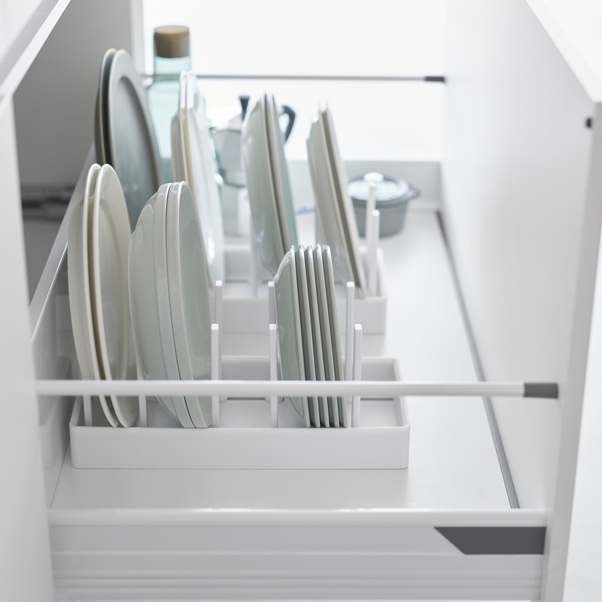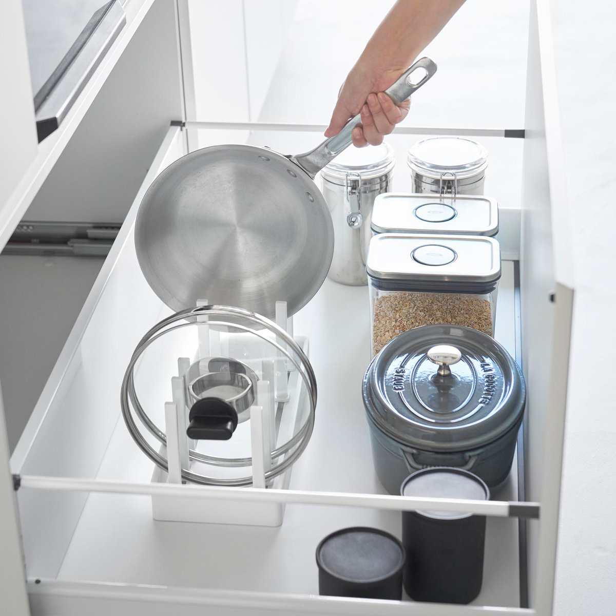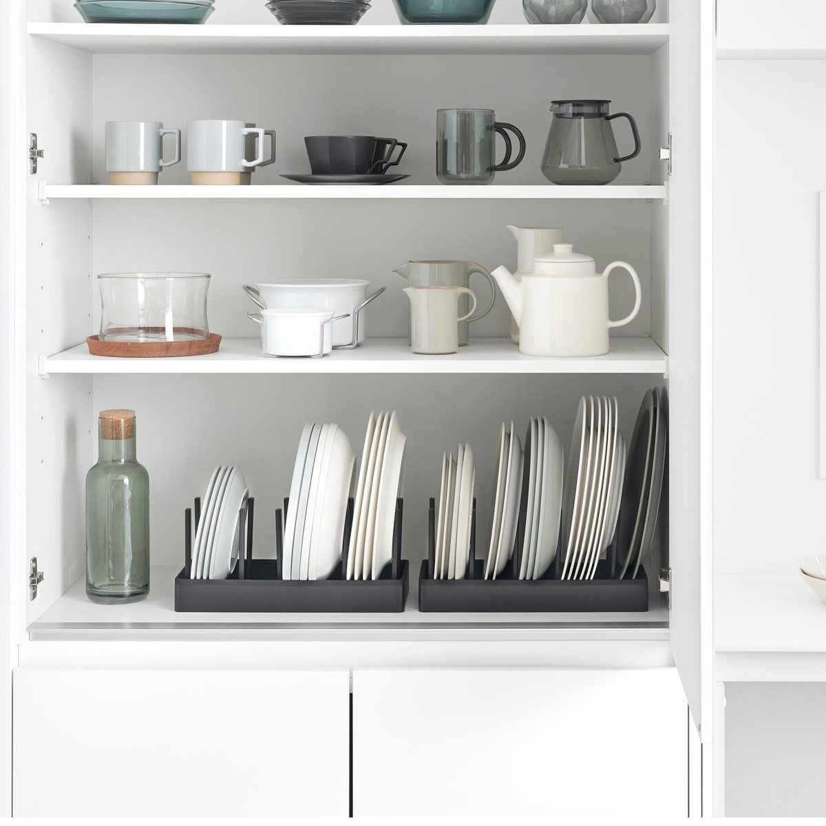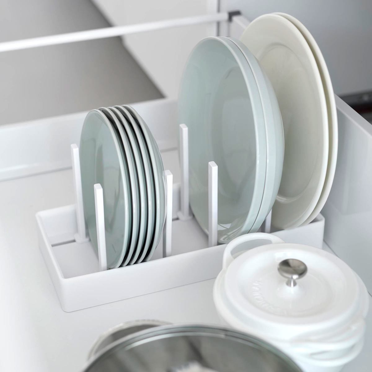 仕切りは収納物のサイズに合わせて調節できます。好みの位置にスライドしてロックするだけで、お皿から鍋まで幅広い収納に使えます。