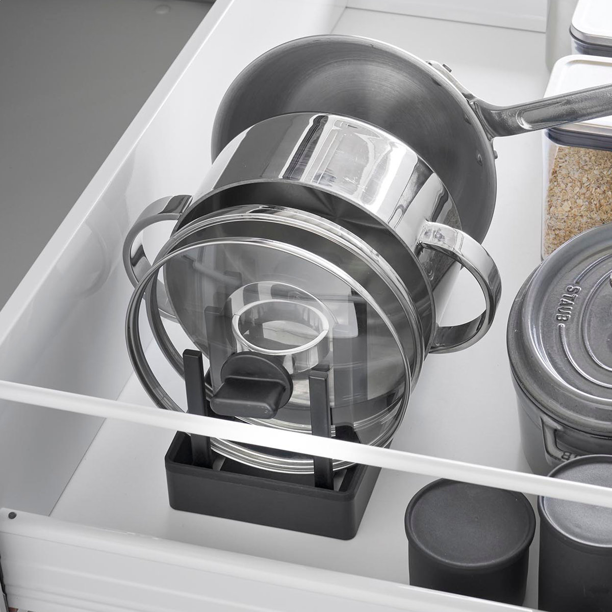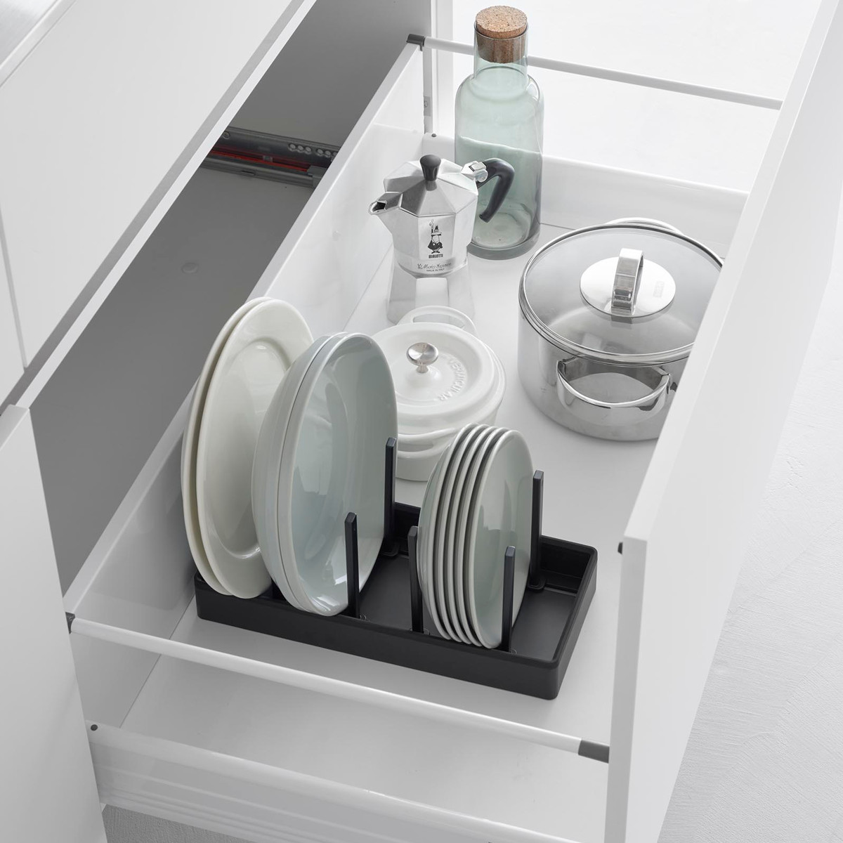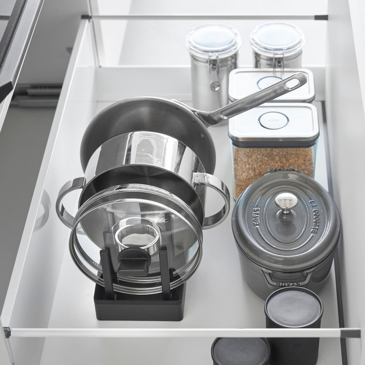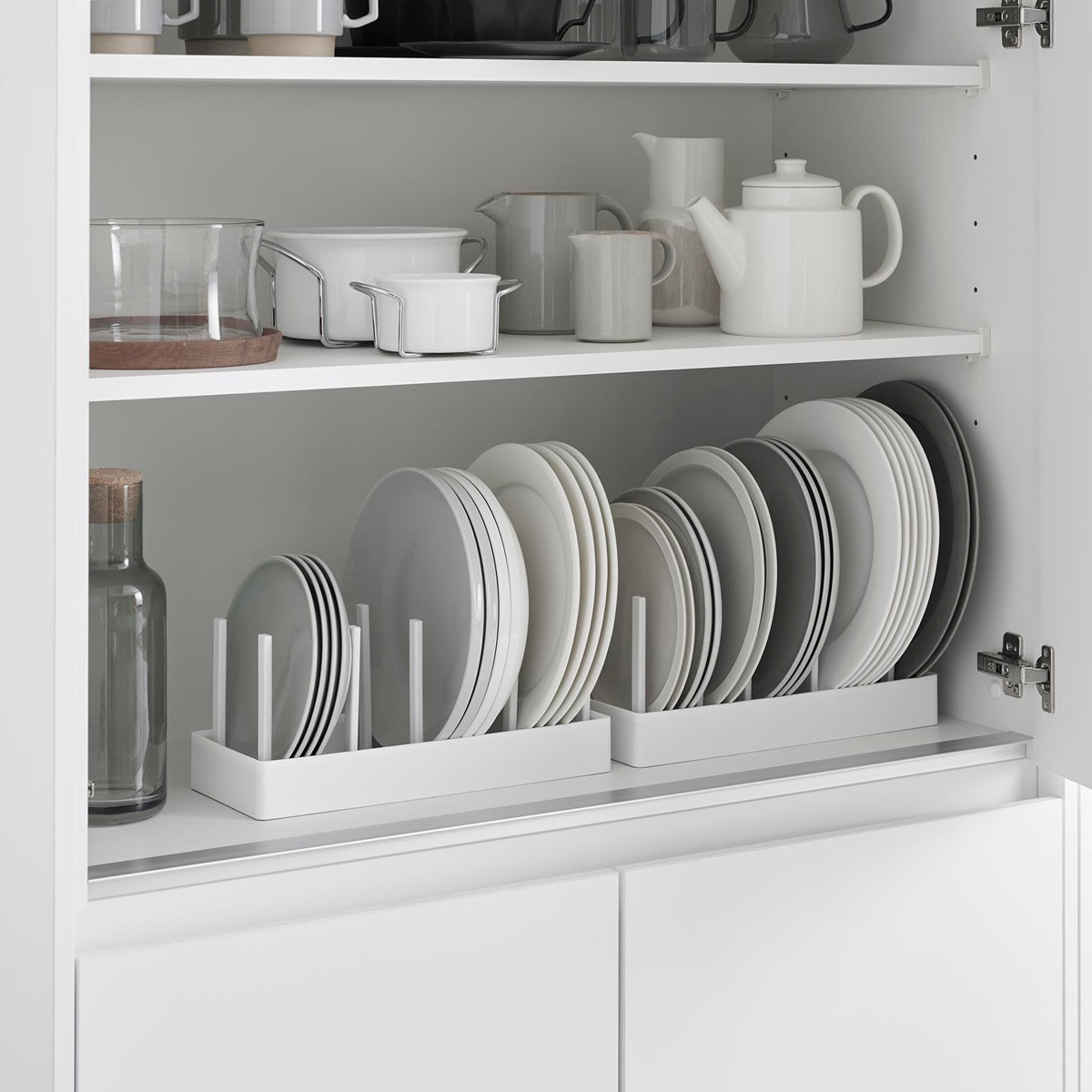 仕切りは収納物のサイズに合わせて調節できます。好みの位置にスライドしてロックするだけで、お皿から鍋まで幅広い収納に使えます。