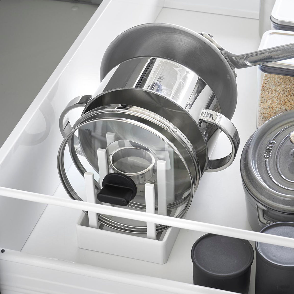 鍋蓋やフライパンを立てて収納できるスタンドです。1つ1つ立てて収納することで使いたいものをサッと取り出しやすくなります。