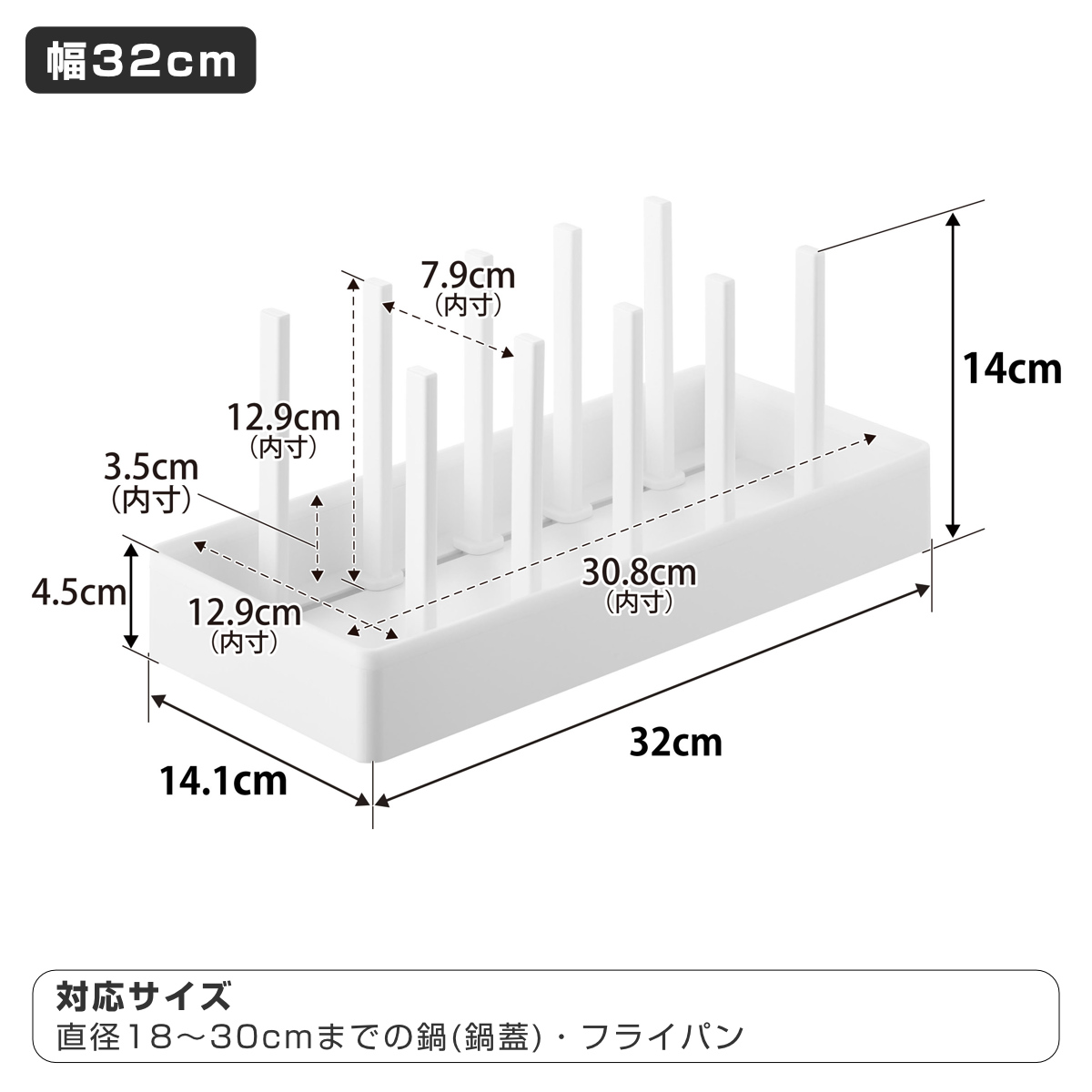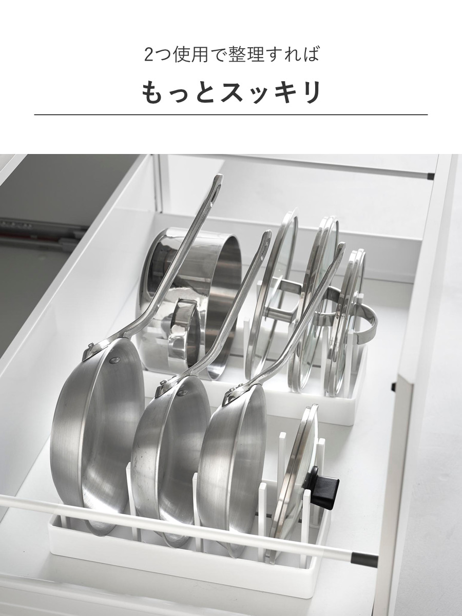 幅32cmのコンパクトサイズで、縦にも横にも使えます。横並びに2台使用すれば、フライパンから鍋蓋までまとめてスッキリ整頓できます。