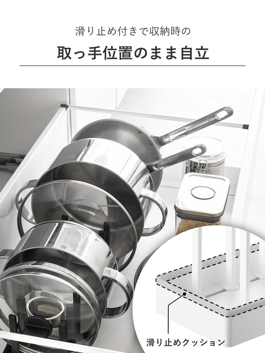 設置面にシリコーン製の滑り止めクッションが付いているので、フライパンなど収納時の取っ手位置のまま自立してくれます。