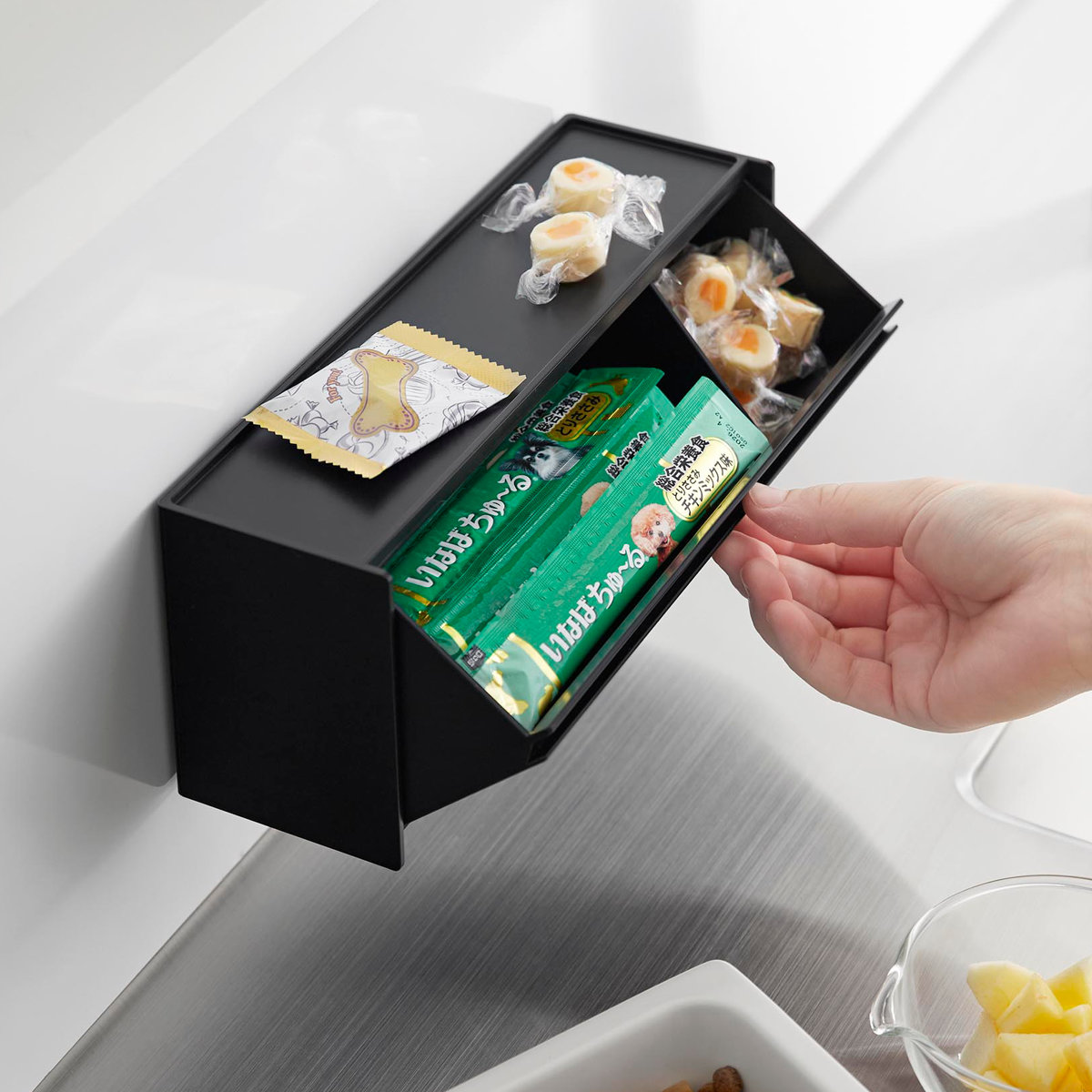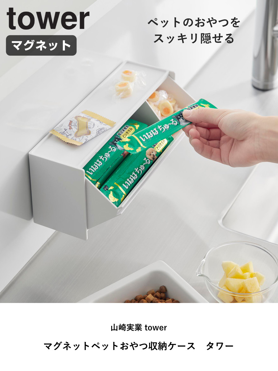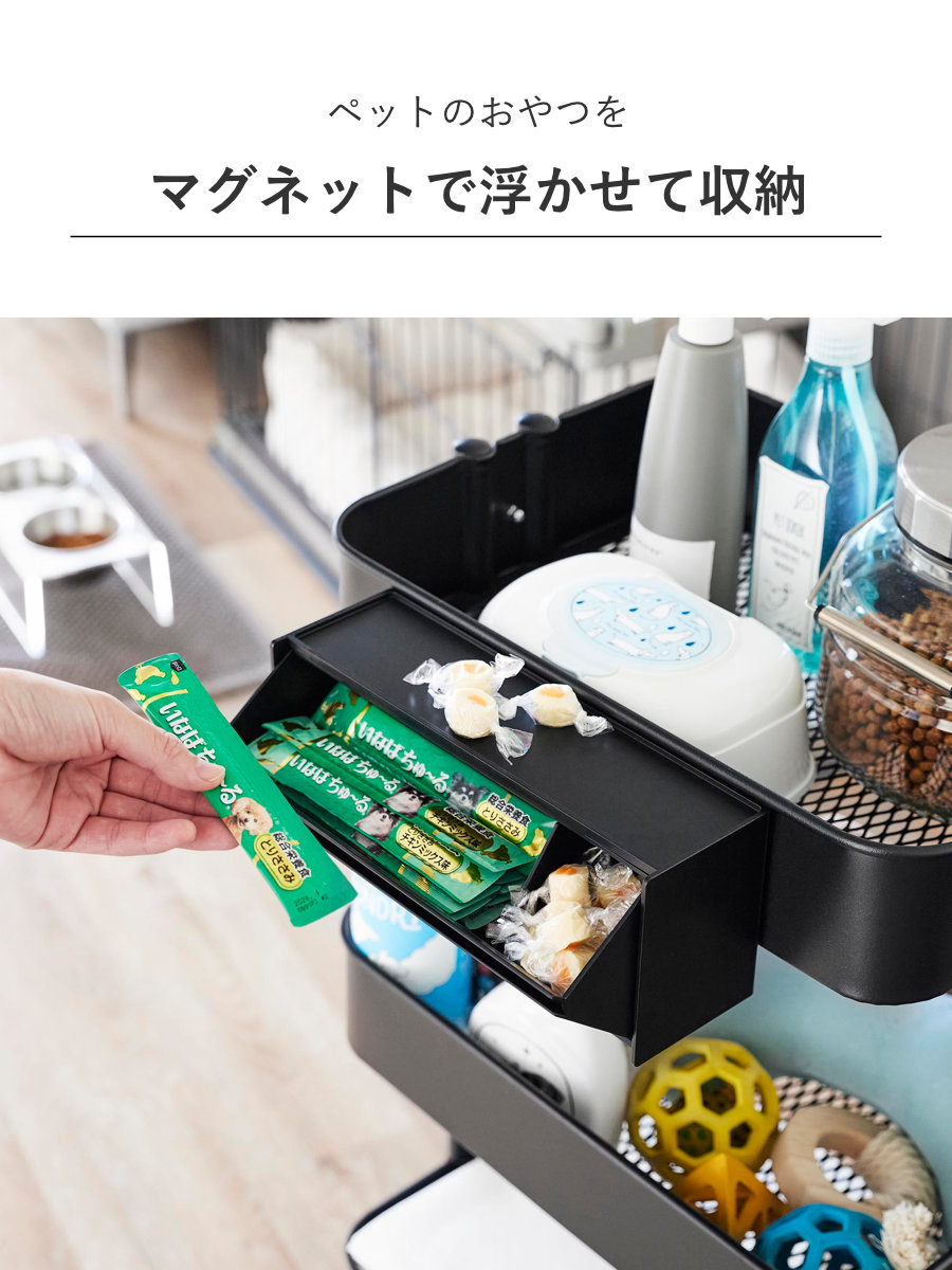 マグネットで取り付けできるペットのおやつ収納ケースです。冷蔵庫やキッチンパネルはもちろん、ペット用品をまとめたマグネットが付くスチールワゴンの側面に設置するのもおすすめです。おやつを浮かせて収納できるのでいたずら防止にもなります。