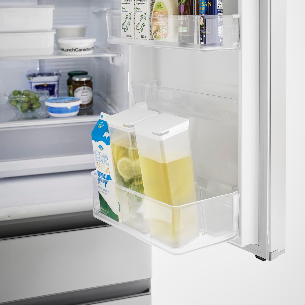 冷蔵庫のポケットに収納しやすいスリムで四角い形状です。冷蔵庫のドア開閉時も、水はね防止フィルターを蓋に取り付けることで水はねを防止します。