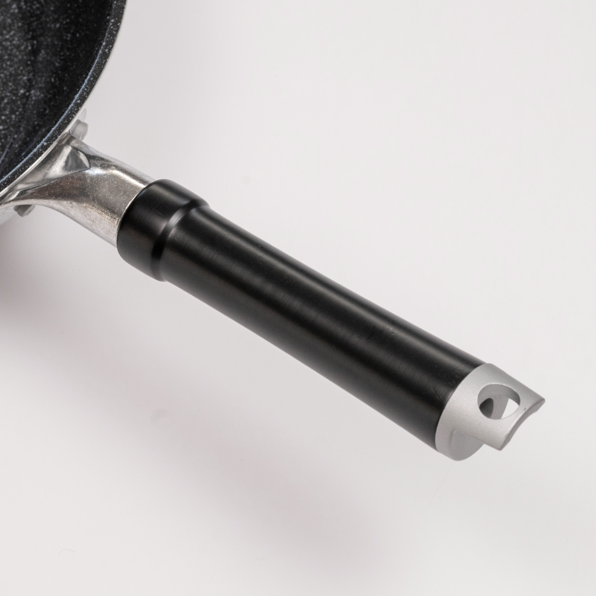 スタイリッシュな雰囲気の黒い木製ハンドルです。熱くなりにくく、しっかり握れます。