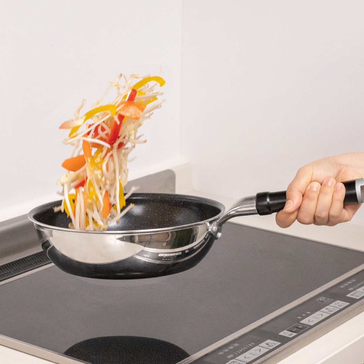 底面は分厚い作りになっているため、熱によって変形しにくく、フライパンが長持ちします。IHでの高温調理でも安心して使える設計です。