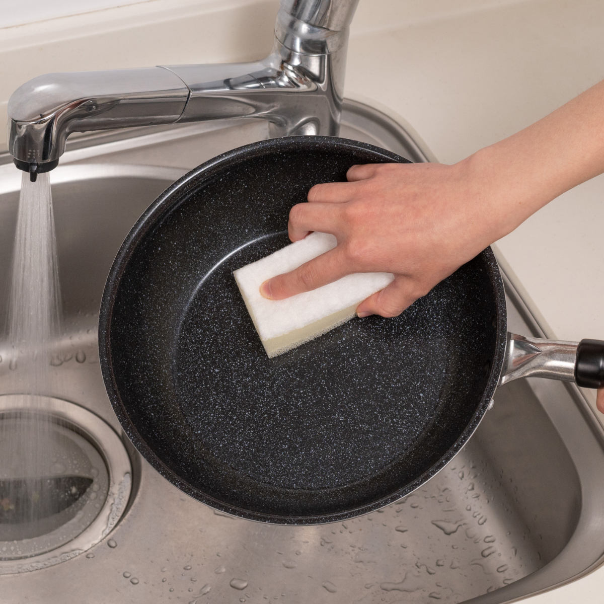 内面は、焦げ付きにくくキズがつきにくいマーブルセラミックコーティングです。汚れが落ちやすく、お手入れが簡単です。