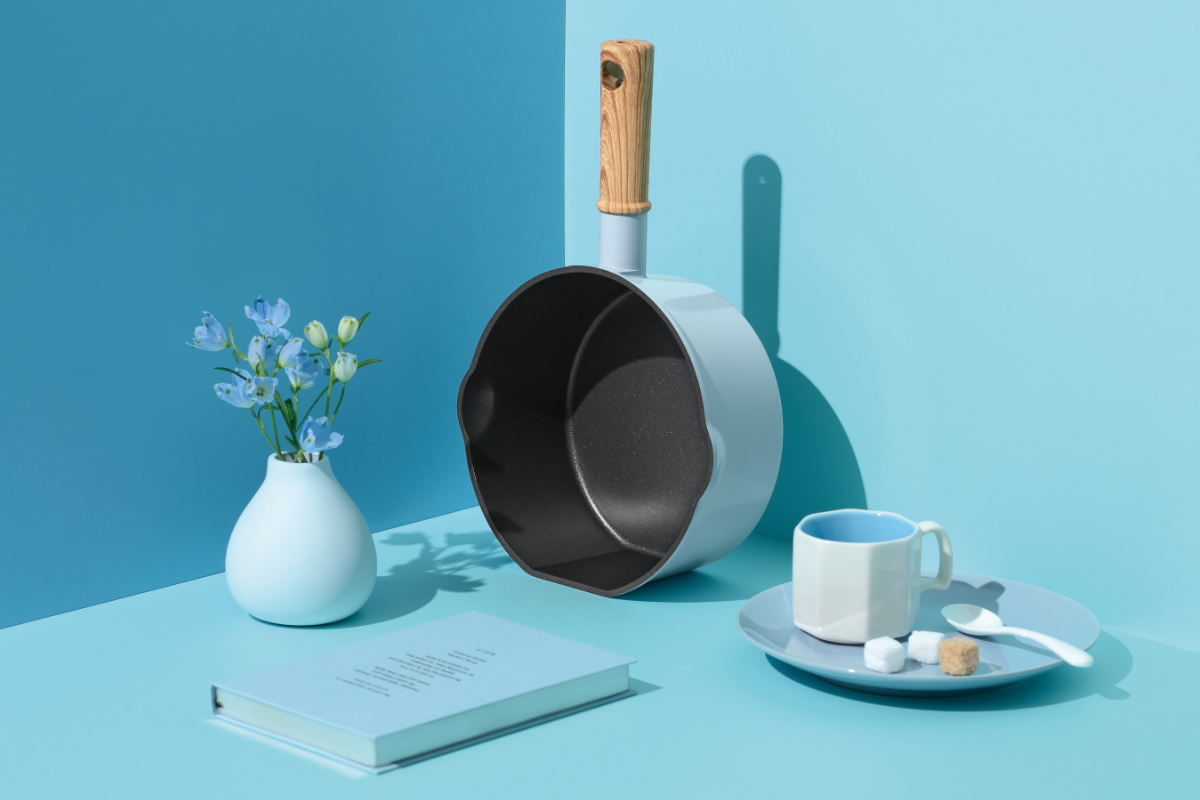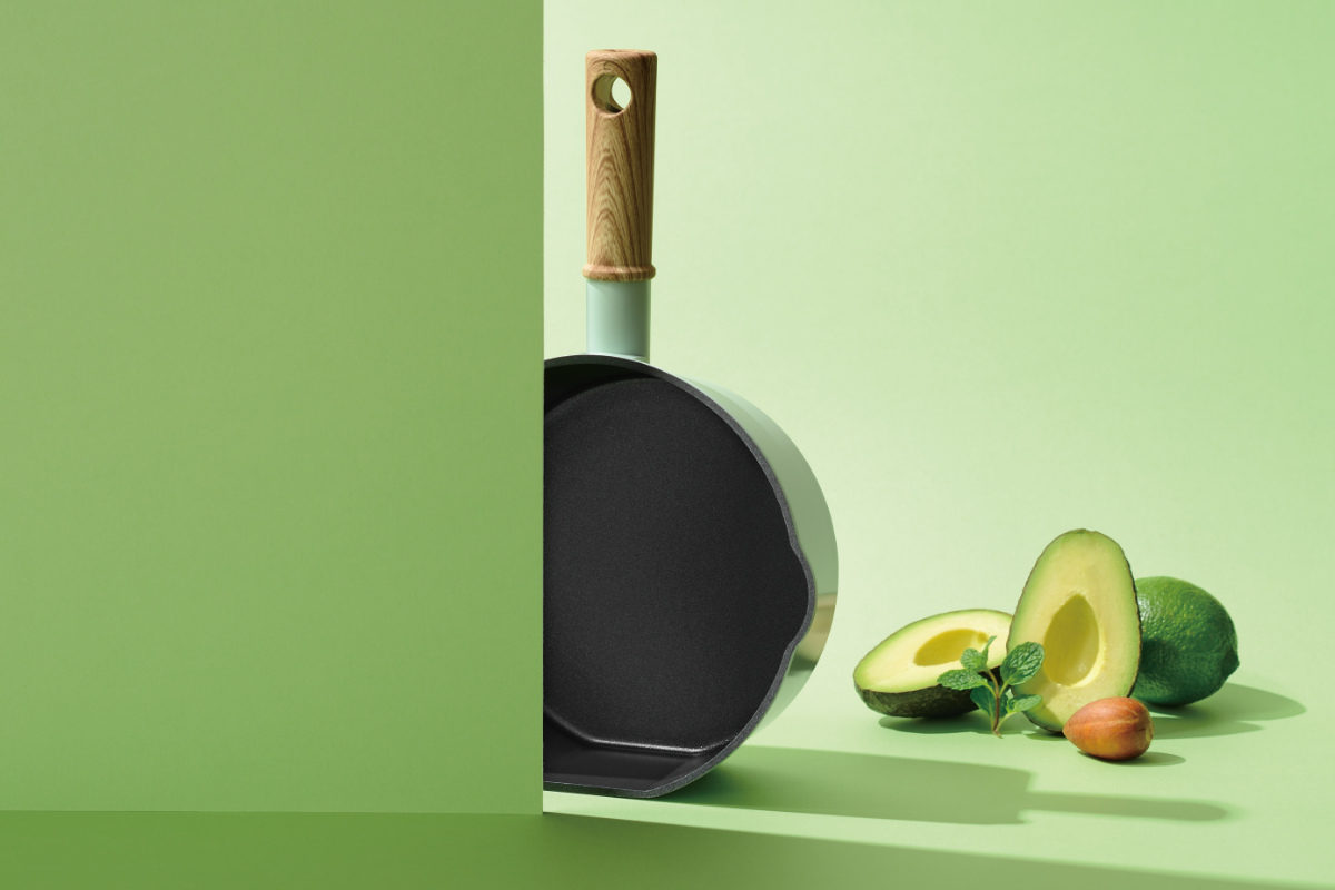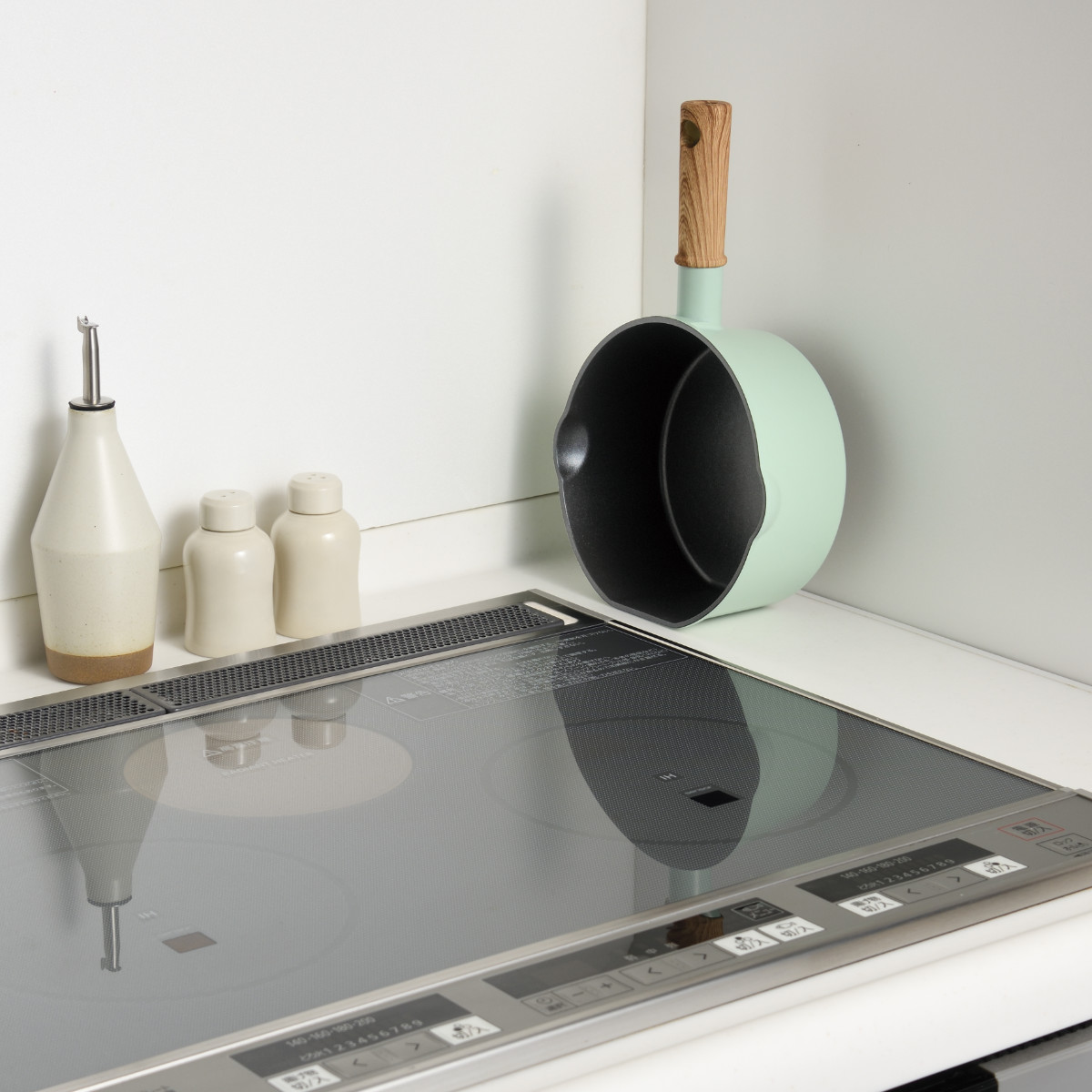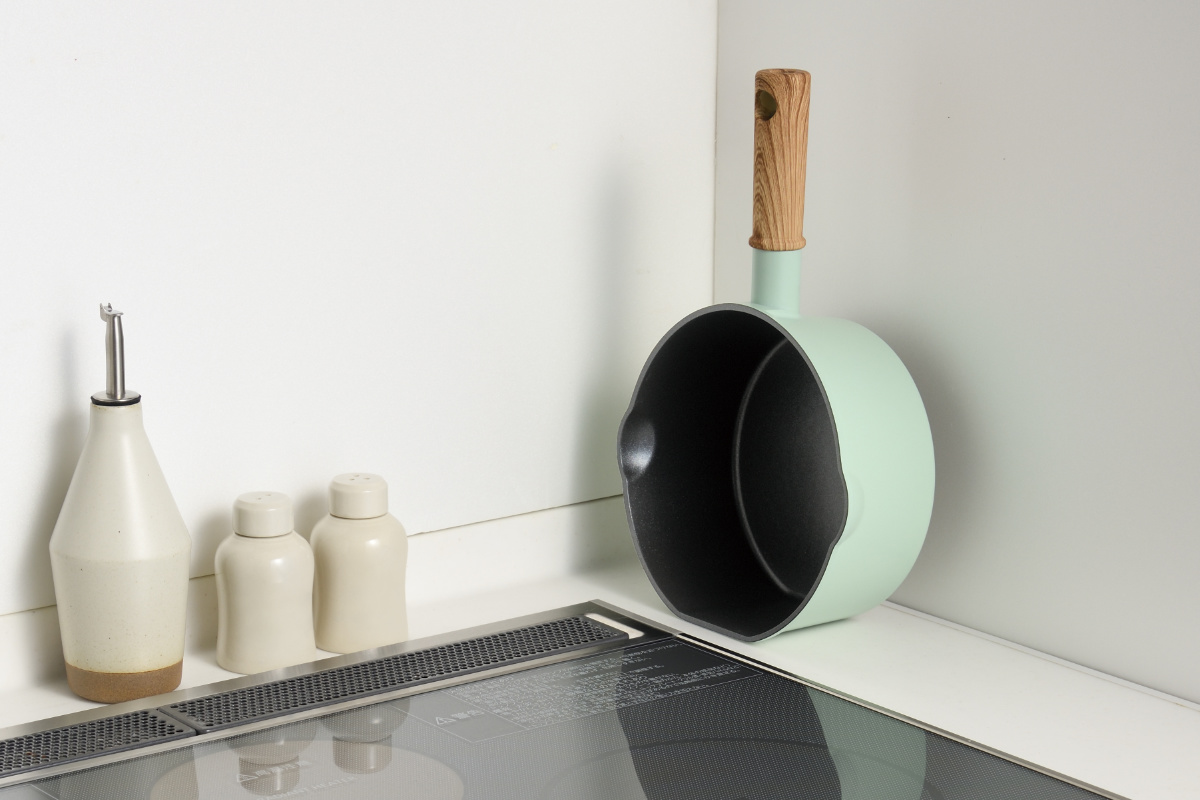 ふんわりやさしいカラーのフライパンは、出しっぱなしでもインテリア雑貨のように、さまざまなキッチンに馴染みます。