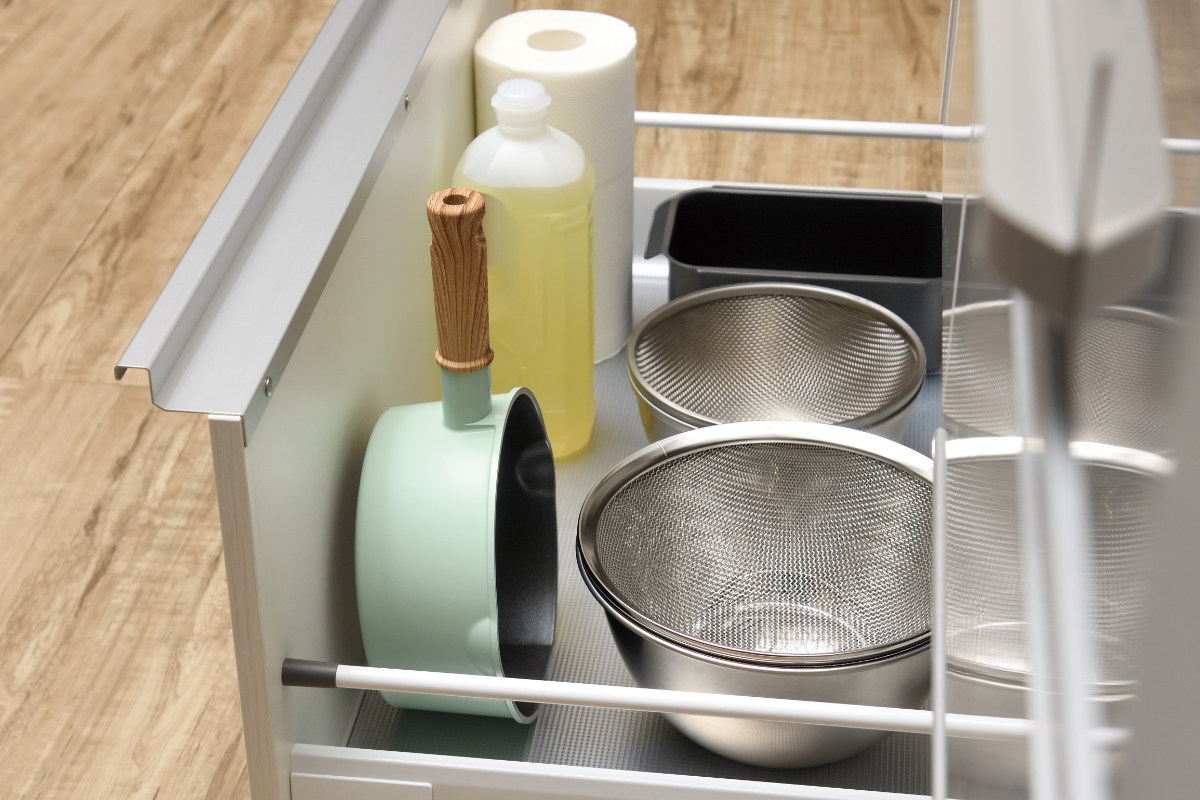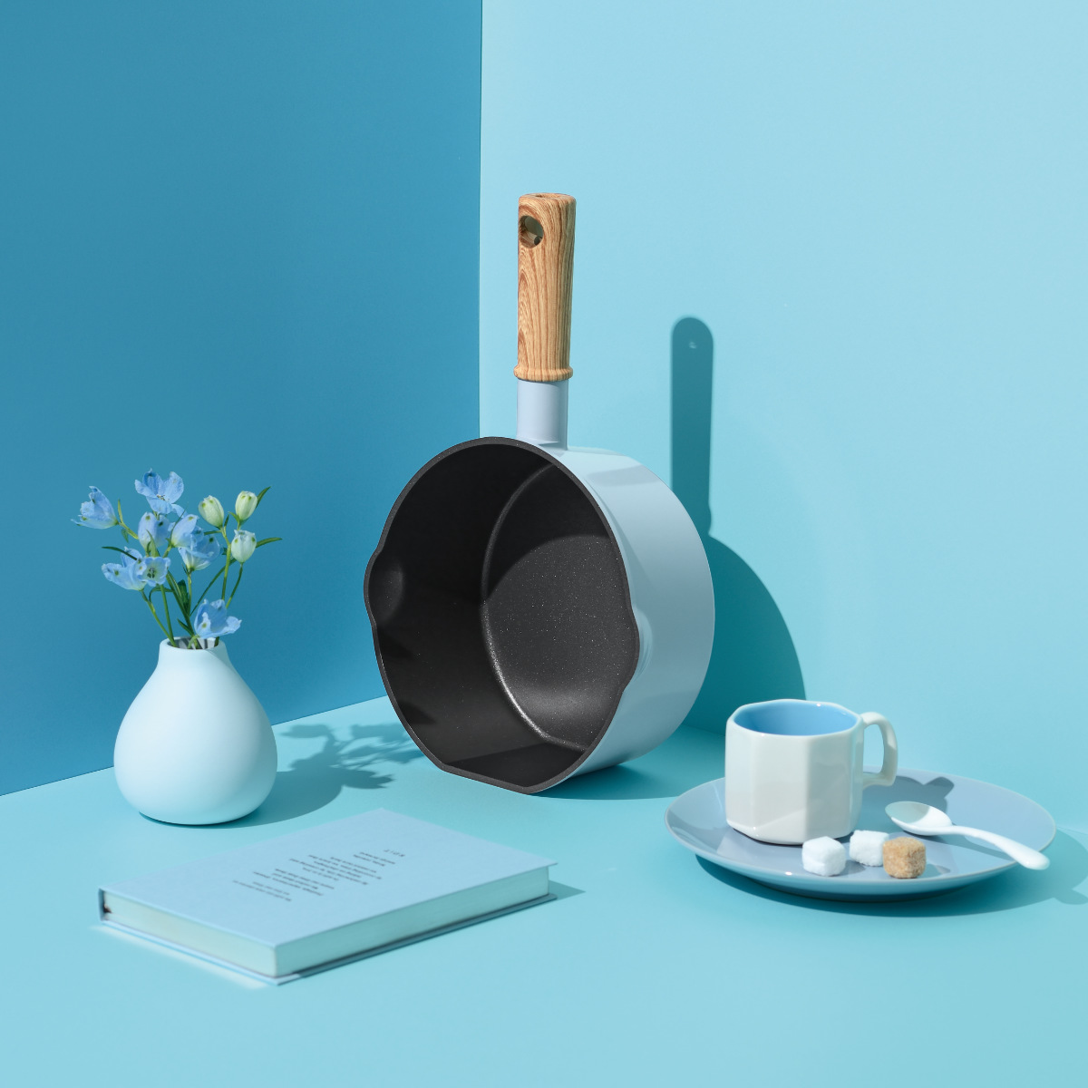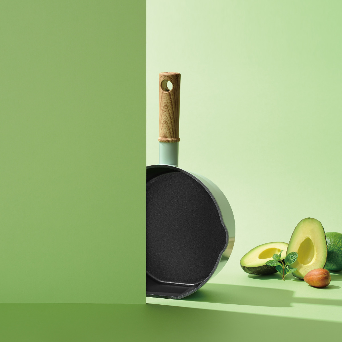 ふんわりやさしいカラーのフライパンは、出しっぱなしでもインテリア雑貨のように、さまざまなキッチンに馴染みます。