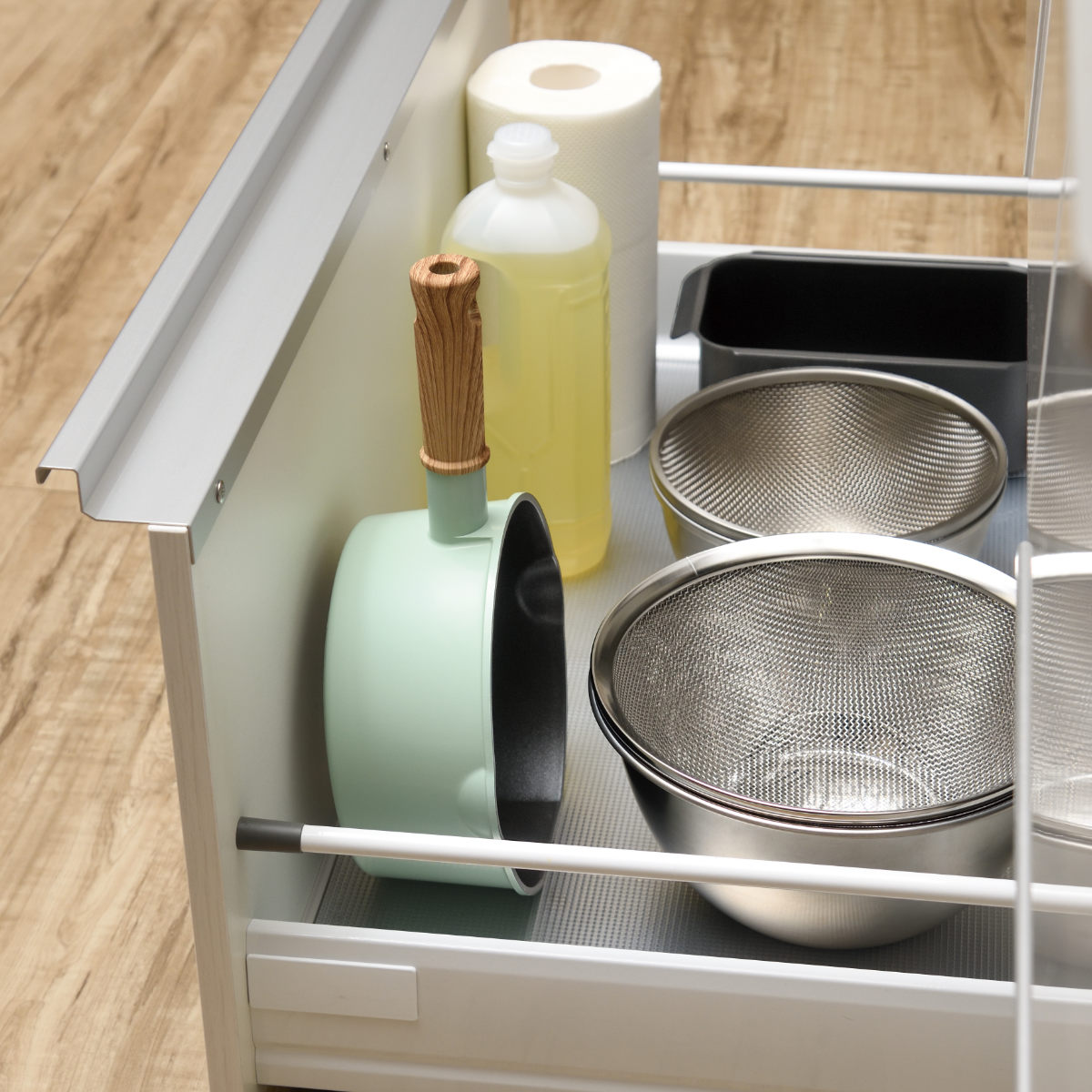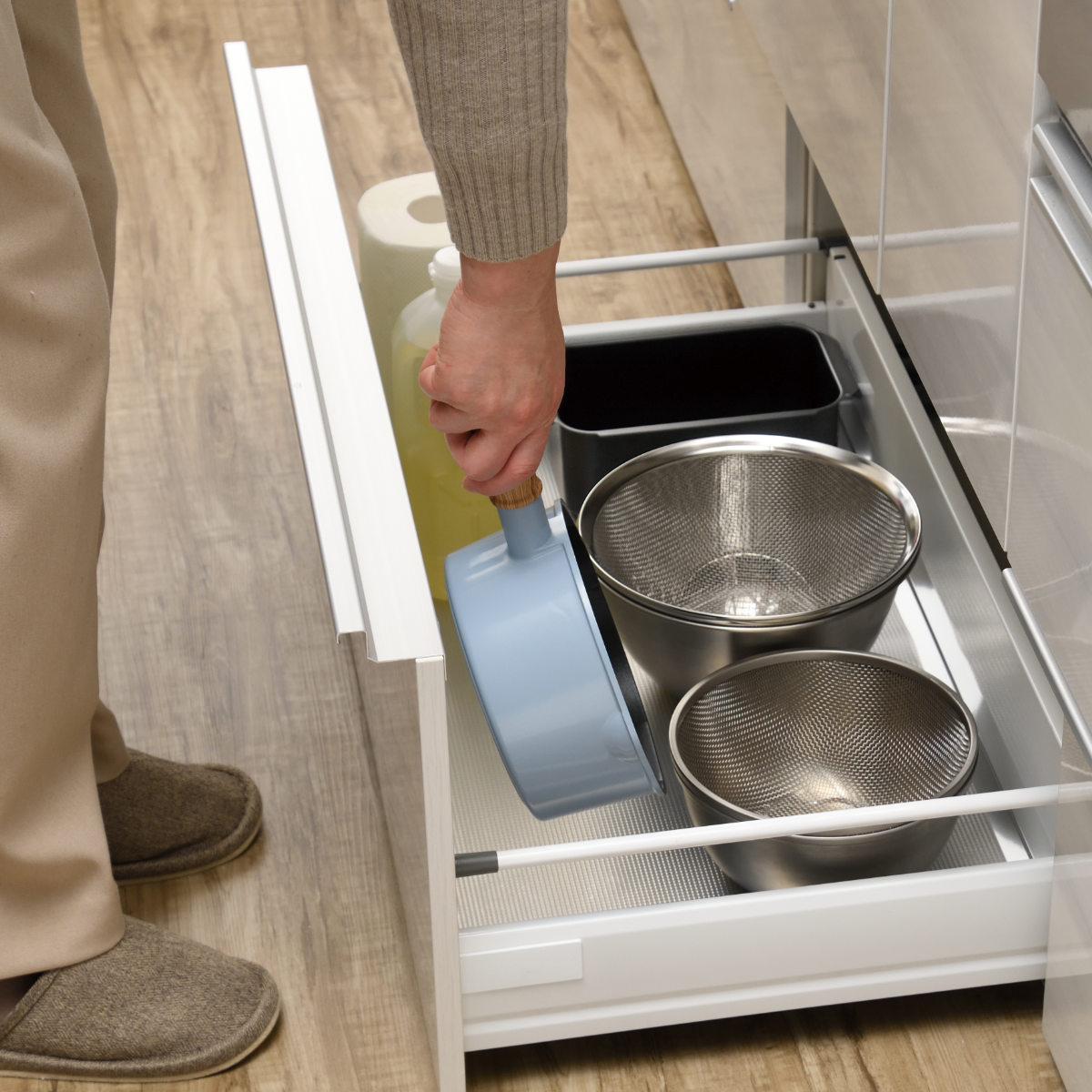 自立するので収納グッズがなくてもそのまま立てて収納できます。開き扉タイプの収納や引き出し収納、さまざまな場所にスッキリ収まります。立て置きすることでサッと手に取ることができ、かがまずラクに取り出せるのも嬉しいポイントです。