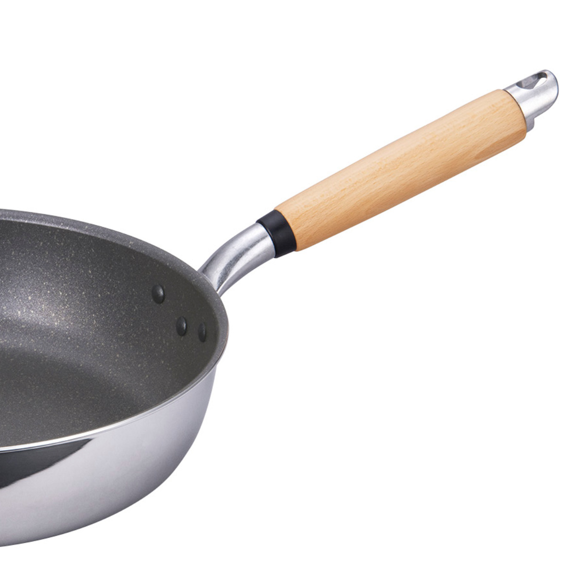 | 材質 | 本体:アルミニウム合金 内面:ふっ素樹脂加工(ダイキンのシルクウェアSD) 外面:ミラー仕上げ 底面:ステンレス板圧着 取っ手:天然木 |