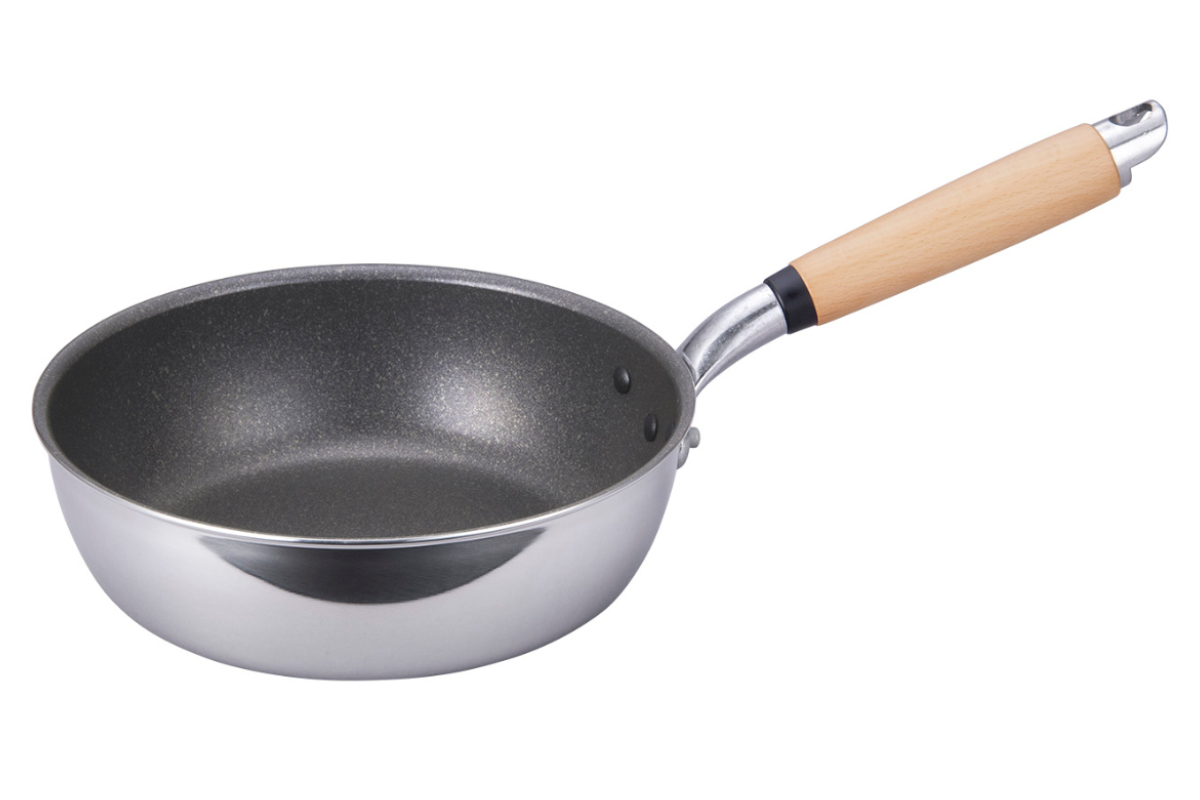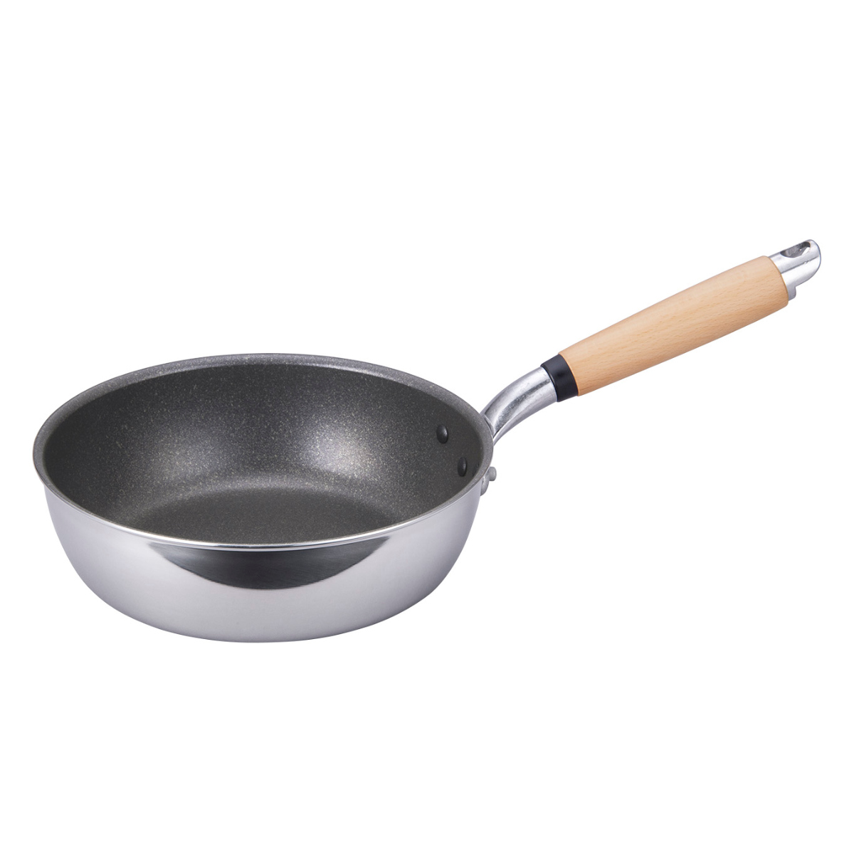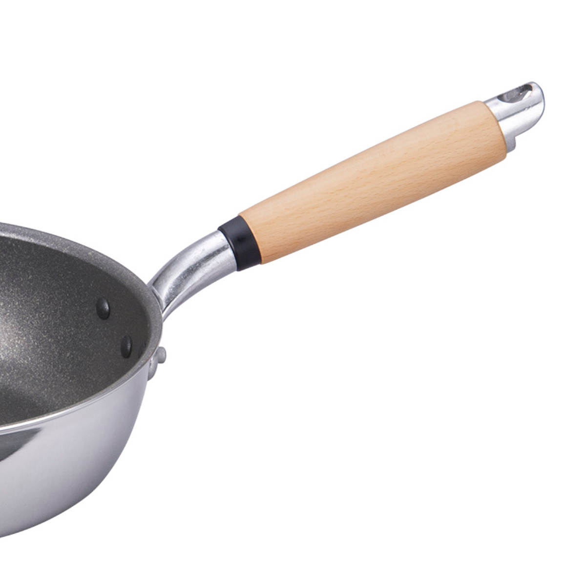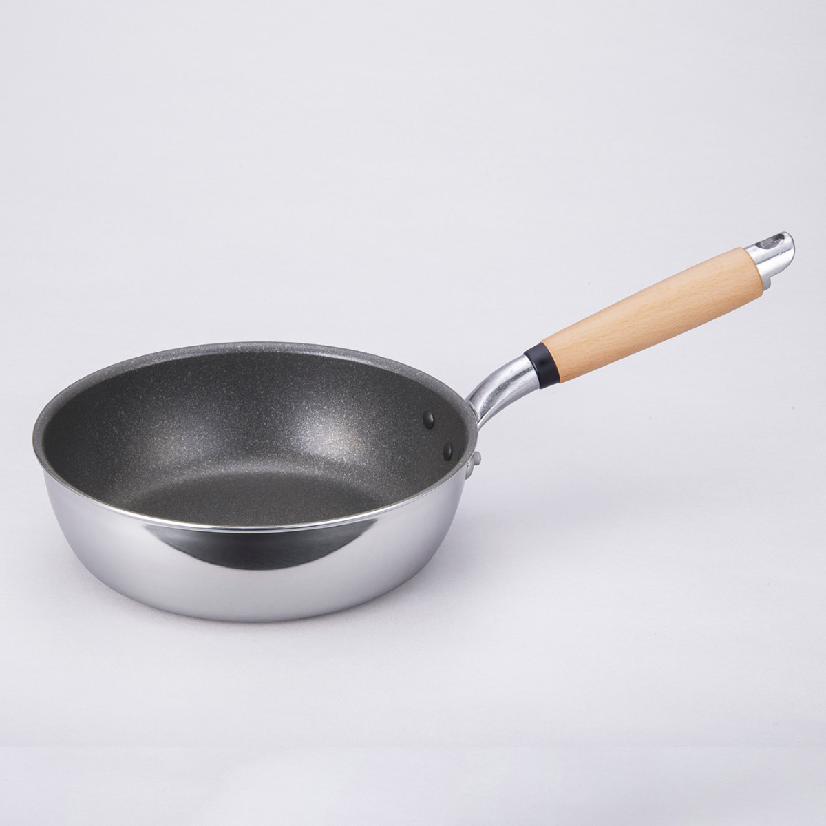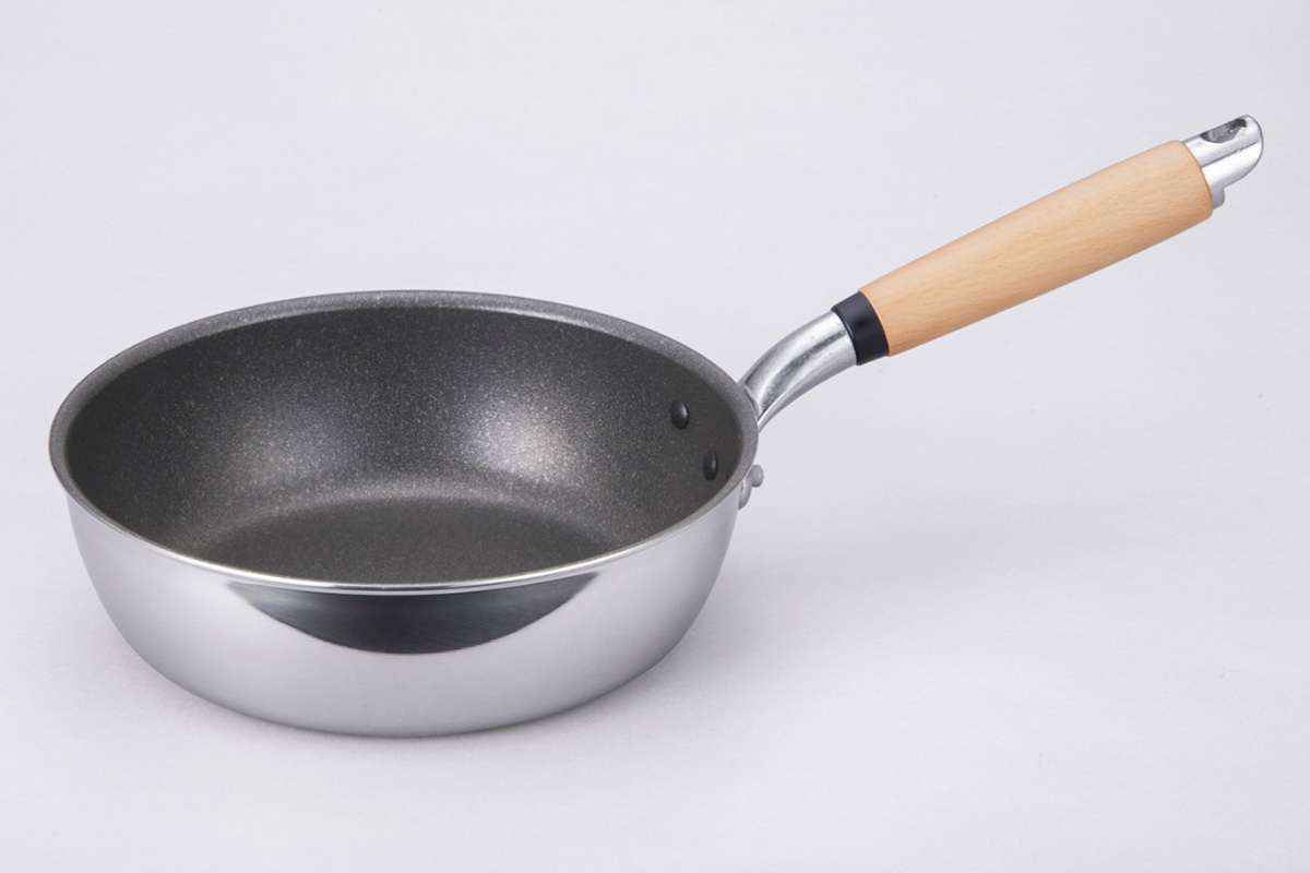 | 材質 | 本体:アルミニウム合金 内面:ふっ素樹脂加工(ダイキンのシルクウェアSD) 外面:ミラー仕上げ 底面:ステンレス板圧着 取っ手:天然木 |