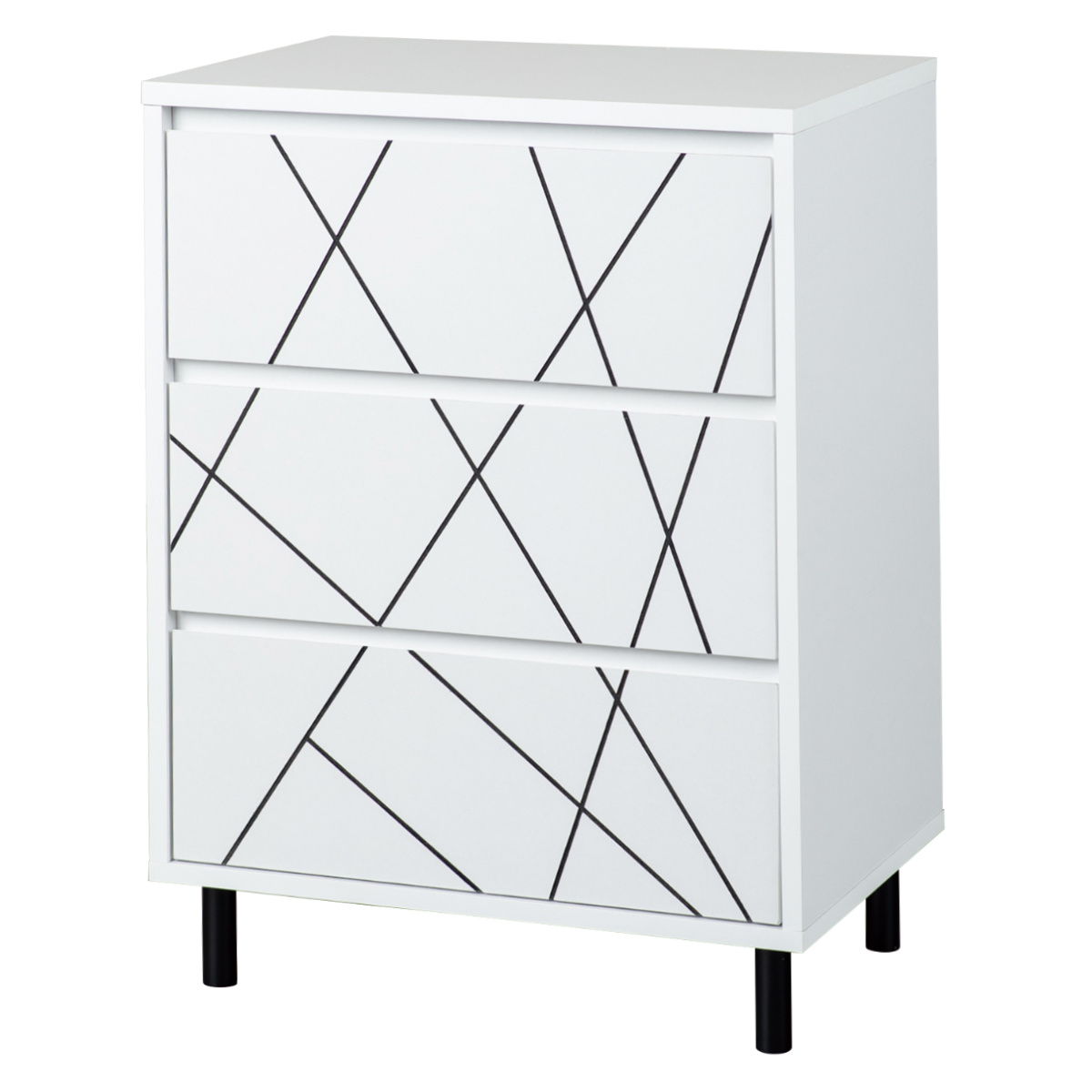 お部屋に取り入れやすい白×黒の幾何学模様がアクセントになっています。脚付きのスッキリとしたデザインなので、空間を広く見せてくれます。デザイン性と、開閉スムーズな引出しなど実用性も持ち合わせた収納家具です。