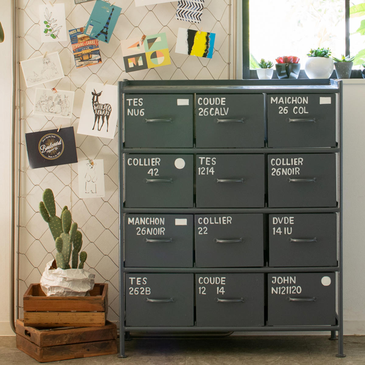 無骨な質感がかっこいいスチールチェストです。カジュアルなナンバーペイントがアクセントになっています。インダストリアルやブルックリンスタイルのインテリアとよく馴染むデザインです。天板に小物を飾ってディスプレイも楽しめます。