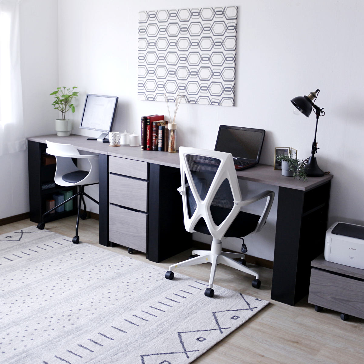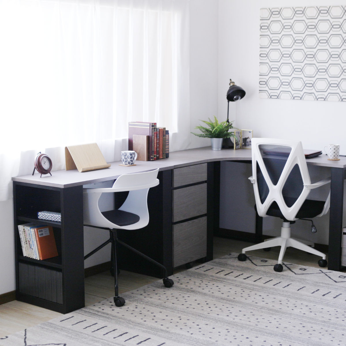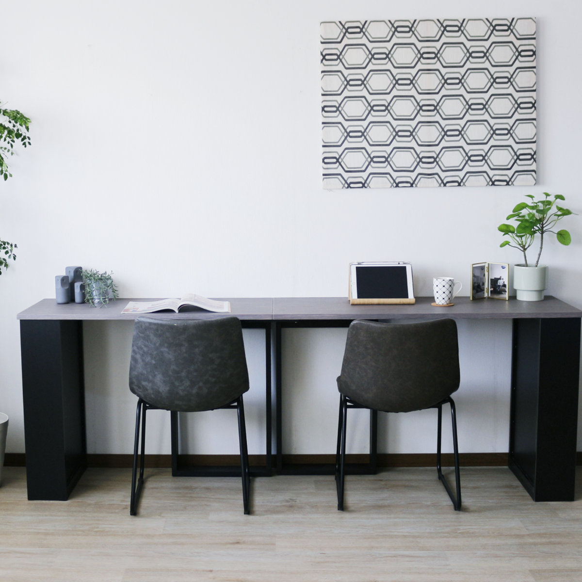 別売りのジョイント板を使用し、幅100cmと120cmのデスクを横並びやL字にジョイントすることができます。