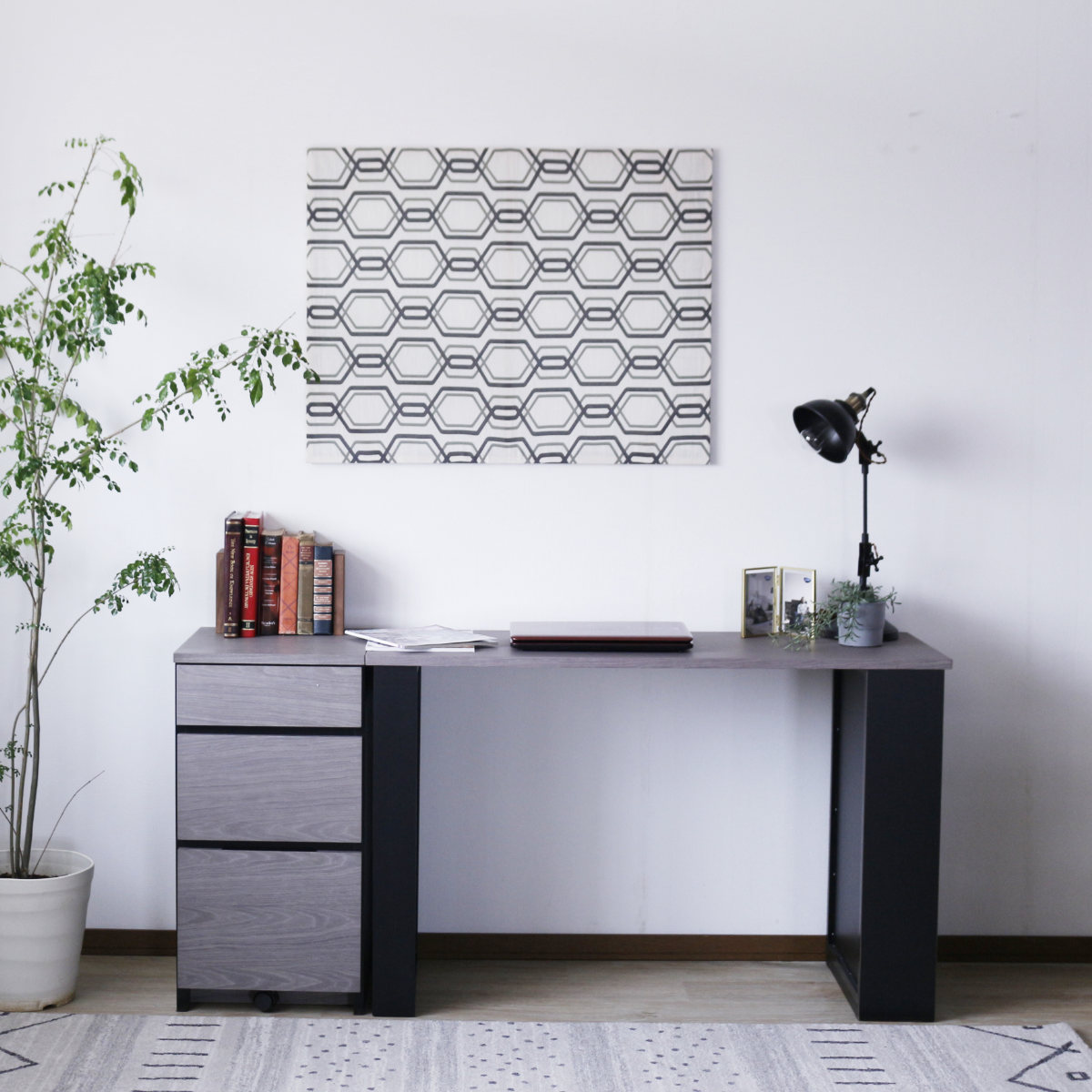 グレー×ブラックでモダンな雰囲気に仕上げた幅120cmのデスクです。シンプルで使いやすくお部屋の間取りや用途に合わせて組み合わせられる、デザイン性と機能性を兼ね備えています。左右にしっかりスペースが取れ、ゆったり作業することができます。