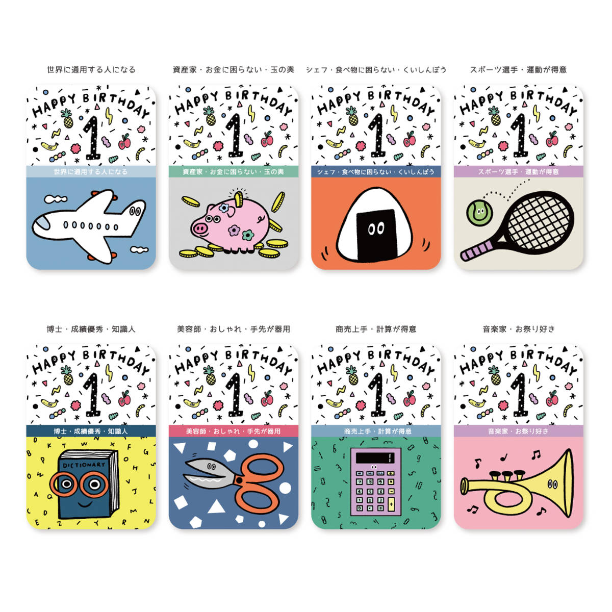 1歳の誕生日パーティーや記念撮影のための選び取り専用カードです。8種類のバリエーションを揃えました。イラストレーター茂刈恵さんとのコラボデザインです。