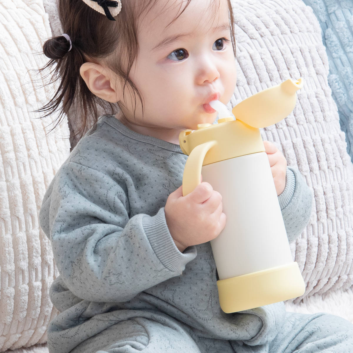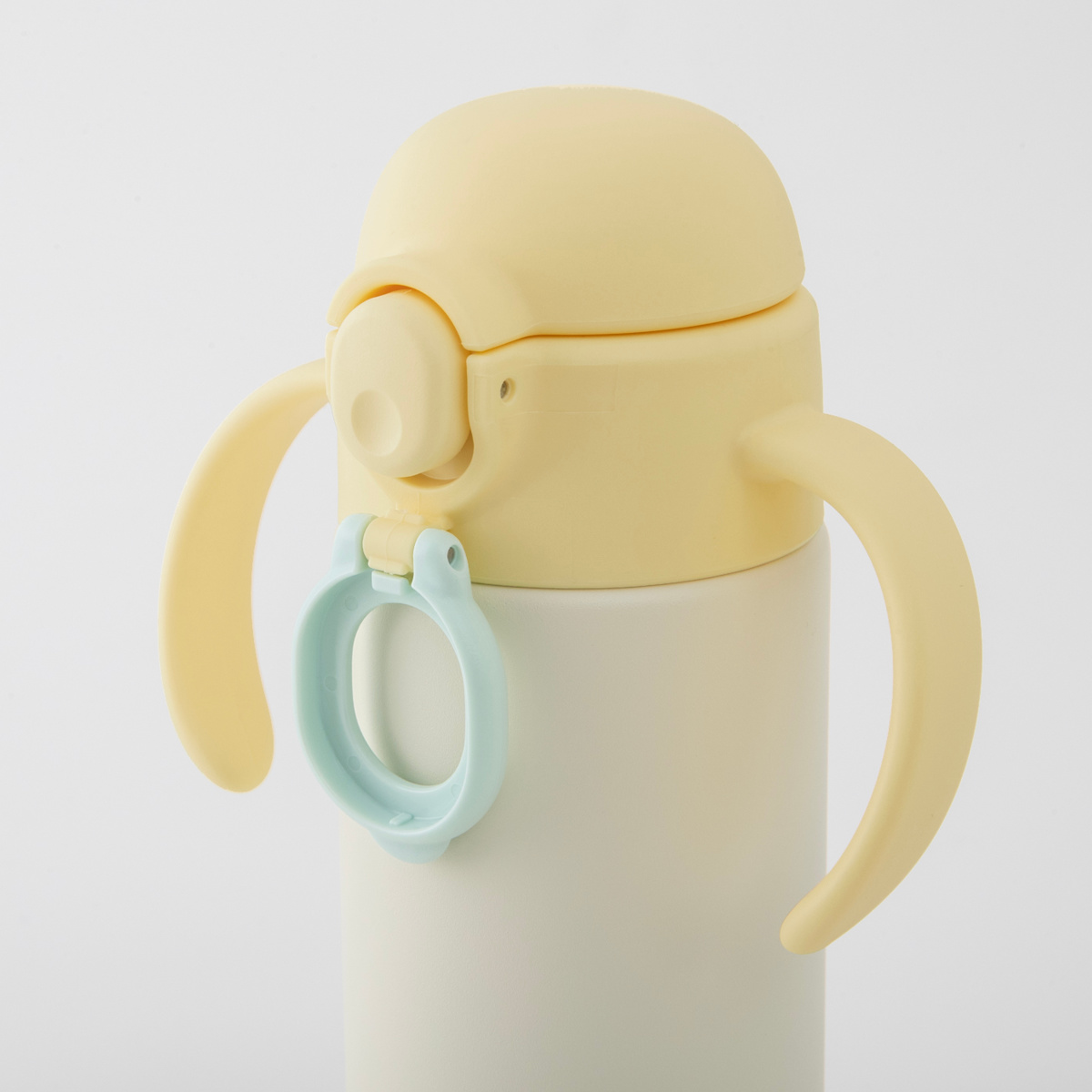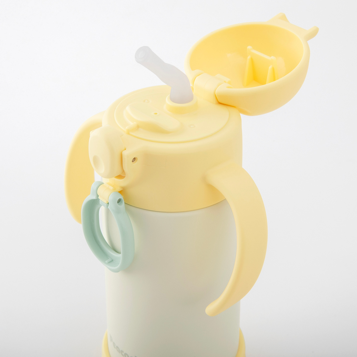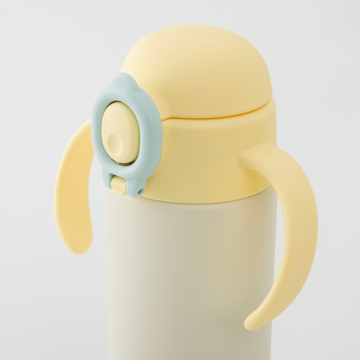 小さなお子様が握りやすい幅とカーブのハンドル付きです。さらに、ハンドルを前方に傾けることで、お子様が自然に飲み口を口元に運べるよう、動きをサポートする設計になっています。
