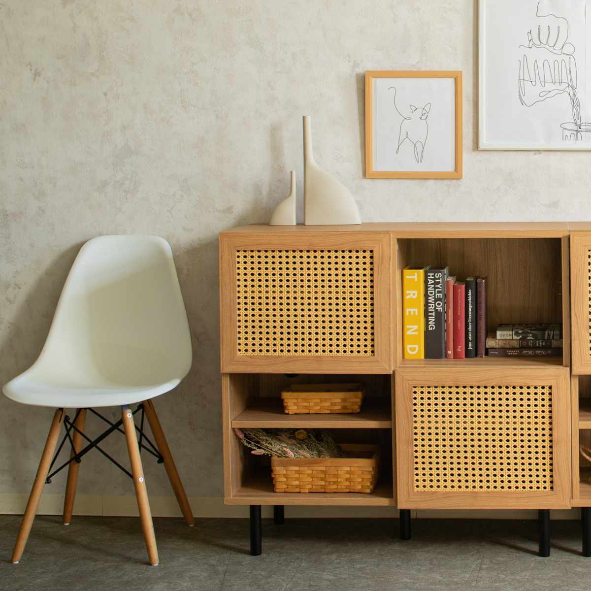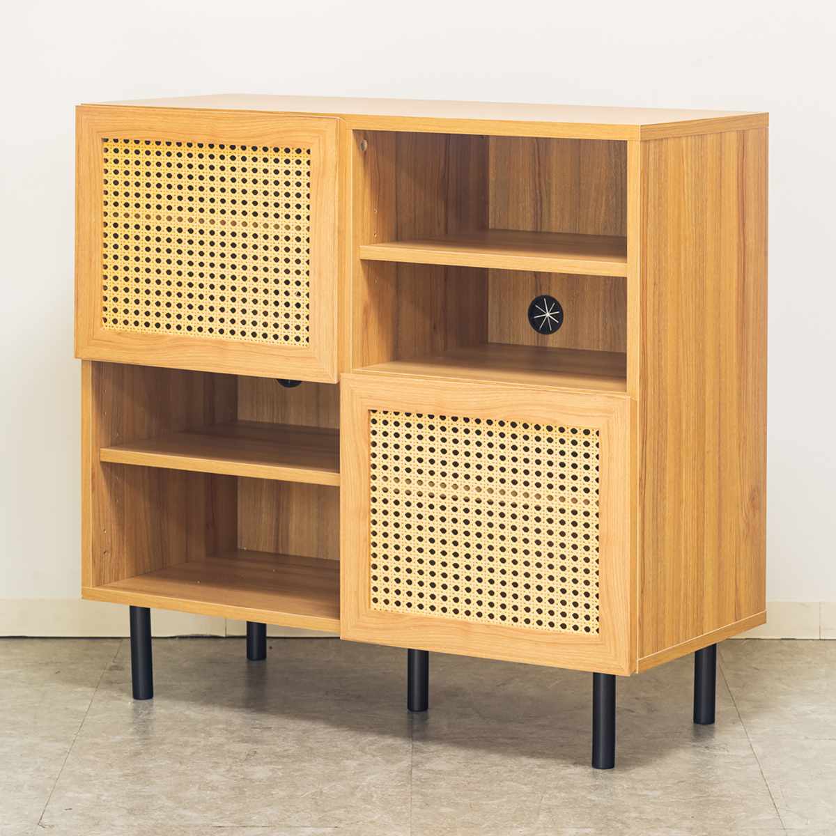 「マルシェ」シリーズのキャビネットです。ナチュラルな木目柄に、ラタン調のかごめ編みの扉が付いたかわいらしい韓国風デザインです。黒脚とのコントラストがアクセントになっています。